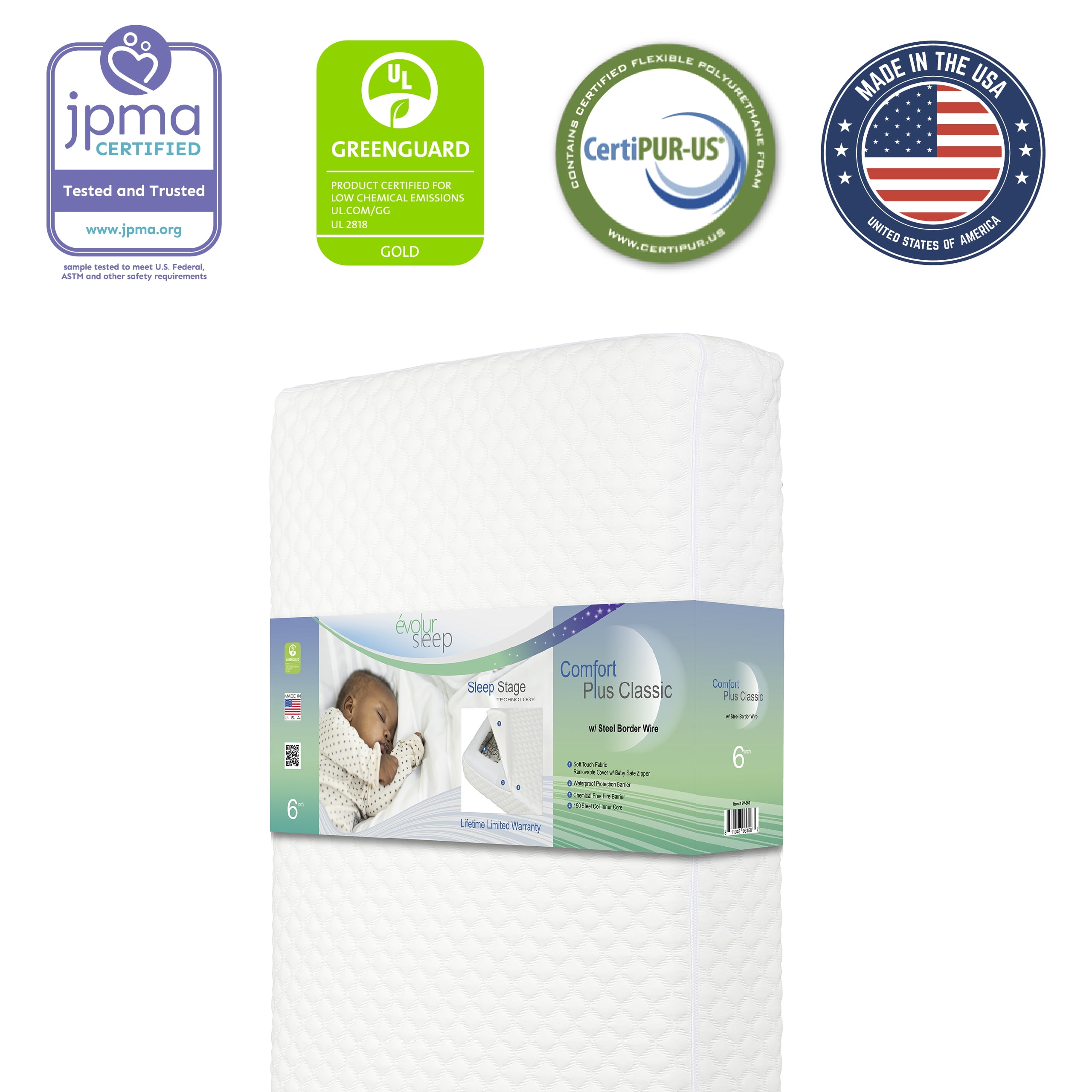 evolur Sleep innerspring mattress provides the support babies and toddlers need for a good night’s sleep. Our stage sleep technology mattress inner core is constructed with extra firm 150 heavy-duty interlocking, soft-touch fabric with inverted seams and a waterproof protection barrier. This mattress is topped with insulated layer foam for ultimate comfort. evolur stage technology mattress is built to fit both a standard full-size crib and toddler bed.