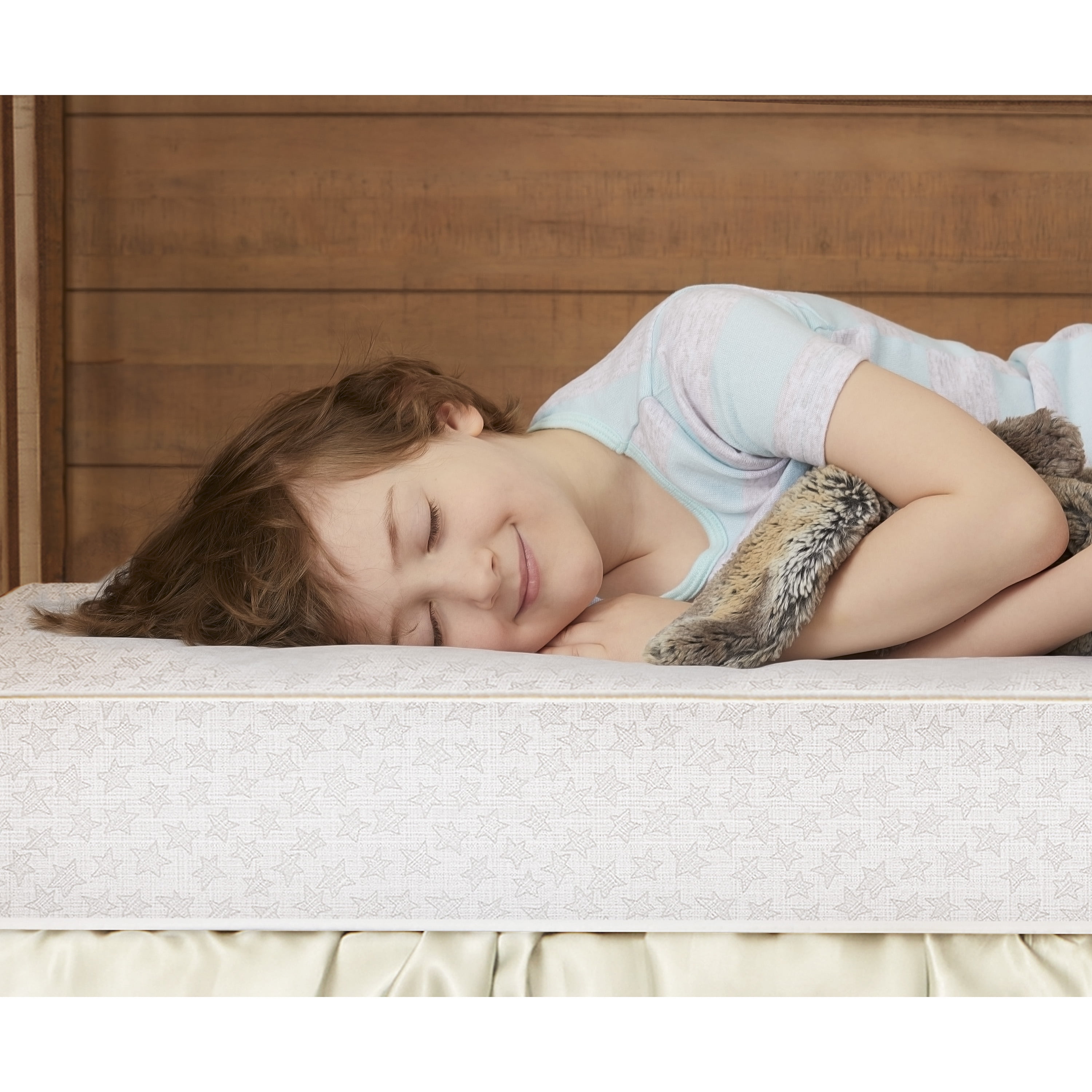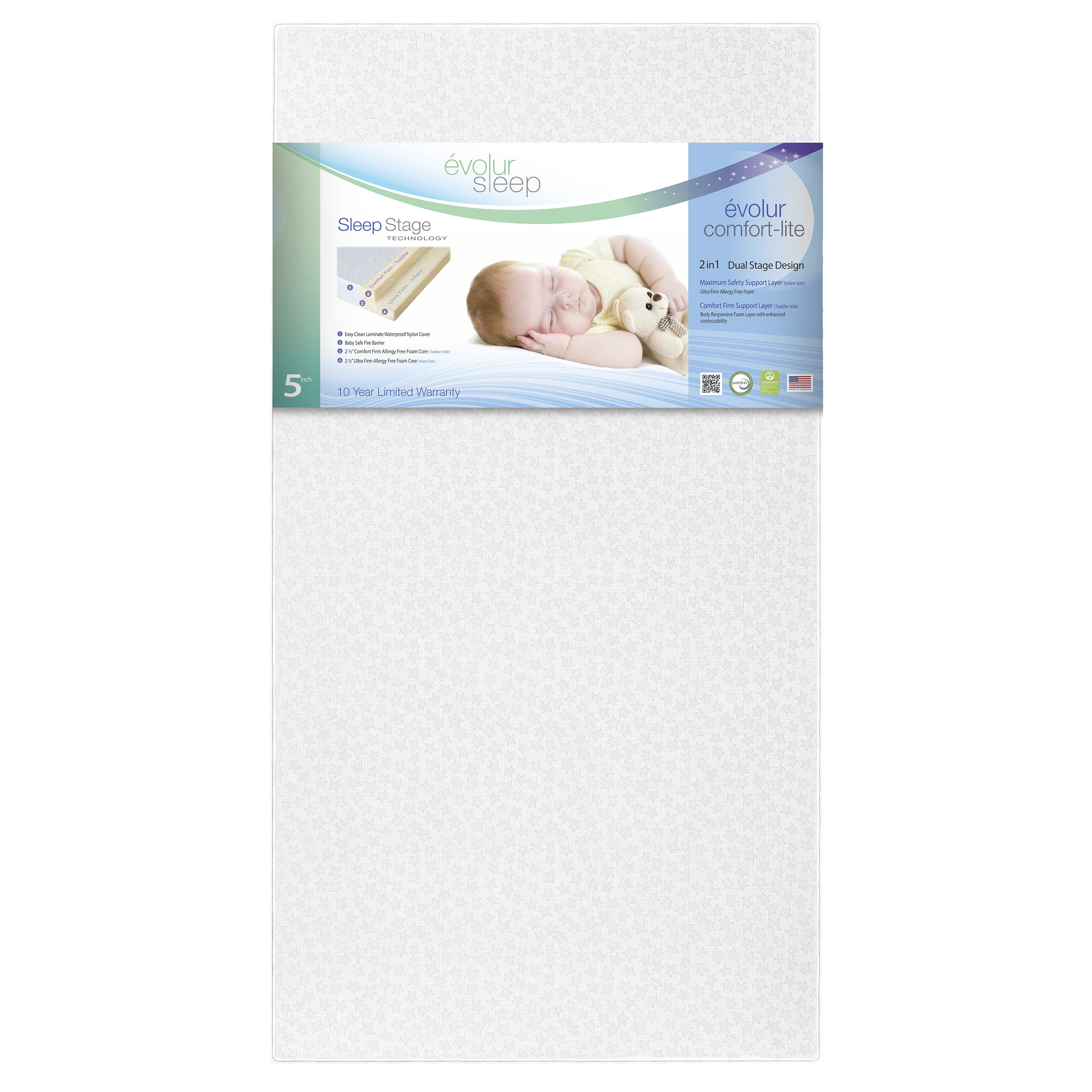Evolur Sleep Dual Stage Comfort-Lite 5″ Foam Crib and Toddler Mattress, Silver Star: Cover: Silver Star vinyl laminate cover with soft cloth binding keeps liquids, bacteria, bed bugs and dust mites out yet allows air to flow in Inner layers: 2-1/2″ Ultra Firm CertiPUR-US Certified Foam Infant Side, 2-1/2″ Comfort Support CertiPUR-US Certified Foam Toddler Side Dimensions: 52-1/2″ x 27-1/2″ x 5″ Warranty: 30 Day to factory defects CertiPUR-US approved foam analyzed by independent testing laboratories for content emissions and durability All Evolur mattresses are GREENGUARD Gold Certified for a healthy indoor environment for your baby JPMA certified to meet or exceed all safety standards set by the CPSC and ASTM. Questions about product recalls? Items that are a part of a recall are removed from the site, and are no longer available for purchase. These items include items only, not those of Marketplace sellers. Customers who have purchased a recalled item will be notified by email or by letter sent to the address given at the time of purchase. For complete recall information, go to Recalls.