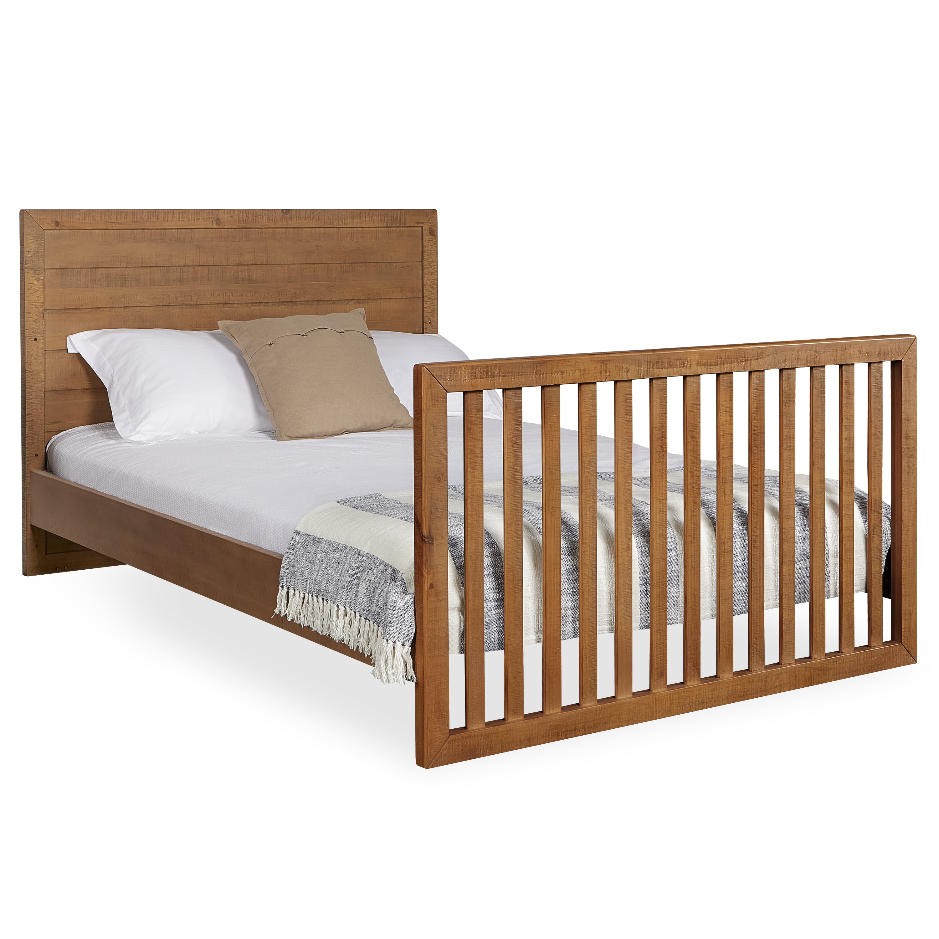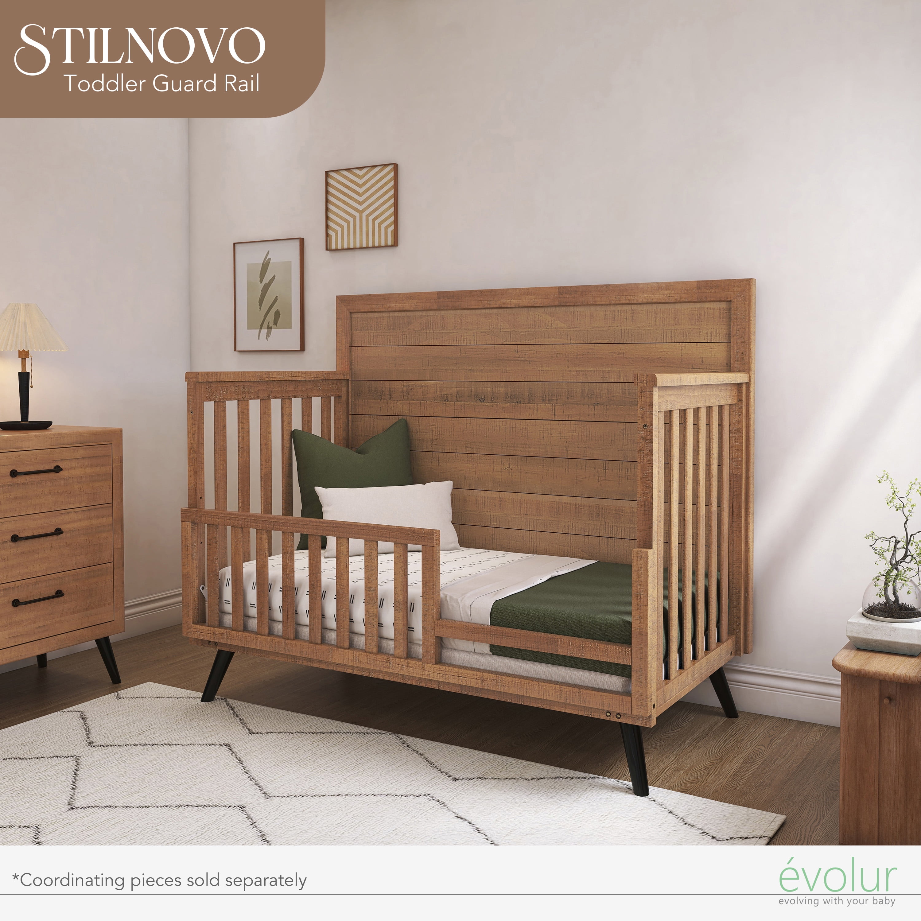 Part of the Evolur Loft Collection, the Stilnovo Mid-Century 4-in-1 Convertible Crib features a clean, minimalistic form that has been inspired by the design aesthetics of the 1950s and 60s. Perfect for fashion-forward parents! Constructed out of solid poplar wood with fine veneers, the Stilnovo is built to last and is truly a lifetime investment. At Evolur, we believe in creating furniture that adapts to your growing child. The Stilnovo Mid-Century 4-in-1 Convertible Crib does exactly that. It features 3 mattress height settings that can be adjusted depending on your child. Set it at its highest setting during the newborn months and lower it as your child starts to pull up and stand. It converts to a toddler bed with our conversion kit (sold separately) and daybed. Add our wooden bed frame (sold separately) to convert it into a full-size bed. The Stilnovo is available in classic Sugar Cane Glazed Brush White, contemporary Windsor Oak Grey and jet Onyx Black finishes that complement any color scheme. At Evolur, safety is always our No.1 priority – This crib is Greenguard Gold certified which means that it has been tested for thousands of chemicals and VOCs and helps in providing a safe and healthy environment for your baby and family. Our cribs are built to the highest safety standards that meet/exceed those set by the CPSC, JPMA, and ASTM. Each of our cribs undergoes rigorous testing by independent laboratories for compliance with all US and Canadian crib regulations. Pick coordinating pieces from our Evolur Stilnovo Nursery Collection like the double dresser and changing tray to create a stunning nursery. Crib dimensions are 56″ L x 30.25″ W x 47″ H and it weighs 85.8 lbs. For the best mattress fit, we recommend any Dream on Me or Evolur standard, full-size, non-toxic, Greenguard certified crib mattress (sold separately).