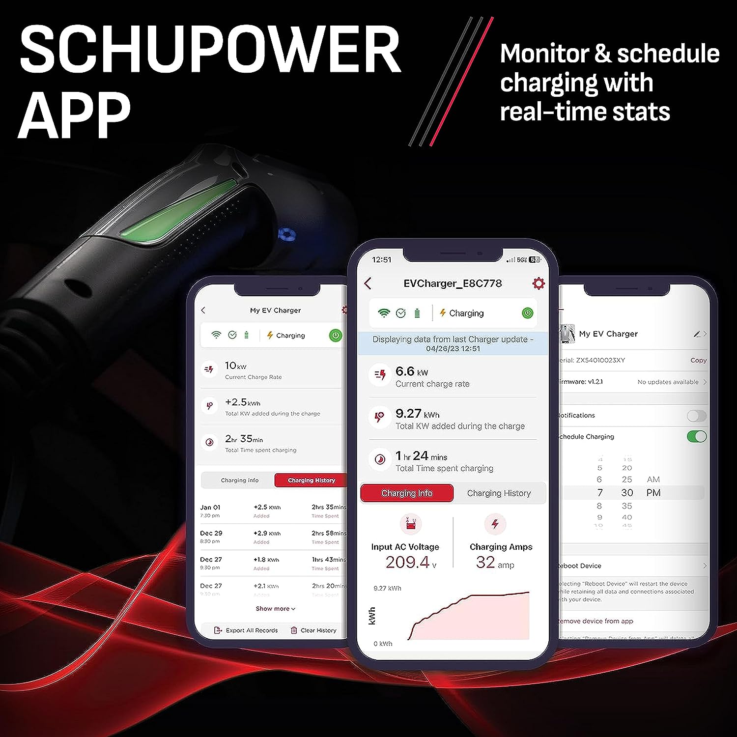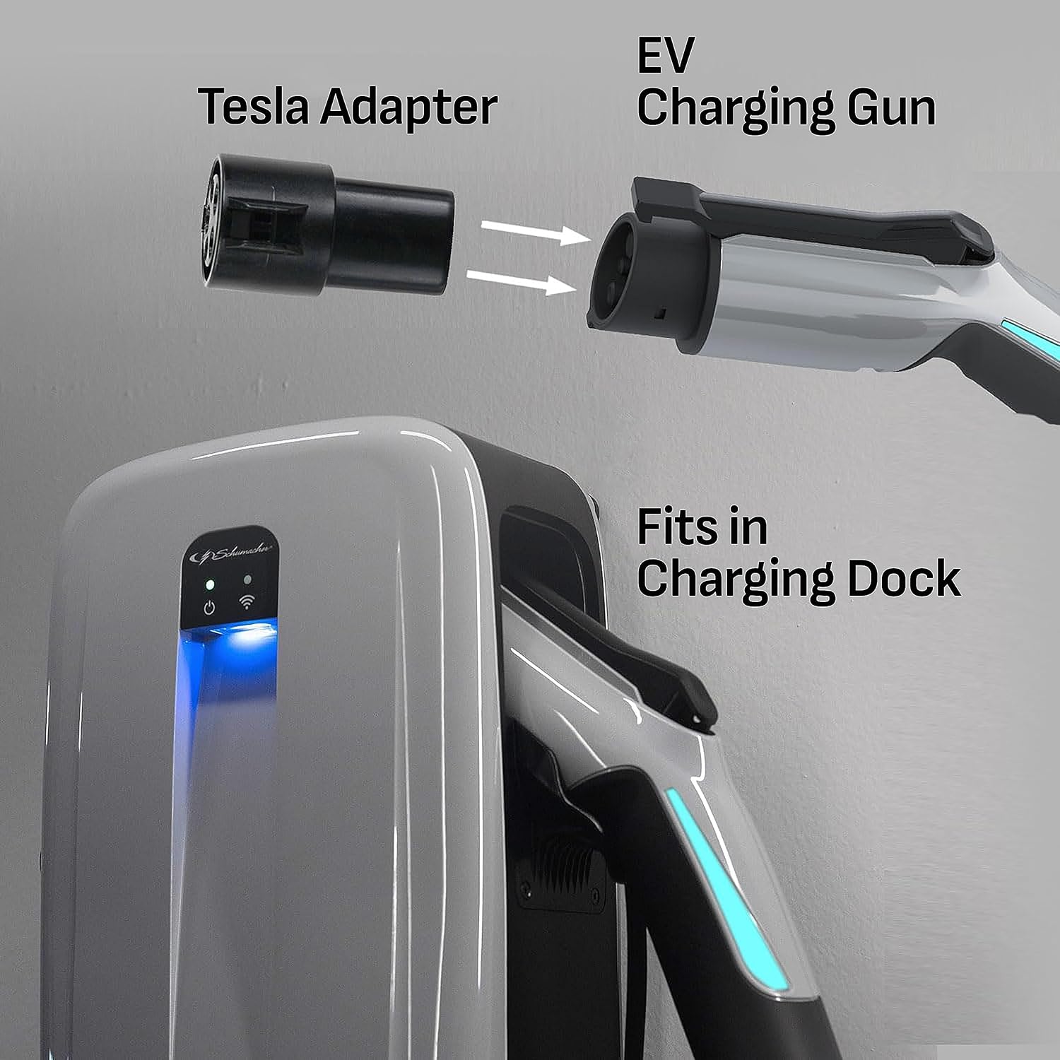 The Schumacher SEV1600HW Hardwired Level 2 EV Wall Charger is the ultimate charging solution for electric vehicle (EV) owners. Enjoy faster charging times and the convenience of charging at home with this advanced unit. With a configurable current up to 50A, this wall charger can charge up to eight times faster than standard Level 1 chargers. The included charging gun features an SAE-J1772 (universal) connector that is compatible with most North American EVs, while Tesla® vehicles may require an adapter (sold separately). Using this charger is a breeze – just plug the charging gun into your EV’s charging port and enjoy automatic charging. With integrated Wi-Fi® and Bluetooth®, you can connect to the SchuPower™ app and schedule charging or monitor charging progress from anywhere. The charger’s low-profile design and built-in cord management, along with the flexible cable cradle, ensure that it won’t take up your garage space or impede your vehicle while pulling in or out. The SEV1600HW also comes with a custom interchangeable dock with dual docking capability, so you can tailor your usage to your needs. The 25-foot long charging cable lets you easily charge your vehicle, whether the charger is installed indoors or outdoors. Upgrade your charging experience with the Schumacher SEV1600HW Hardwired Level 2 EV Wall Charger and power up your EV with ease. The Schumacher SEV1600HW Level 2 EV Wall Charger must be installed by a licensed electrician. Any changes to the wall charger’s electrical settings must also be made by a licensed electrician. Contents include: Schumacher SEV1600HW charging station, output cable with EV charging gun, cable cradle, (2) 5.5 mm (0.22 in.) x 50 mm (2 in.) lag screws for wall mounting, (2) 4 mm (0.16 in.) x 16 mm (0.63 in.) self-tapping screws to attach the cable cradle, mounting template, and user manual.
