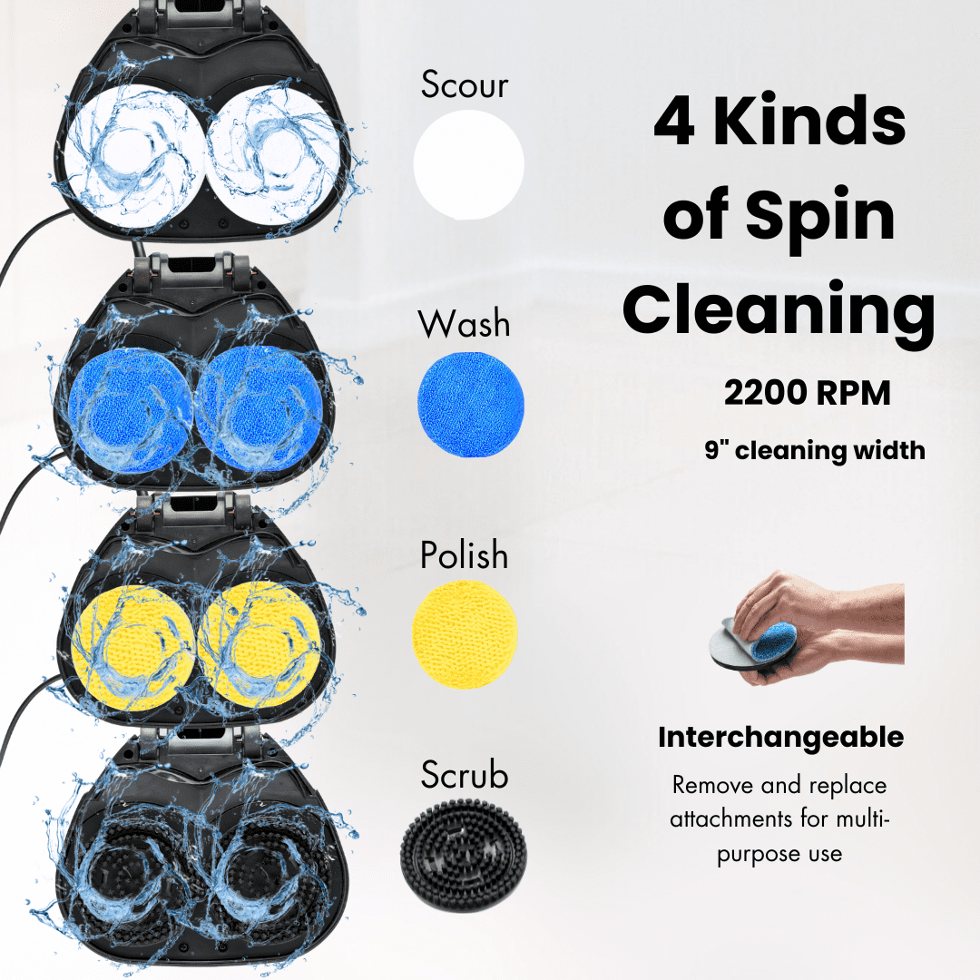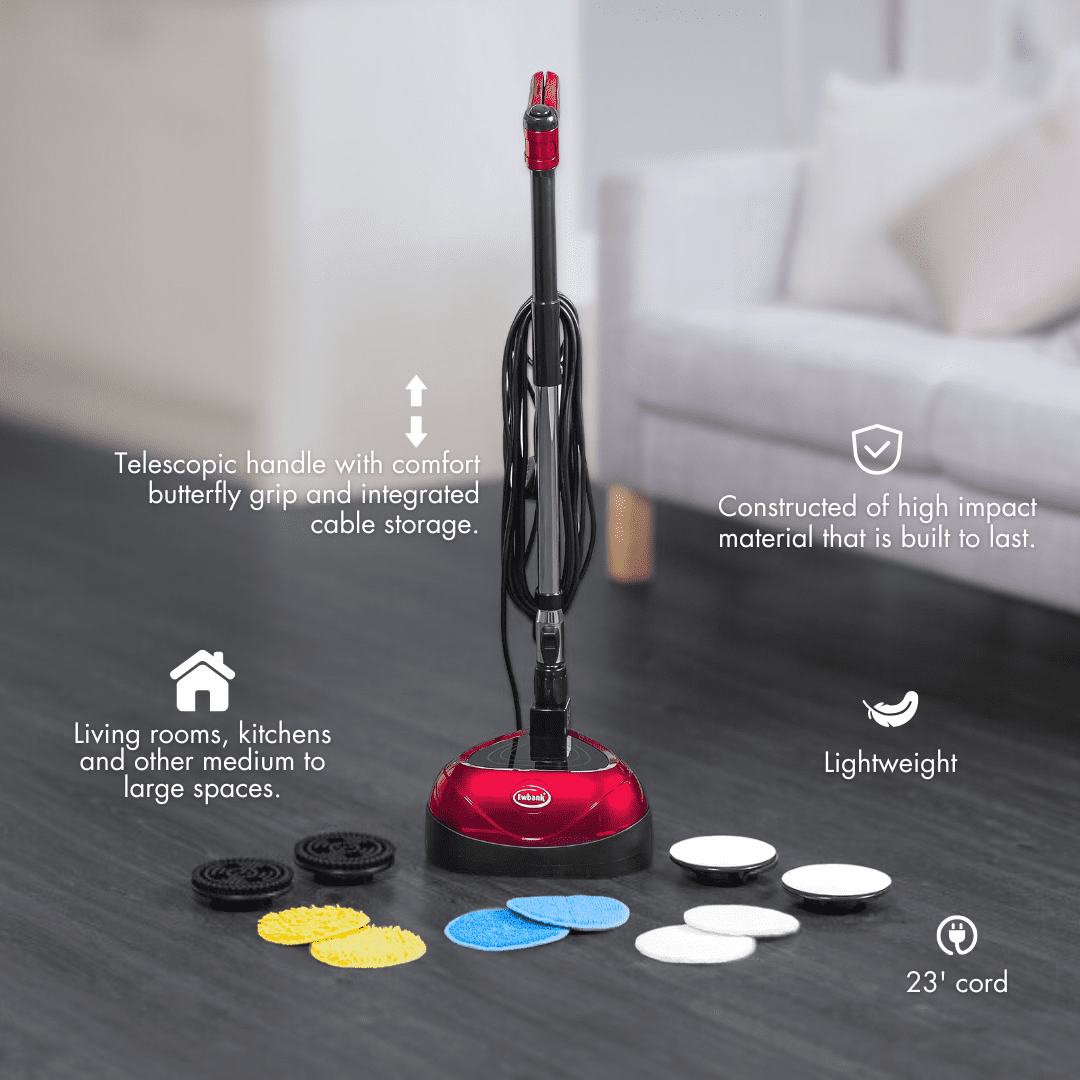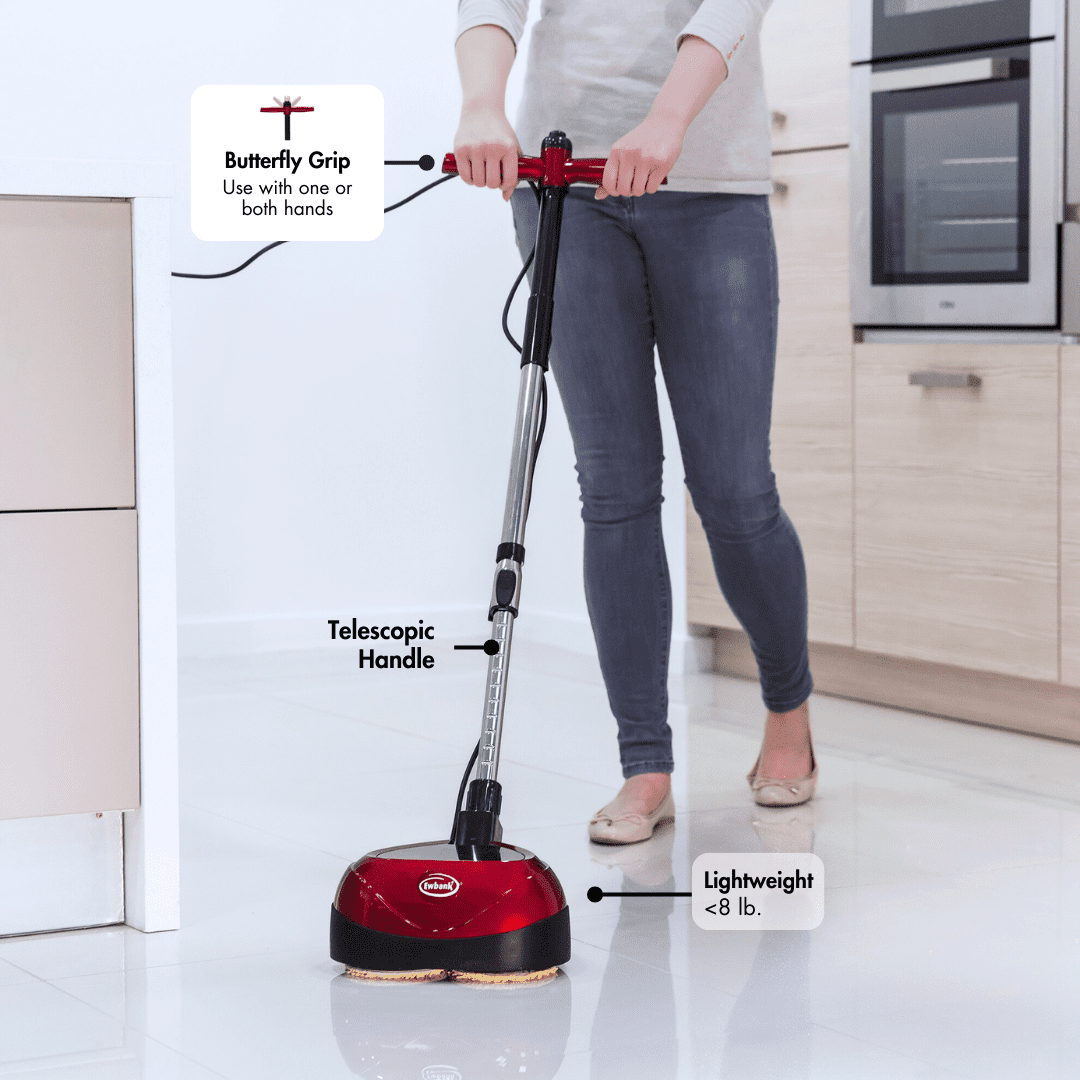 3 IN 1 USES – floor cleaning, scrubbing and polishing. POWERFUL ROTATION – Contra-rotating discs spin at 2,200 rpm powered by 120 V. ADAPTABLE – Suitable for hard floors, including laminate, wood, vinyl, marble, granite, and more. VERSATILE – 4 types of interchangeable pads and brushes. HIGH QUALITY AND DURABLE – Adjustable handle with comfortable butterfly grip & integrated cable storage. LIGHTWEIGHT – perfect for use at home in the kitchen, bathroom, or living room, and non-damaging to delicate floors. The EP170 is easy to move around, weighing less than 8 lbs. REVITALIZE YOUR FLOORS – 9.5-inch wide cleaning/polishing path ensures your floors look shiny and new. Includes 2 nylon bristle scrubbing brush plates, 2 hook and loop backing plates, 1 pair white scrubbing pads, 1 pair blue microfiber cleaning pads, 1 pair yellow microfiber buffing/polishing pads, and instruction manual 1-year limited warranty