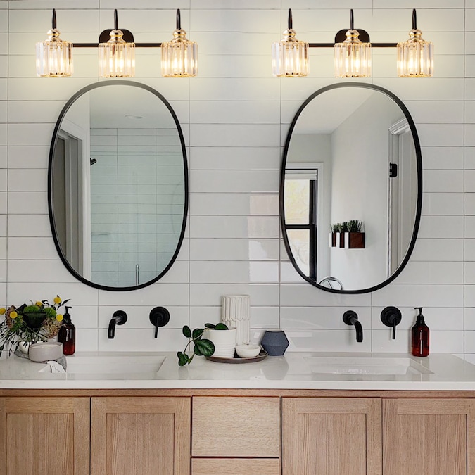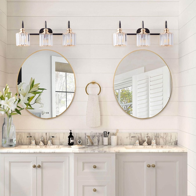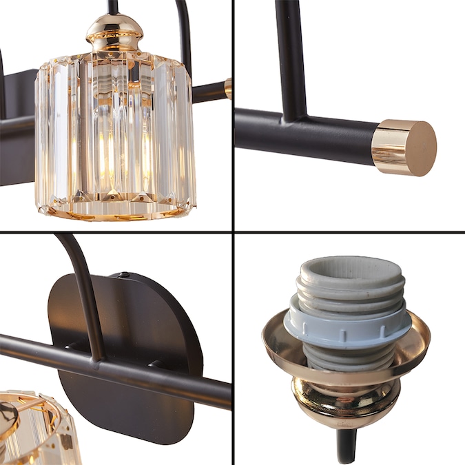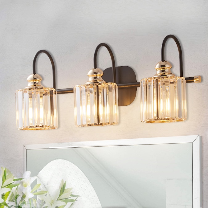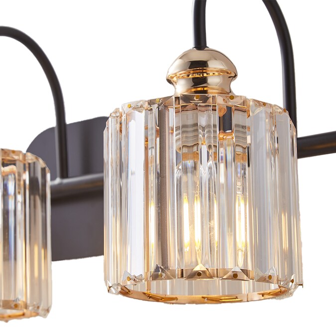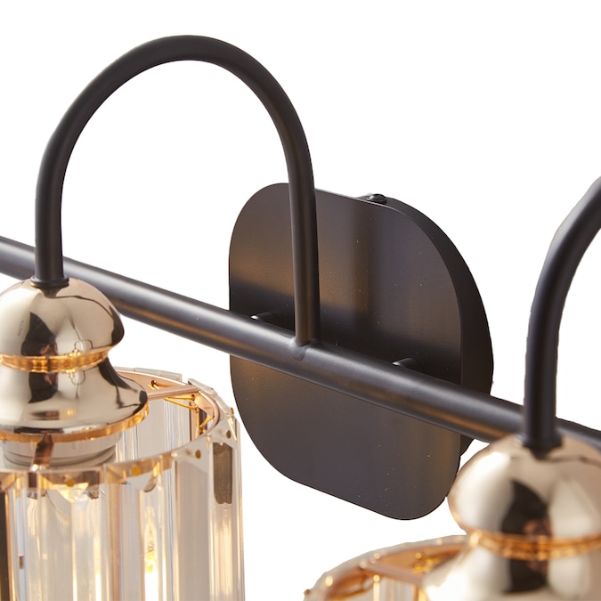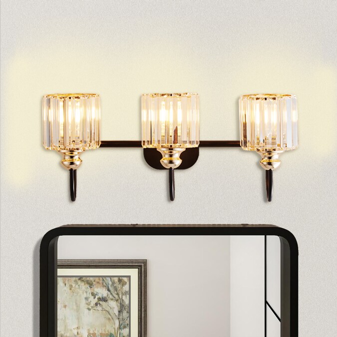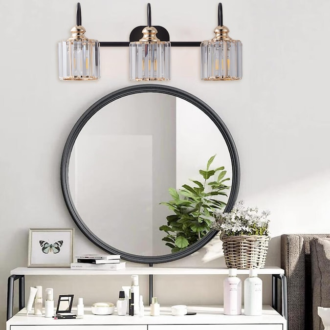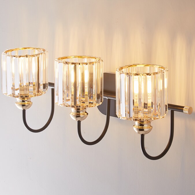 - A Matte Black finish creates a stunning contrast with the sparkling crystal shades of this three-light vanity light.