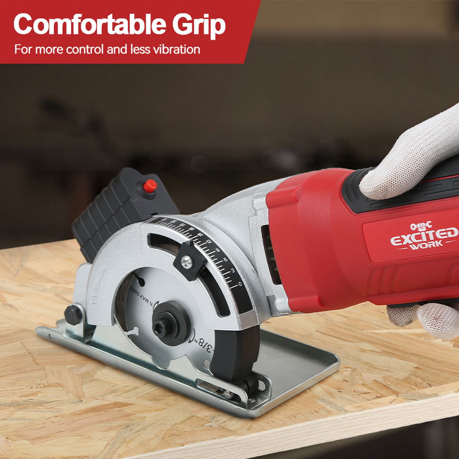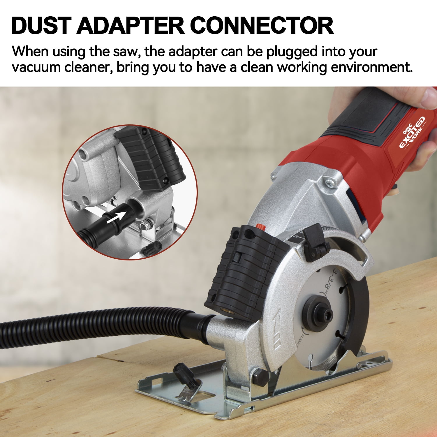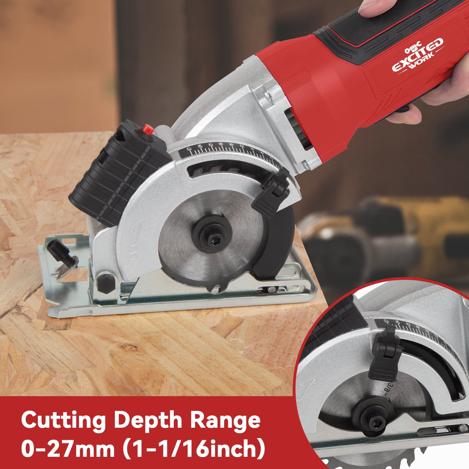 EXCITED WORK, 4.5Amps 3-3/8 in Electric Circular Laser Guided Power Saw, 6500 RPM This mini circular saw features a robust 4A motor and a lightweight design, allowing for easy one-handed operation. Achieve a maximum cutting speed of 6500 RPM with an adjustable cutting depth from 0-27mm for precise cutting tasks. Includes three types of blades suitable for wood, PVC, metal, plastic, and more Equipped with a laser for straight cuts and a graduated ruler for accuracy. The depth measuring rod allows for adjustments within 0-27mm (1-1/16″). Ideal for oblique, frame, and edge cutting The cutting depth scale, cutting angle scale, and quick adjustment design enhance versatility. The included parallel guide rail ensures precise, fast, and easy cutting parallel to the workpiece edge Weighing only 4.1 pounds, this mini circular saw features a compact design and a soft rubber handle for comfortable one-handed operation without fatigue Designed with suction ports and pipes that connect to a vacuum cleaner, promoting a clean working environment and minimizing wood dust inhalation
