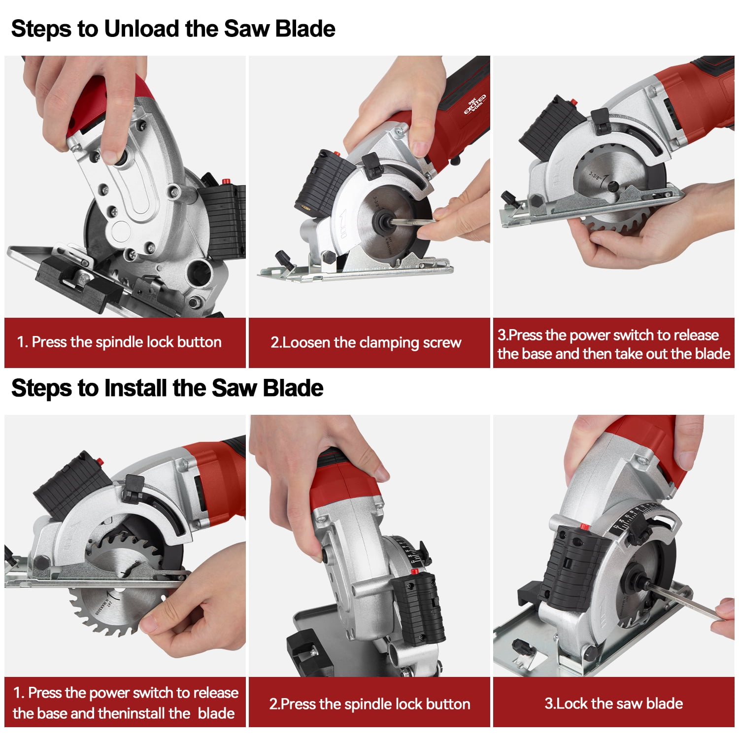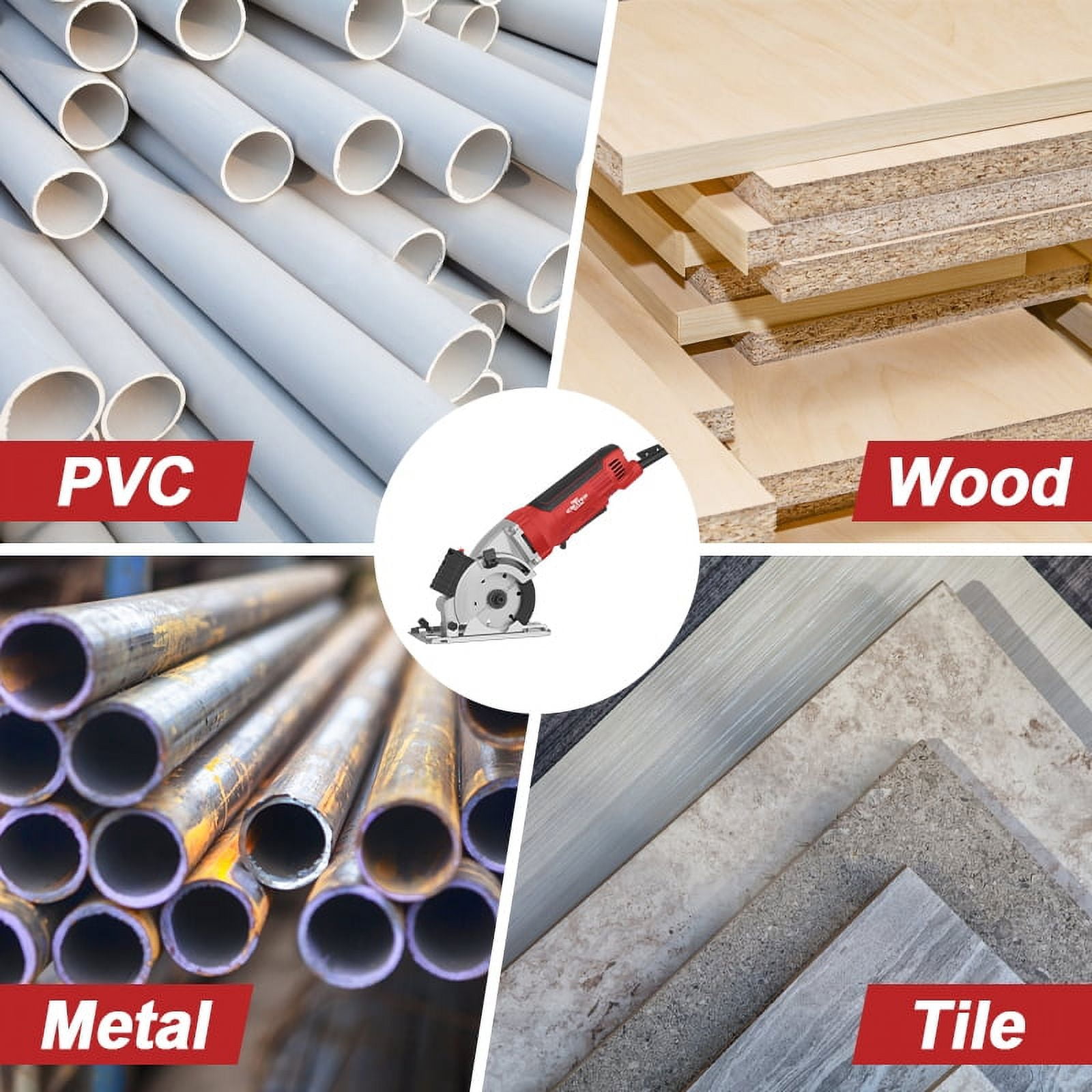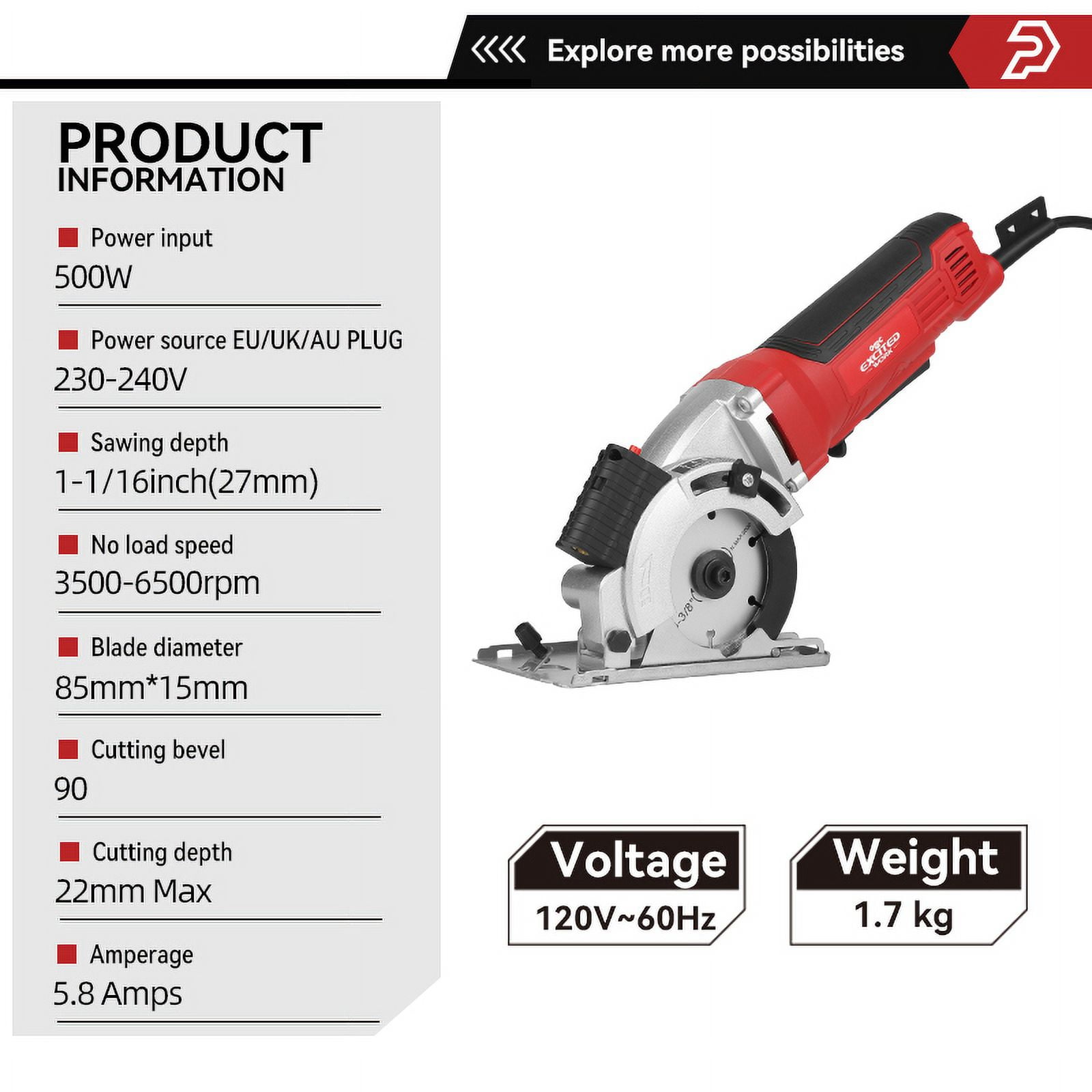 EXCITED WORK, 4.5Amps 3-3/8 in Electric Circular Laser Guided Power Saw, 6500 RPM This mini circular saw features a robust 4A motor and a lightweight design, allowing for easy one-handed operation. Achieve a maximum cutting speed of 6500 RPM with an adjustable cutting depth from 0-27mm for precise cutting tasks. Includes three types of blades suitable for wood, PVC, metal, plastic, and more Equipped with a laser for straight cuts and a graduated ruler for accuracy. The depth measuring rod allows for adjustments within 0-27mm (1-1/16″). Ideal for oblique, frame, and edge cutting The cutting depth scale, cutting angle scale, and quick adjustment design enhance versatility. The included parallel guide rail ensures precise, fast, and easy cutting parallel to the workpiece edge Weighing only 4.1 pounds, this mini circular saw features a compact design and a soft rubber handle for comfortable one-handed operation without fatigue Designed with suction ports and pipes that connect to a vacuum cleaner, promoting a clean working environment and minimizing wood dust inhalation