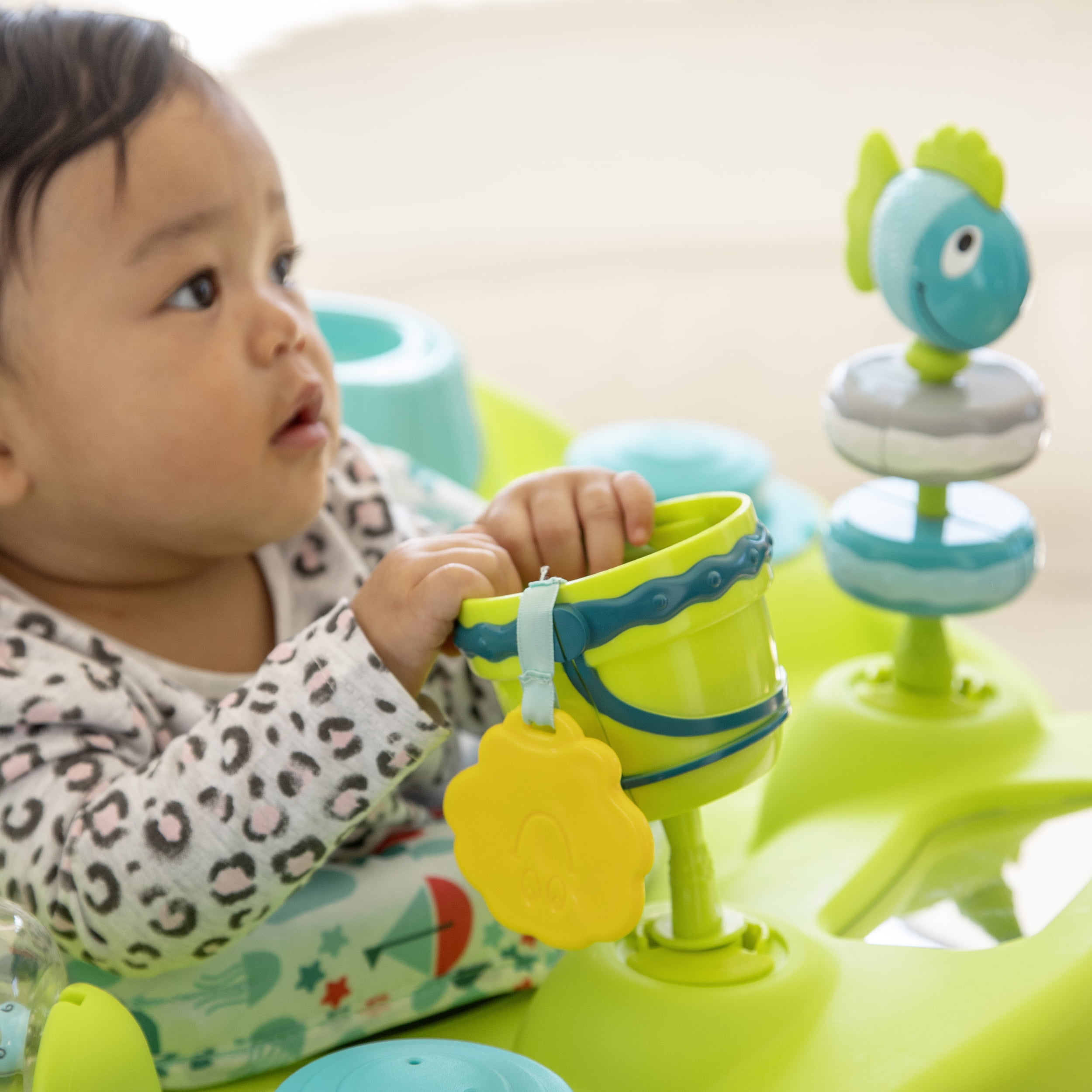 MULTI-ACTIVITY CENTER: Ocean-themed, hands-on activities offer children a fun yet secure space to explore and play while developing their mental and physical skills, and is a safer alternative to walkers. PROMOTES DEVELOPMENTAL GROWTH: With 7 interactive age-appropriate toys, this unisex activity center will have your child spinning and bouncing while helping to develop essential skills including: gross-motor skills, fine-motor skills, object exploration, cause/effect learning, self-awareness, tactile development, visual development, object permanence, and hand-eye coordination. Plus, the physical exercise helps develop baby’s neck, back and leg muscles GROWS WITH BABY: 3-position height adjustment allows the activity center to grow with your child. Accommodates children (from) 4 months old up to 30” tall or until the child is walking EASY TO CLEAN: Machine-washable seat pad and wipeable toys and snack tray are removable for convenient cleaning