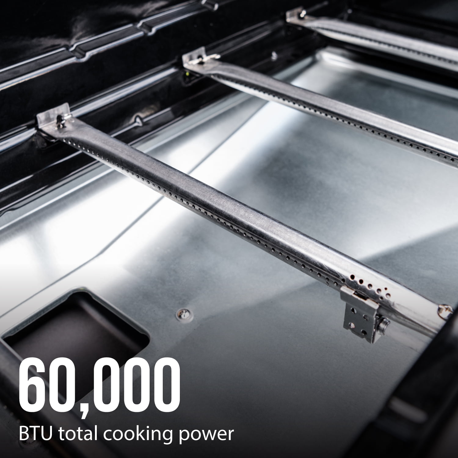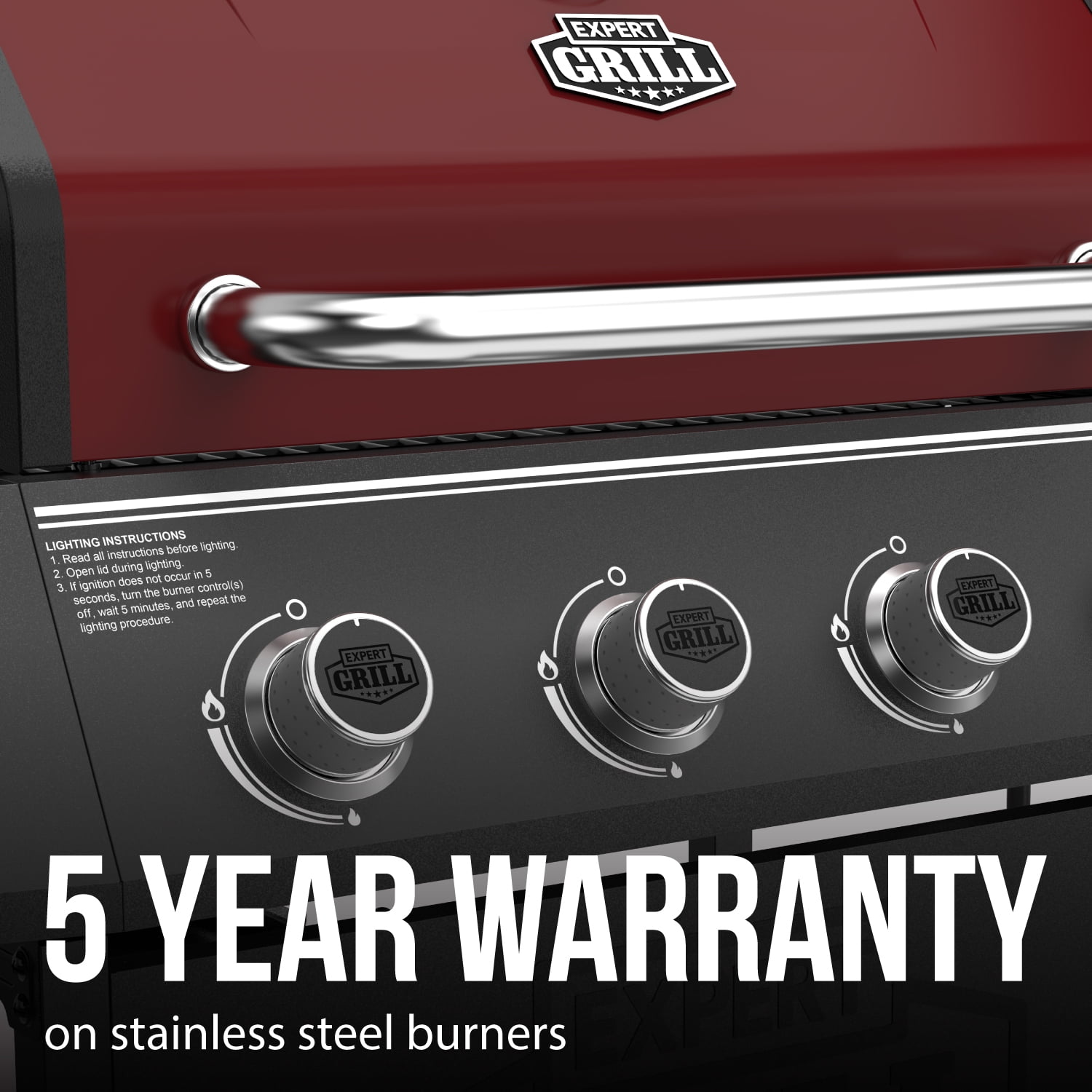 The Expert Grill 4-Burner Liquid Propane Gas Grill with Side Burner in Red is the ideal grill for getting your backyard or patio cookout ready. Featuring 60,000 total BTUs of heating energy for quick, controlled heating, while 619 square inches of total cooking space provides enough room to fit up to 25 burger patties at once. When it’s time to clean up, 2 heavy duty wheels offer easy transport for storage, to help keep your grill in top shape for seasons to come.