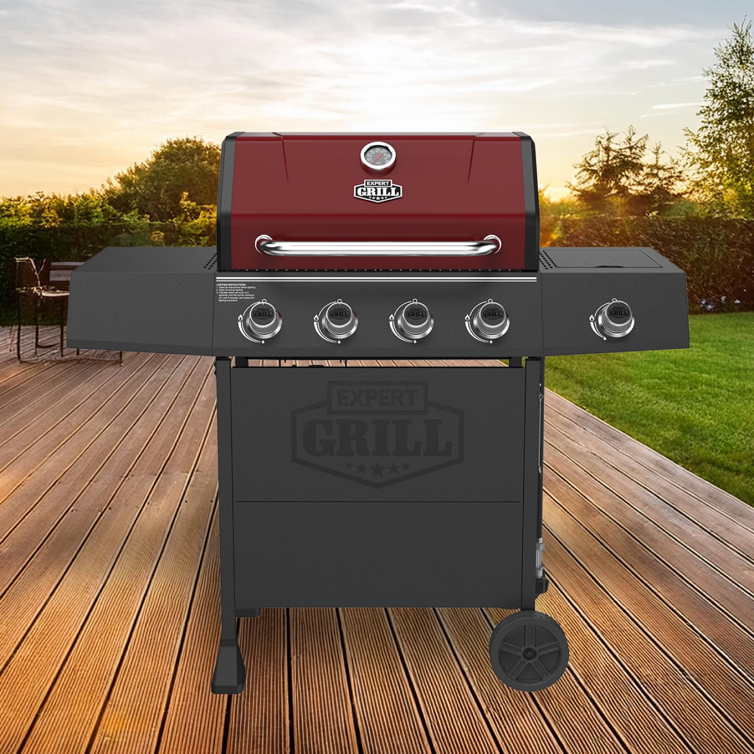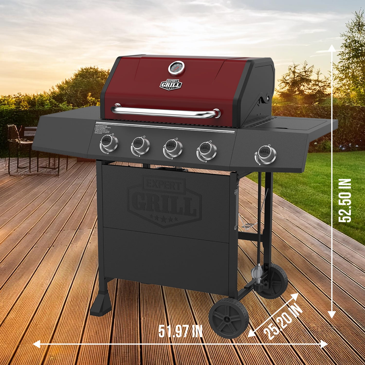 Expert Grill Gas Grill, 4 Burner Propane Gas Grill with Wheels and Side Burner, Red