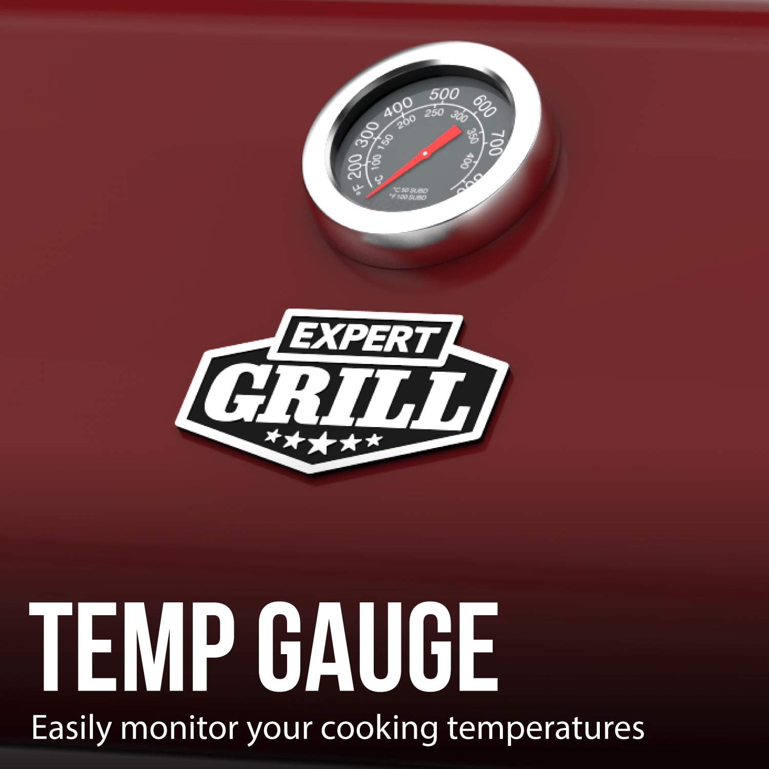 The Expert Grill 4 burner propane gas grill with side burner in red, offers plenty of grilling space for your next barbecue cookout. Features durable stainless-steel burners for even heat. Primary cooking area features 449 sq. in. of space so you can grill up to 25 burgers or your favorite steak or chicken recipes. Warming rack features 170 sq. in. of space and allows you to keep food at the perfect temperature. Durable cast iron cooking grates provide the perfect grill marks and clean up easily when the grilling is done. A push and turn ignition system means you can light all your burners with the simple push of a button. Two fixed side shelves, one with a side burner, offer ample space for grill tools and food prep, and conveniently allows for cooking up sides and sauces. The attached temperature gauge lets you keep track of your grill’s internal temperature. A removable grease tray allows drippings to be funneled away from the burners and reduces your risk of flare-ups. Conquer your weeknight cookouts and look to the expert. The Expert Grill 4 Burner Gas Grill with Side Burner in Red. Model Number: XG1136207123002. For questions, problems , missing parts? Before returning to your retailer, contact our customer service at (833) 908-2026 Sunday – Saturday, 7:00 a.m. – 9:00 p.m. CT