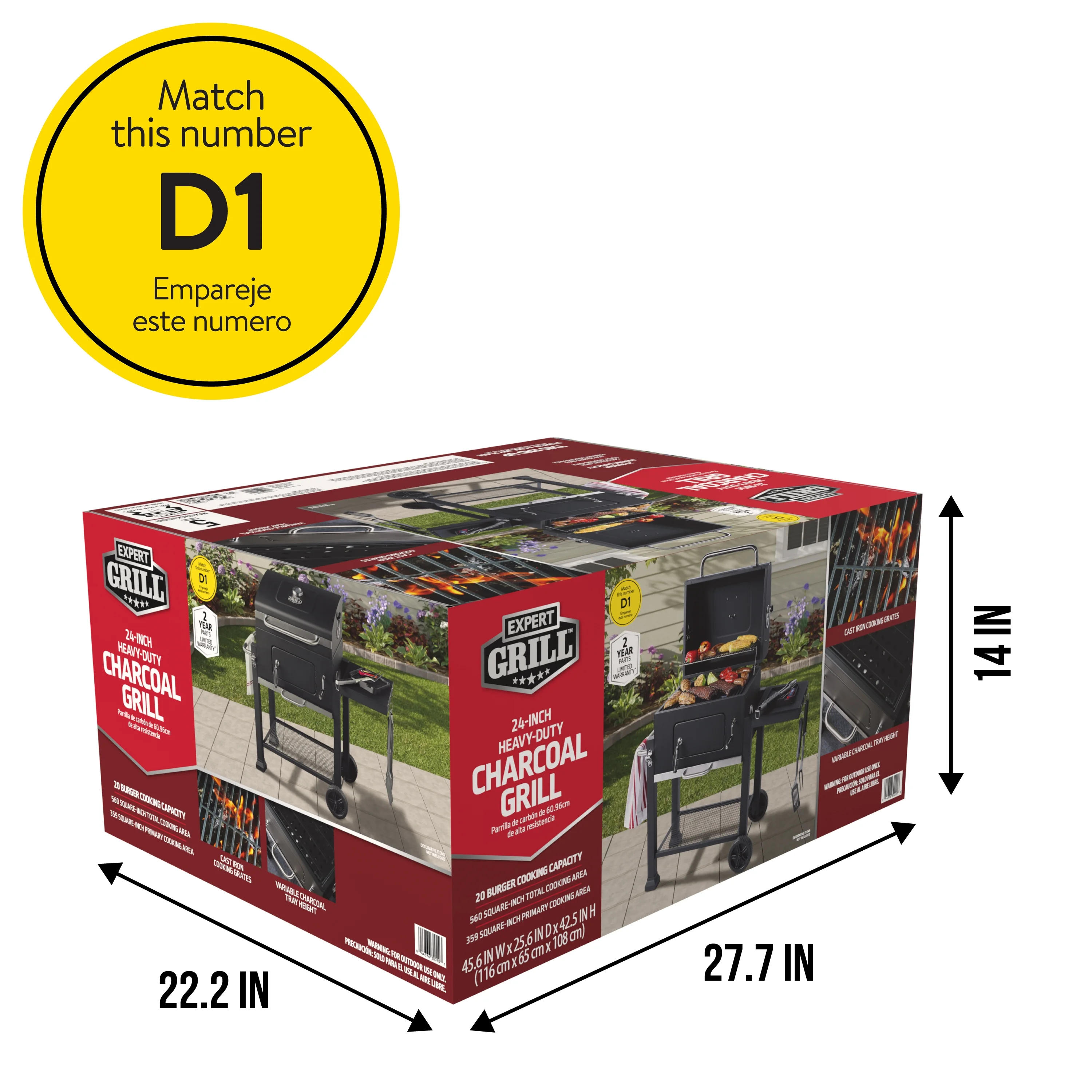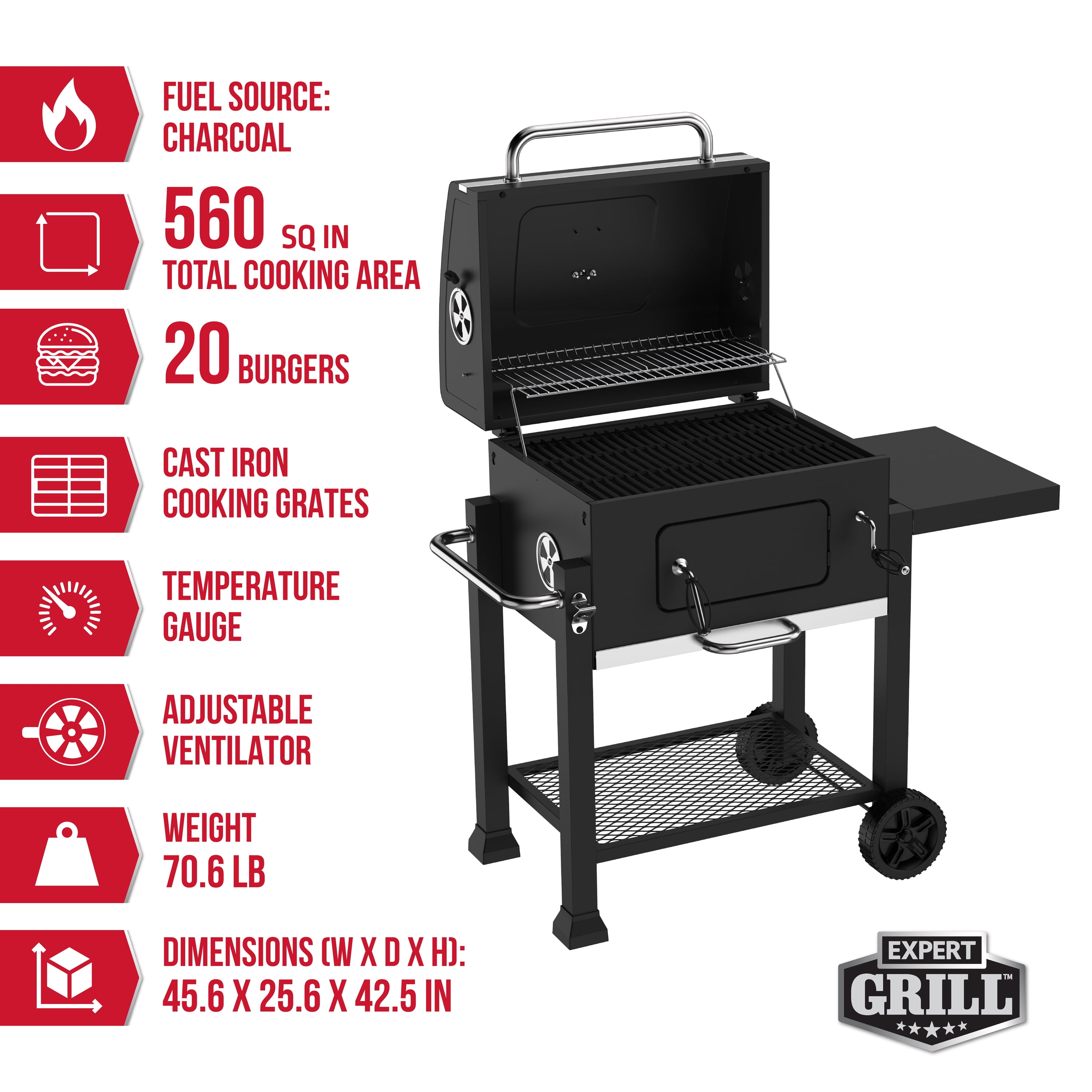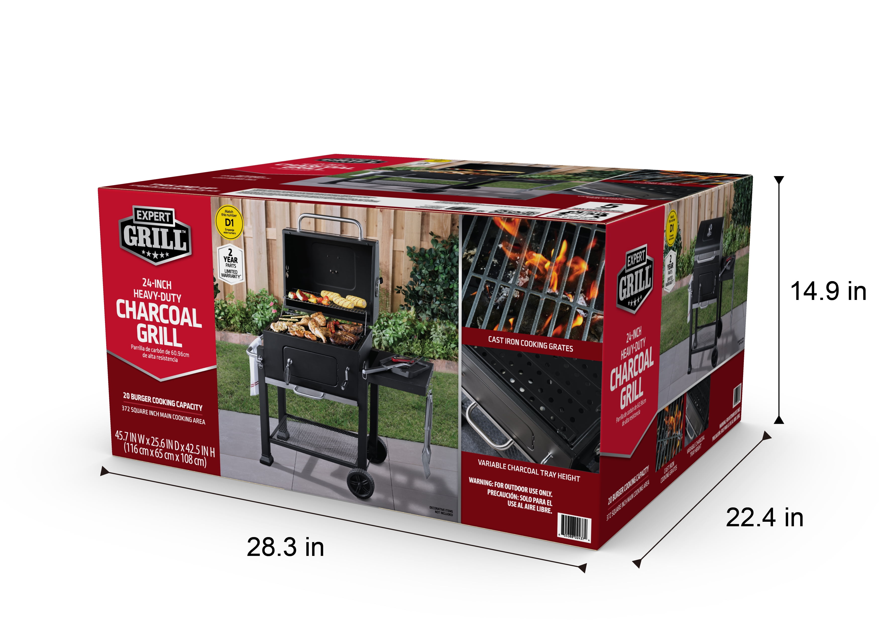 Charcoal grill with black powder coated finish 372 sq. in. heavy-duty cast iron cooking surface with space for up to 20 burgers Chrome warming rack measures 201 sq. in. Hinged, high-temperature lid with vent and large door handle for easy opening Adjust charcoal pan height with crank to customize cooking temperatures Two wheel cart design for portability Built-in thermometer on top of lid lets you see temperature at a glance Foldable side shelf with three hanging hooks for utensil storage Includes open bottom shelf for extra storage Built-in bottle opener so you can enjoy beverages while you grill Slide-out ash pan for quicker cleanup 2 year limited warranty Assembled product dimensions 44.88″ L x 26.38″ W x 42.32″ H Assembled product weighs 70 lb. Model number XG1910200103 Expert Grill Customer Service: 1-833-908-2026