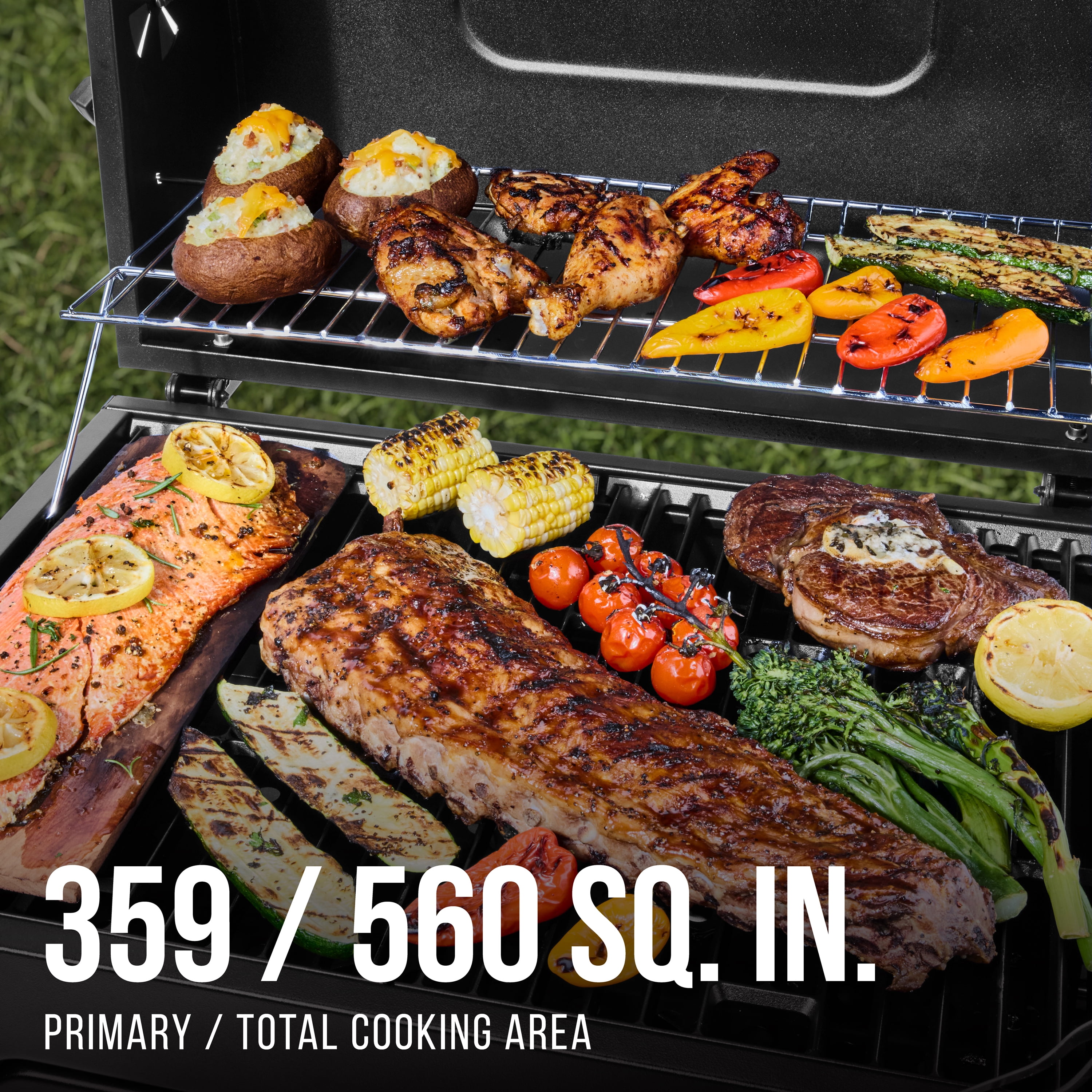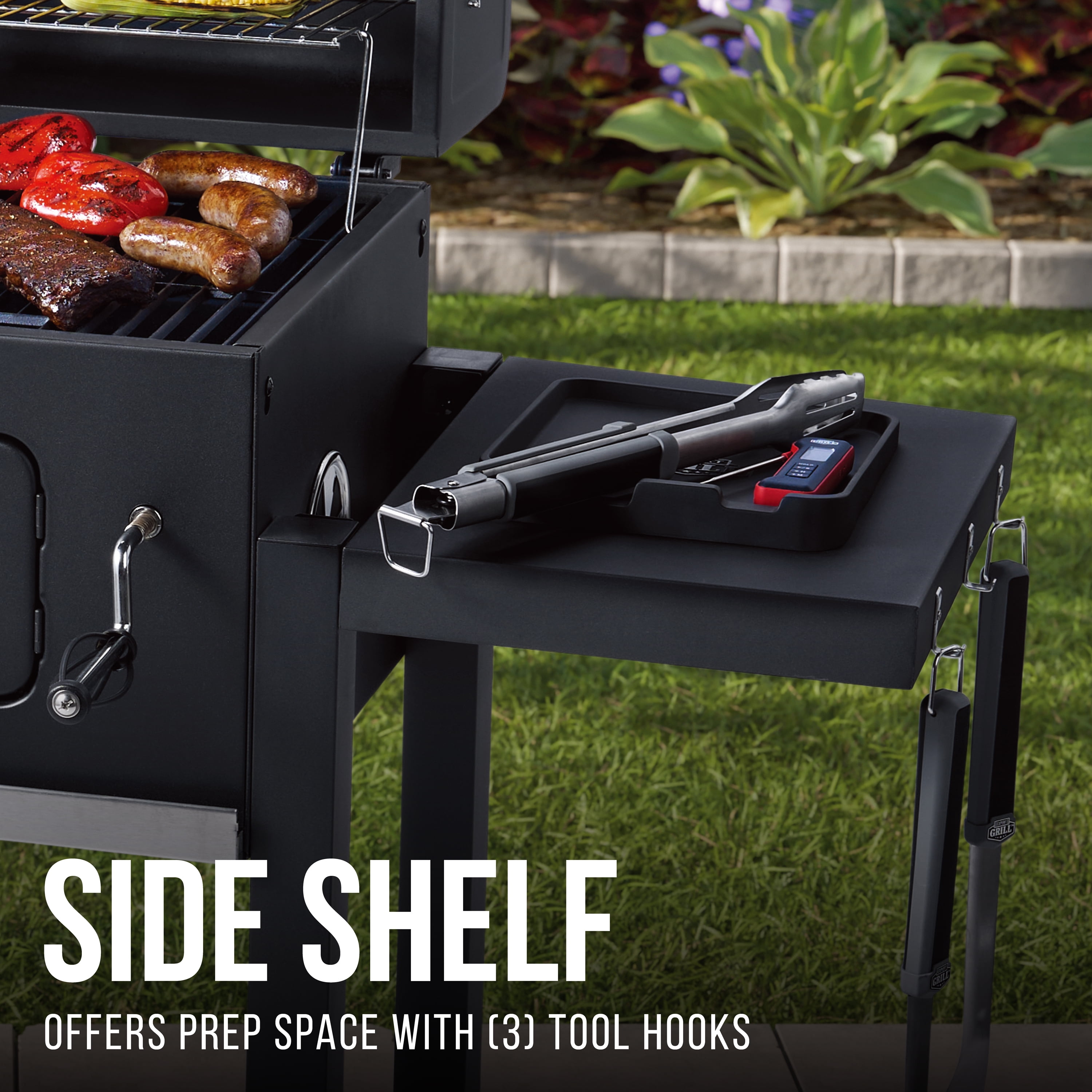 With plenty of grill space to cook for all your family and friends, the Expert Grill Heavy Duty 24″ Charcoal Grill will be the star at your next backyard barbecue or gathering. This cart-style grill has a 372 sq. in. main cooking surface that’s large enough to grill 20 burgers at once plus a 201 sq. in. warming rack. This grill is equipped with heavy-duty cast iron cooking grates that retain heat exceptionally well and produce restaurant-quality sear marks on steaks, burgers, chicken, and more. Other features include a charcoal access door, an adjustable charcoal pan, and built-in, easy-to-read lid thermometer. The foldable side shelf offers space for platters, marinades, and more, and the shelf has three hooks to keep grill tools and utensils within easy reach. Wheels on the right legs offer easy maneuverability around a porch, patio, or deck. The Expert Grill Heavy Duty 24″ Charcoal Grill is available in black with a durable, powder-coated finish.
