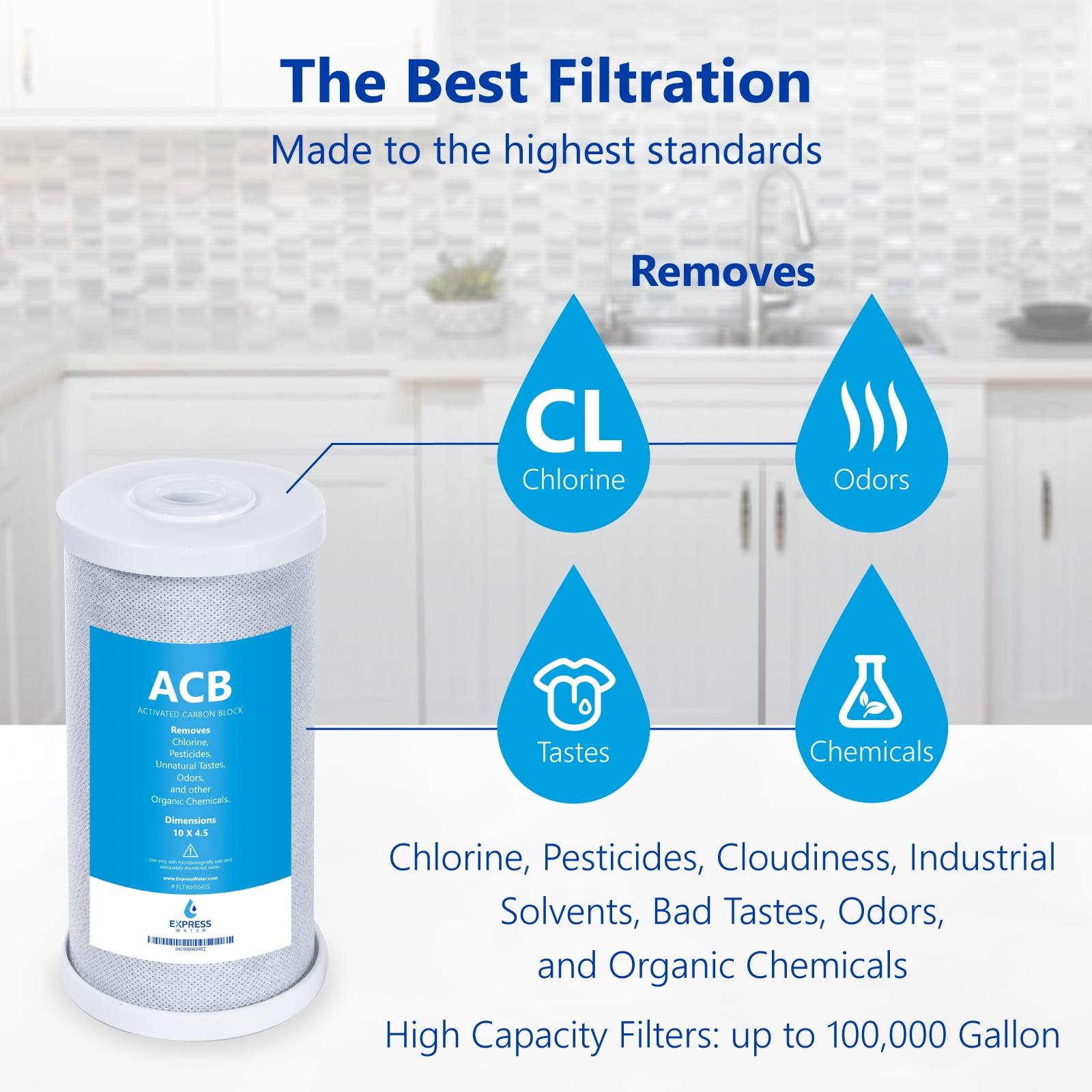 Protect your home, health, and appliances by filtering your water. The 5 Pack Express Water Big Blue Filter Whole House Activated Carbon Block removes major contaminants from your water supply and provides clean water for drinking, showering, cooking, and other home uses. The ACB removes major water contaminants like Chlorine, Total Organic Carbon (TOC), Pharmaceuticals, Turbidity, Volatile Organic Chemicals (VOC), Herbicides, Industrial Solvents, Insecticides, Pesticides, and Chemicals causing bad tastes, odors, and more. Shower without harsh chlorine. Give healthier water to your pets. Extend the life of your dishwasher, laundry machine, washing machine, other appliances, and reduce your energy cost. The ACB filters are good for up to 100,000 gallons or 6-12 months. This is based on average water quality. Your filter life may be different depending on your water quality, temperature, and incoming pressure. Fits any standard 4.5” x 10” whole house filter housing. This durable, heavy-duty whole house filter is able to deliver up to 0.25 gallons of water every second. The filter works with 45-125 psi and water temperatures between 40-100℉. The filter is vacuum sealed and complete with a polypropylene shell, a thermal bonded cap, and an industrial sealed silicon ring to make sure it’s durable and reliable. Filter your water with high quality coconut carbon for maximum chemical absorption. Choose the filter that lasts longer to give you the best value in filtration. The Express Water Big Blue Activated Carbon Block Whole House Filter 5 Pack FLTWH1045C05 is the best in carbon filtration.