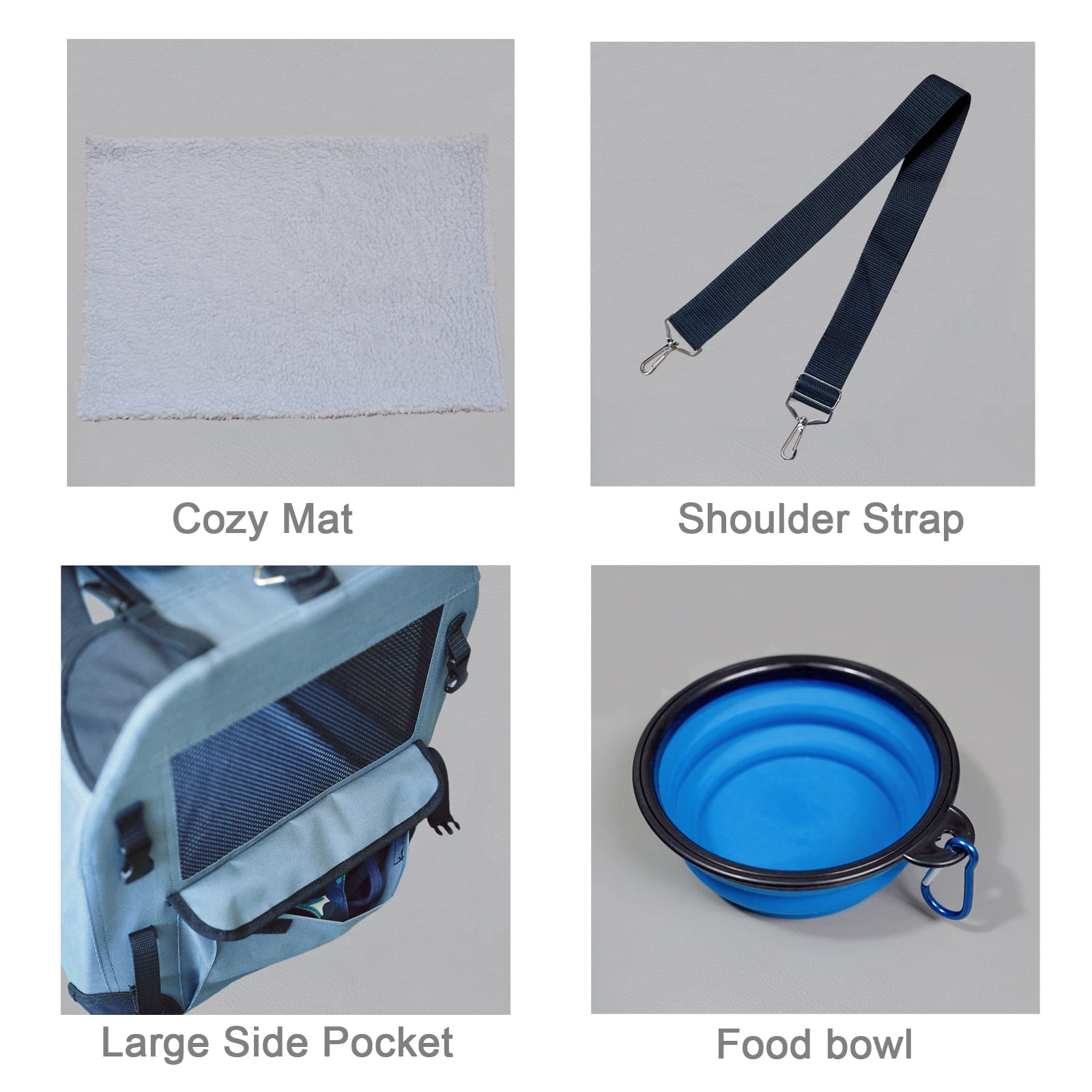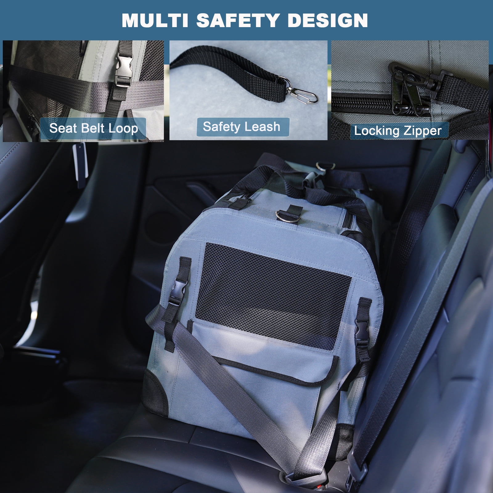 [Breathable Mesh Entrances] The three-side entrance on sides, front and top of the cat carrier will not only provide fresher air and wider view for your pet, but also easy to take care of your pet. [Side Pocket] The side pocket of the cat carrier is convenient to store treats, toys, food and other travel accessories. [Deluxe Zippers] Ensure the safety of your pet inside the cat carrier [Safety Leash] Secure your pet to make sure it is safe on the way. [Sturdy ABS Hooks] Support more weight and keep your pet safe