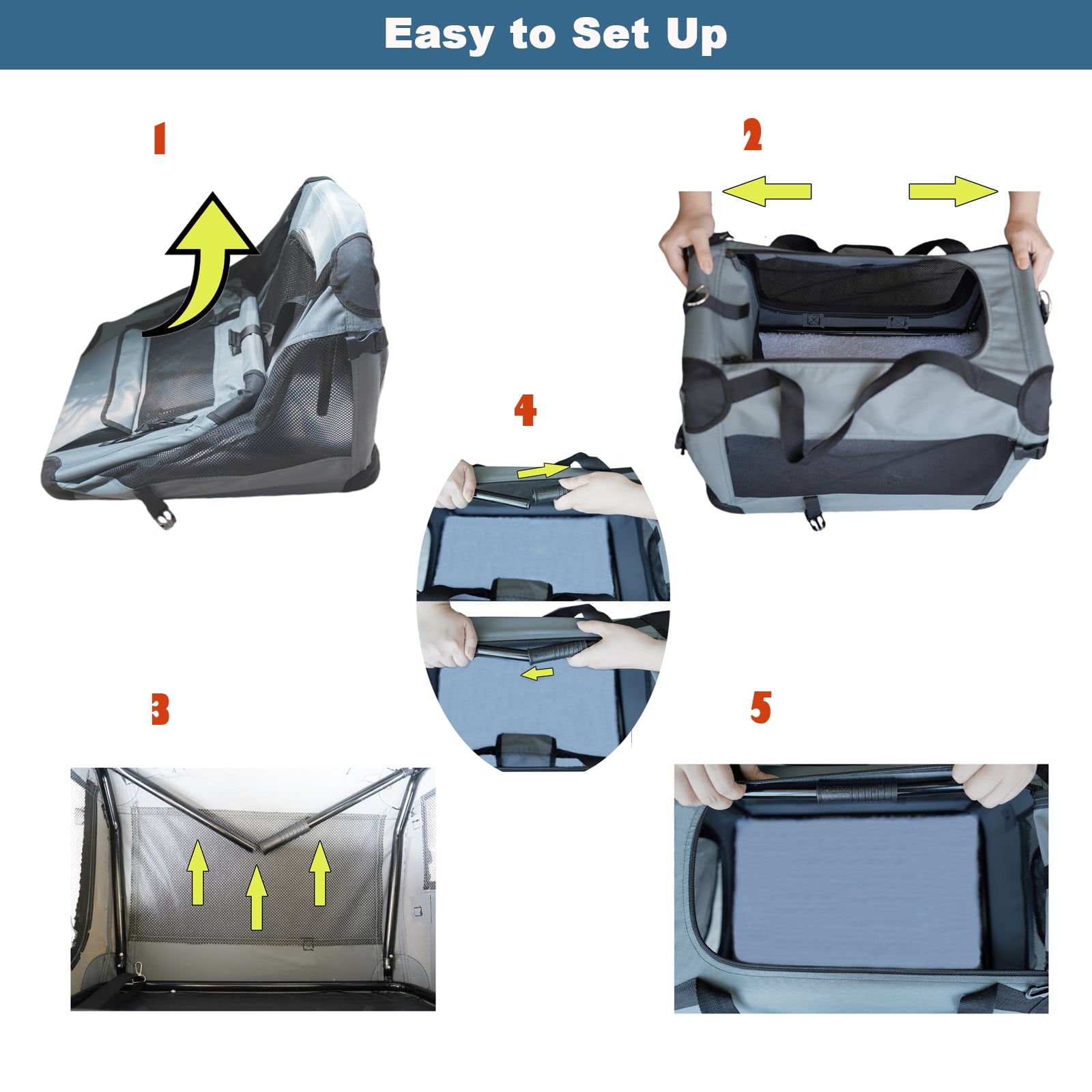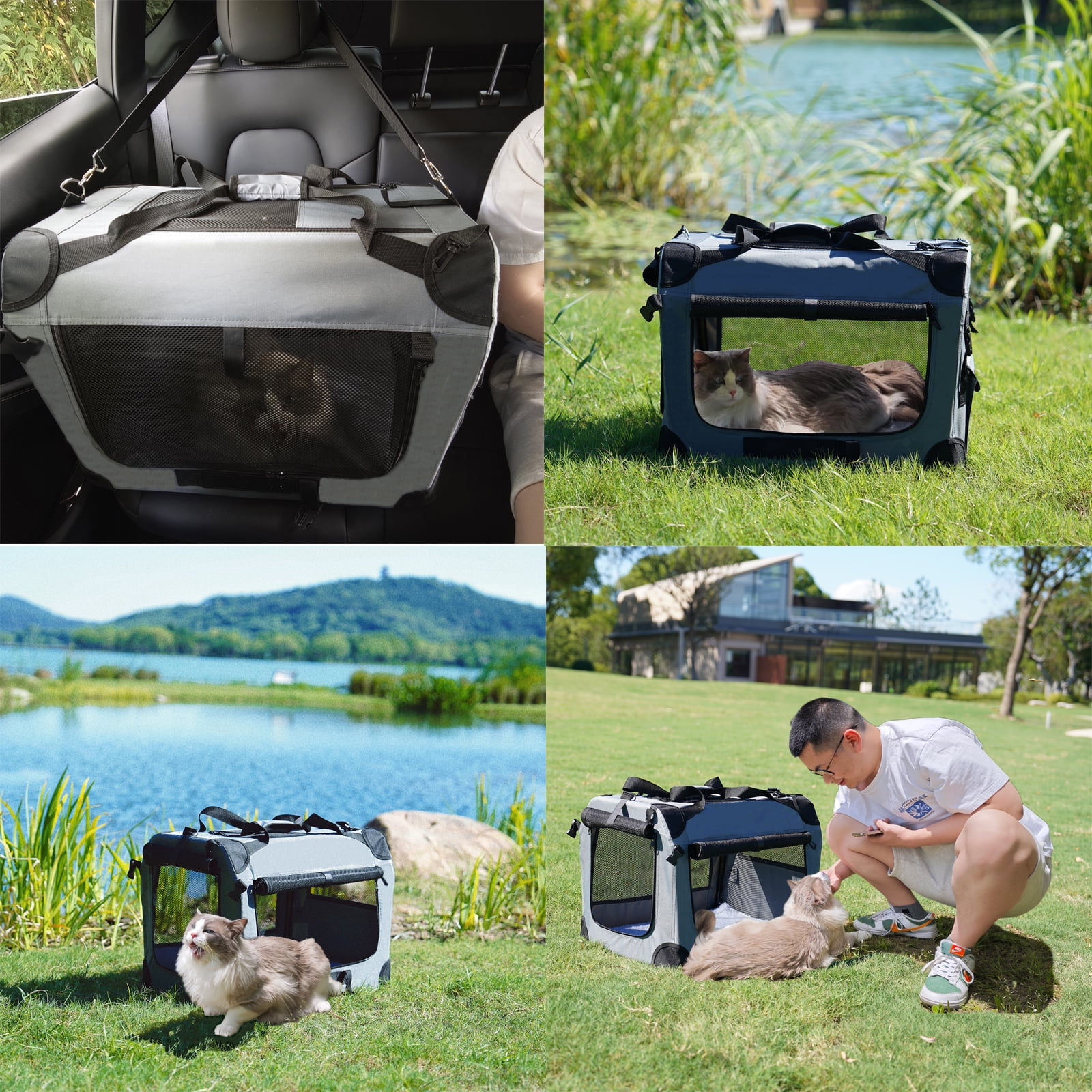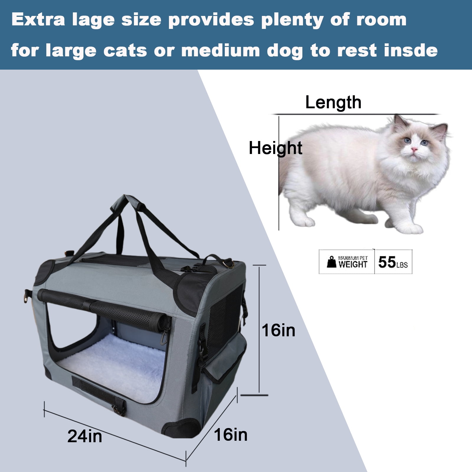 [Large Capacity Cat Carrier] Our cat carrier measures approximately 24x16x16 inches, can hold pets up to 55 pounds, perfect for medium to large cats or small to medium dogs. [Sturdy and foldable structure] The interior of the cat carrier is a sturdy lightweight steel support structure, the steel support is foldable and easy to install. After folding, the cat carrier size is small, taking up little space and easy to store. [Excellent Quality] This cat carrier is made of Oxford cloth, which is wear-resistant and easy to clean. Three-sided nylon mesh design, strong and breathable. [Multi Safety Design]The side seat belt webbing loop design helps to secure the cat carrier to the back seat via the seat belt to prevent it from slipping off during off-road moving or road trips. Locking zipper helps you relieve your worries about smarter cats opening the carrier. The internal safety leash to ensure the pet stays safely inside the cat carrier. [Convenient Design] There are 3 access points for pets, one each at the top, front and side of the cat carrier. Removable shoulder straps provide comfortable carrying options. The large accessory pocket on the side provide plenty of space to store accessories, snacks, etc. [Customer Service] If there is any problem with the pet carrier within 90 days, return and exchange service is available.