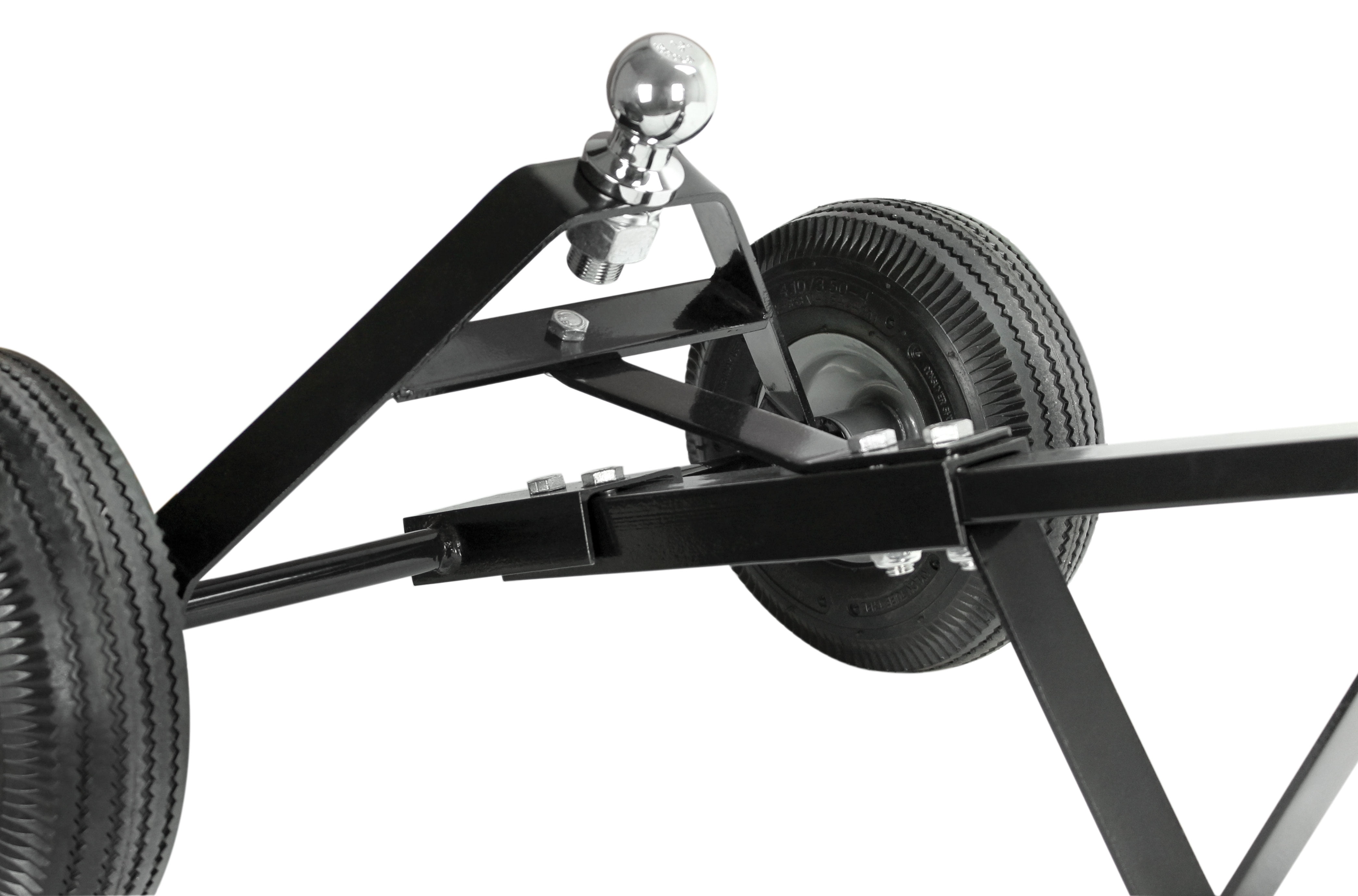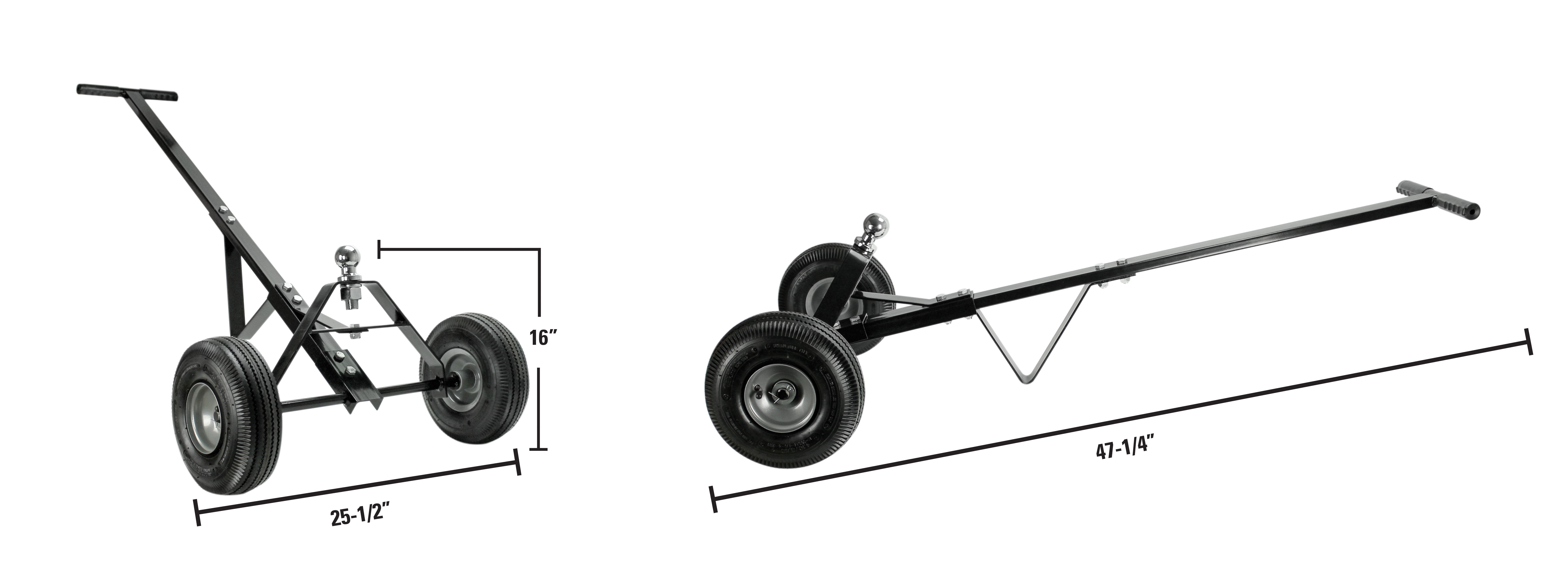 Extreme Max 5001.5766 Trailer Dolly, 600 lb.: Perfect for boat trailers, snowmobile trailers, cargo trailers and more All-steel frame construction supports up to 600 lbs. Large 10″ x 3.5″ tires roll smoothly, even on rough surfaces Ball height: 16″ Handle length: 47.25″ Width: 25.5″ For use on hard, dry, level surfaces