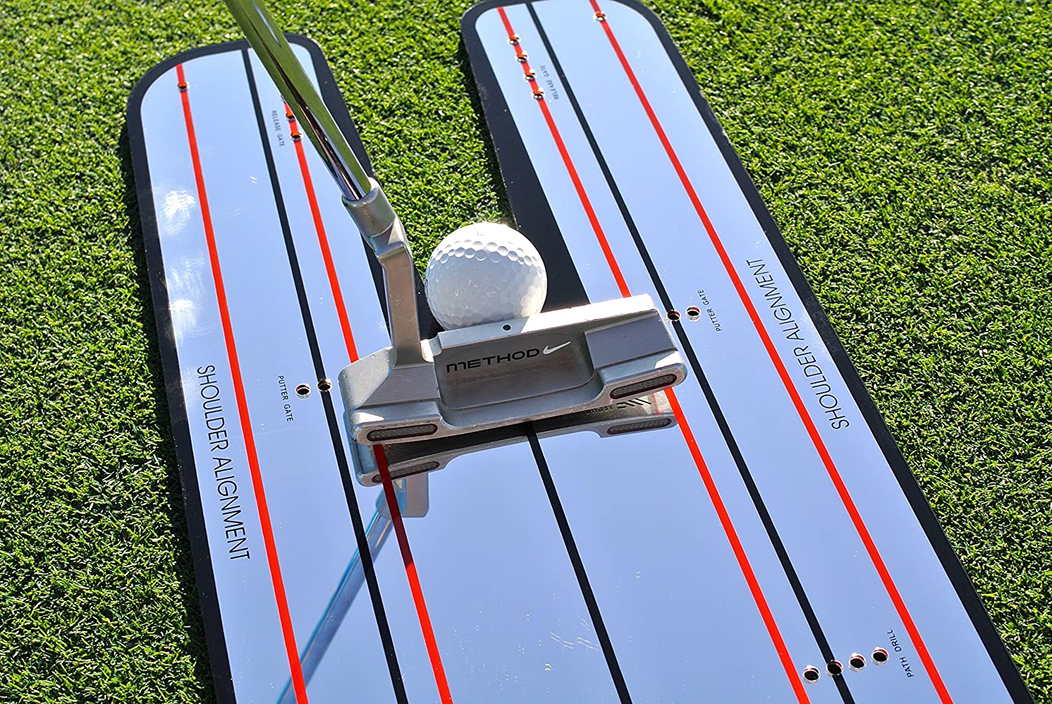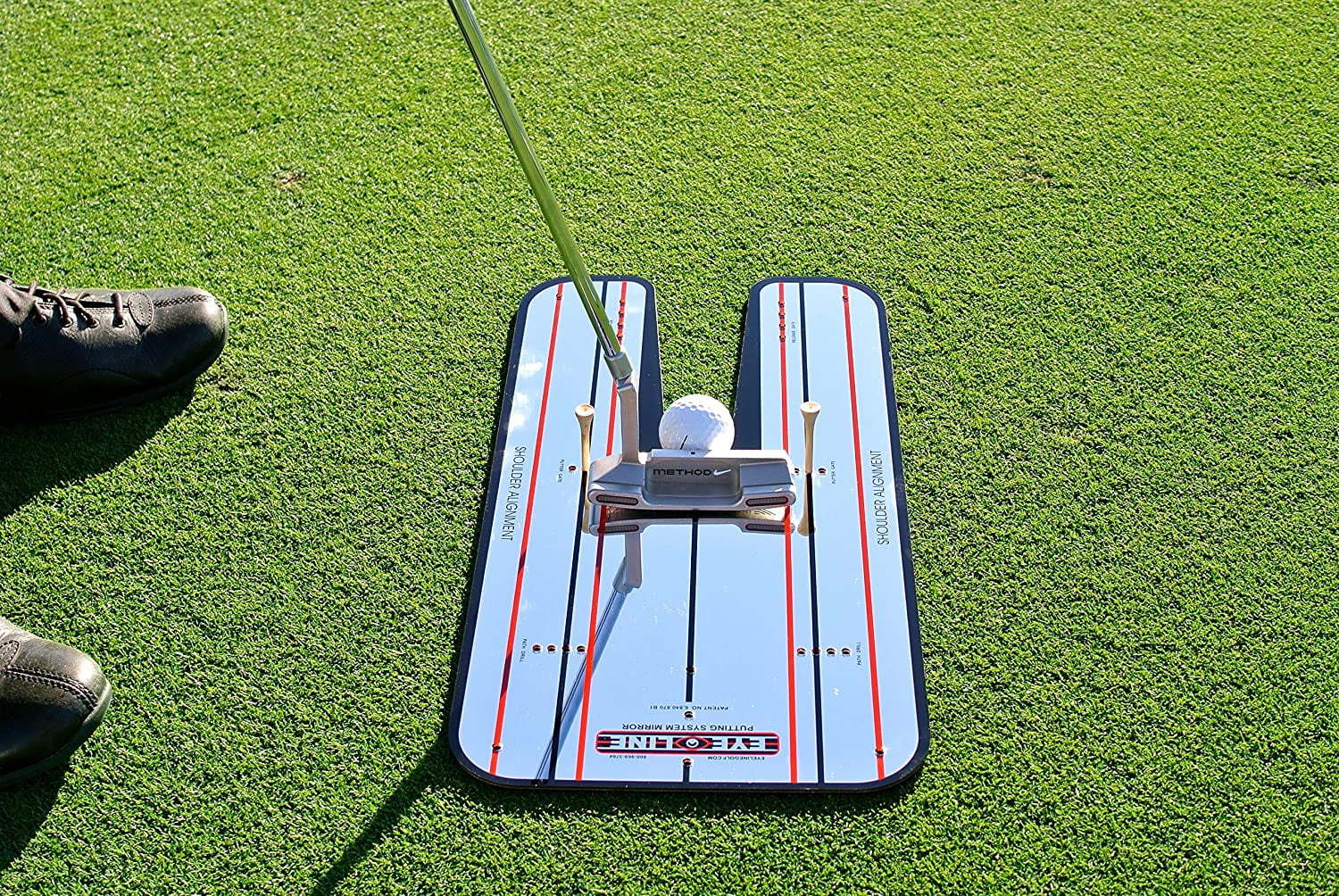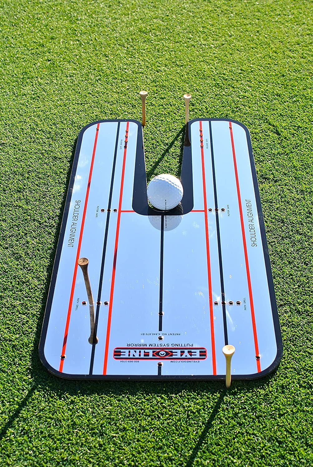 EyeLine Golf Putting Mirror Training Aid Original Version Made in USA Holes for Tees Insert tees at the front for ‘gate drill’ or towards the back for back swing control Reflective Surface The acrylic mirror face provides instant feedback on eye position, putter setup, and putter stroke Practice Anywhere Large 9.25 inch x 17.5 inch size makes it ideal for use on your putting mat at home or on the course putting green Make More Putts Utilize alignment lines, guidelines, and the mirror face to achieve the perfect starting line, face angle, and eye placement Putter Gate Slots Set up a gate of tees for the toe and heel of the putter to learn to swing and create the ‘sweet spot’ in the center of the putter face
