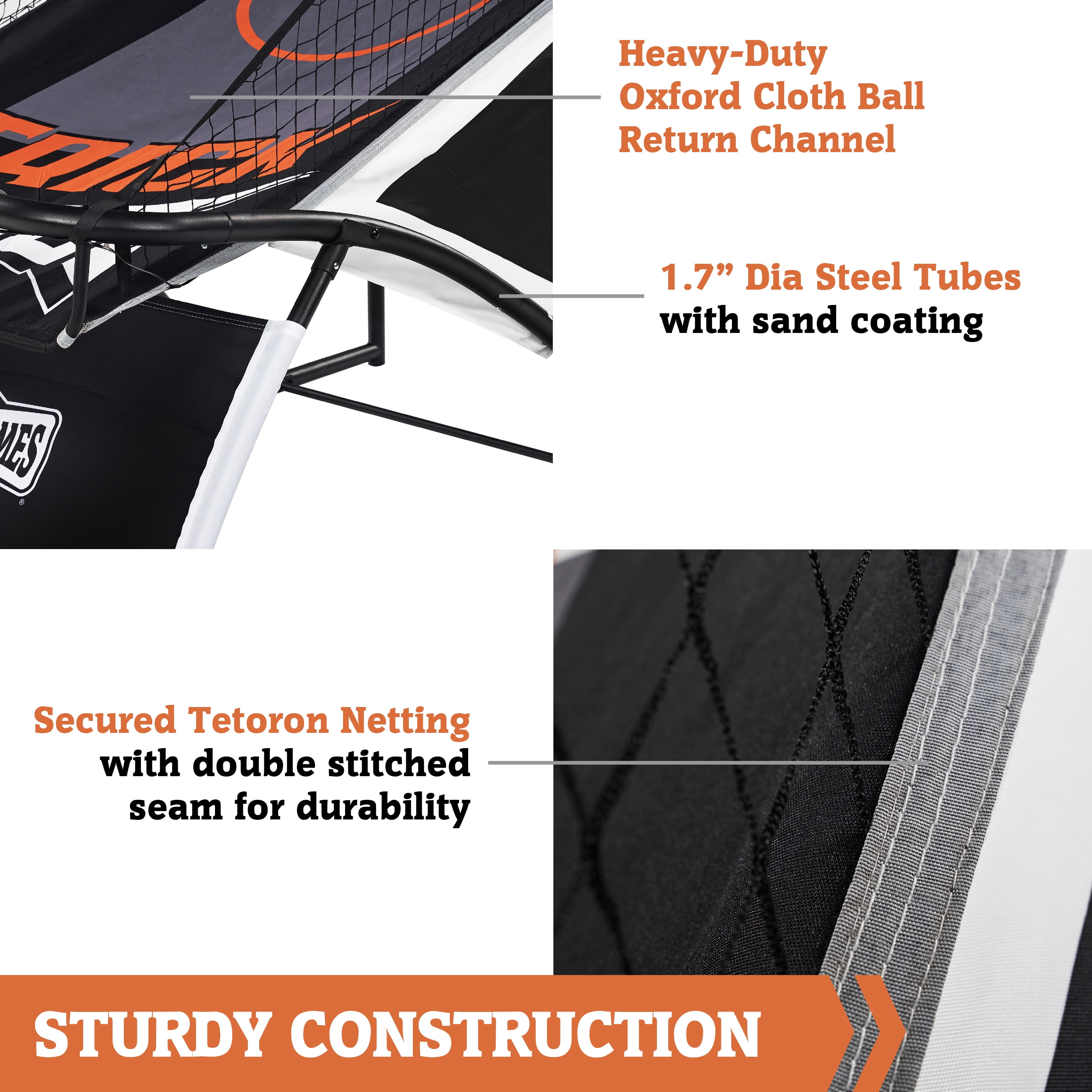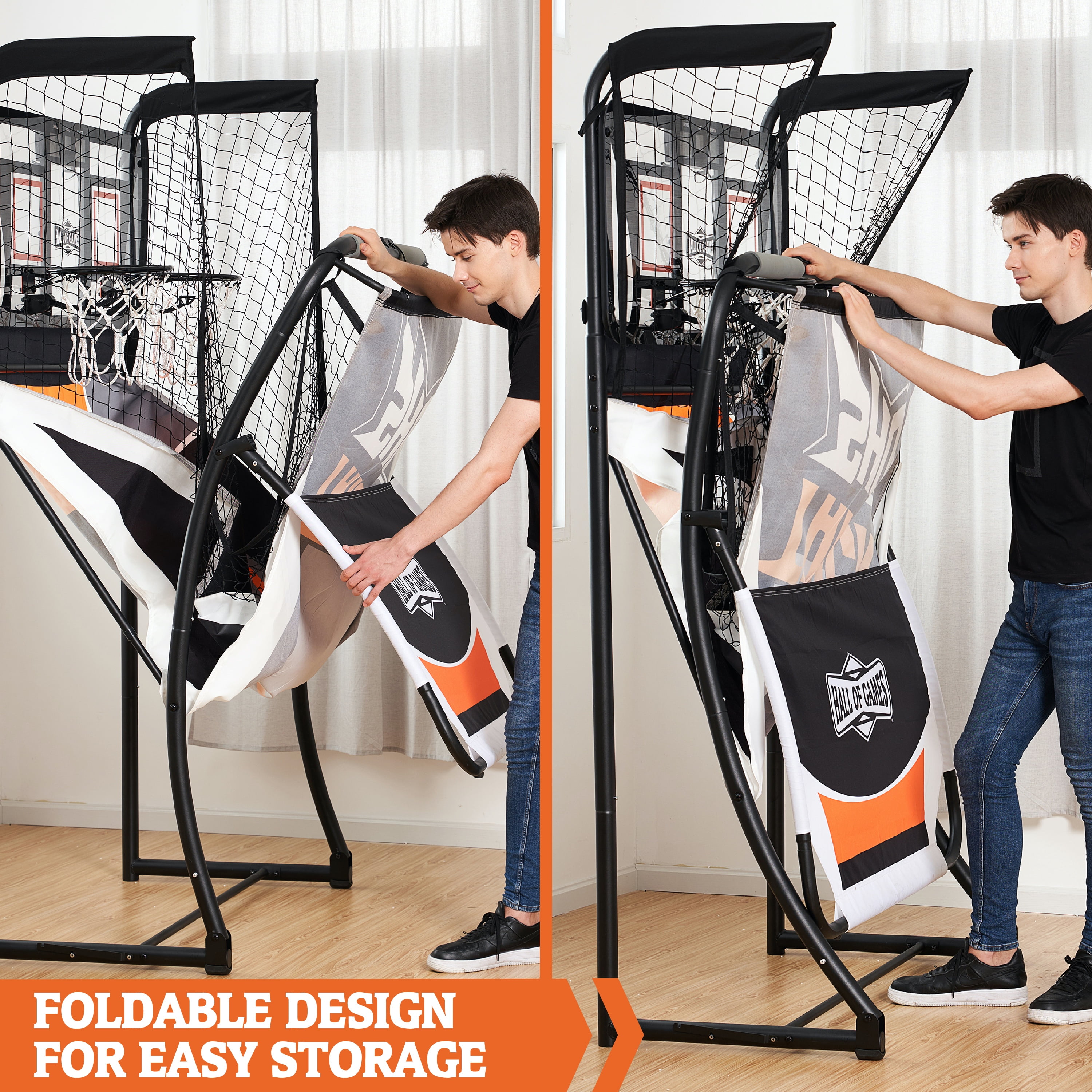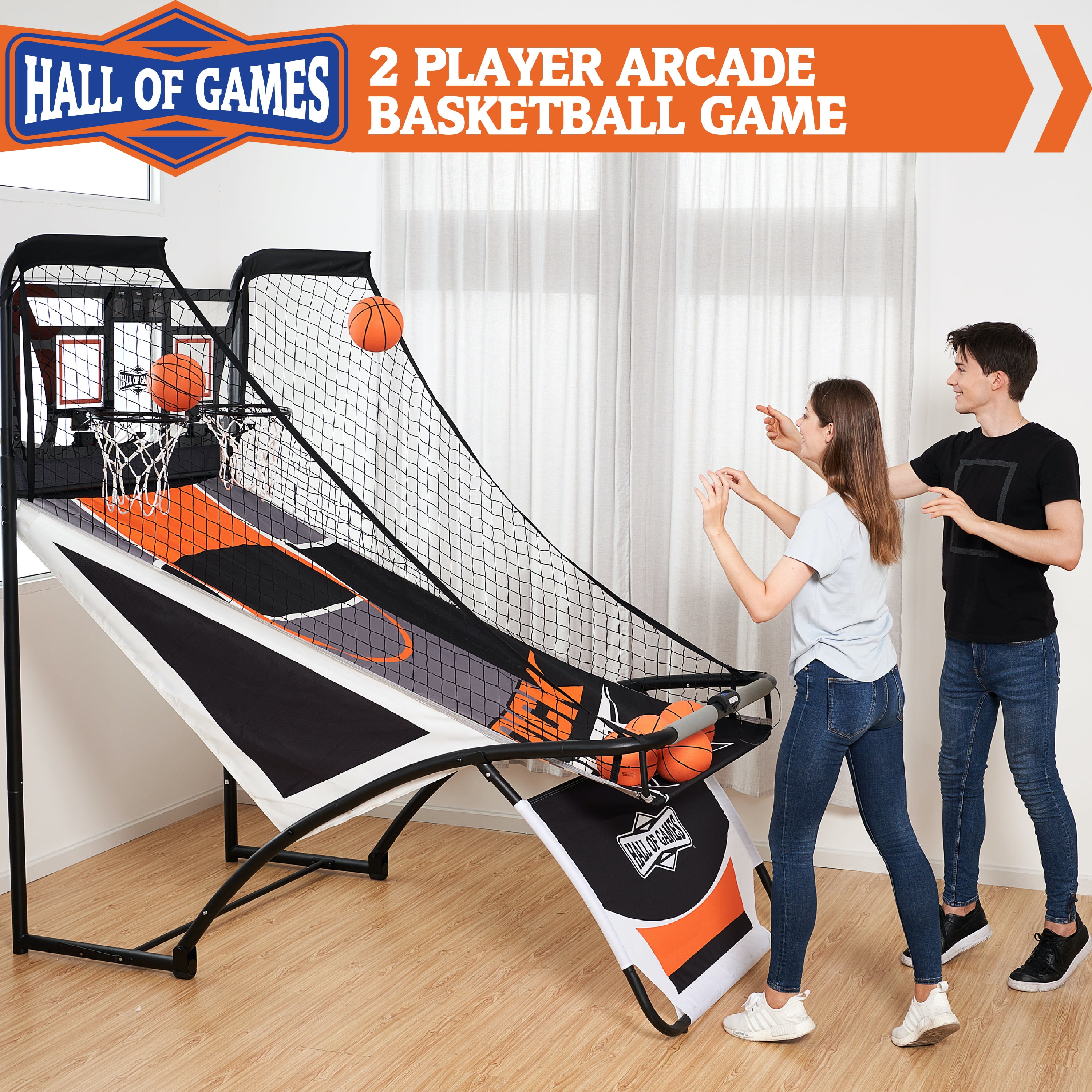 Hall of Games 84” Indoor Steel Frame EZ-Fold Arcade Basketball Game, Dual Shot Electronic Scoring with 6 Size 3 Balls Included, Perfect for Basement Game Rooms 7-ft EZ-FOLD DUAL SHOT: This Hall of Games basketball Arcade has a durable steel frame with dual shot steel rims for two-player fun, it fits great in rooms with 8-ft ceilings and can fold from a playing length of 81” to just 25” for convenient storage. STRONG GAME CONSTRUCTION: This classic indoor basketball game is built for active play with a 1.7” steel tube frame, heavy-duty 600D Oxford cloth ball return, Tetoron netting with double stitched seams, Polycarbonate backboard, and dual 12” steel rims. ACTIVE PLAY & EASY STORAGE: Our foldable design includes two support bars hidden under the side netting that release with the push of a button and two safety lock bars that buckle to the frame for stable storage when you’re done playing. ARCADE-STYLE GAME ACTION: Challenge your friends to 8 different basketball games with sound effects. Scoring is tracked with paddle sensors and displayed on an oversized LED scoreboard with a game clock, requires 4 “AA” batteries (Not included). ROOM SIZE & ASSEMBLY: The recommended room size for this electronic basketball game is 10’ L x 6’ W x 8’ H, to allow for ball flight and movement around the game, assembly of the steel frame, nets, and backboard parts are required, 2 adults are needed. ACCESSORIES INCLUDED: This arcade basketball game includes a 6-pack of orange, Size 3 (7”) rubber basketballs and one air pump with a needle to inflate the basketballs.
