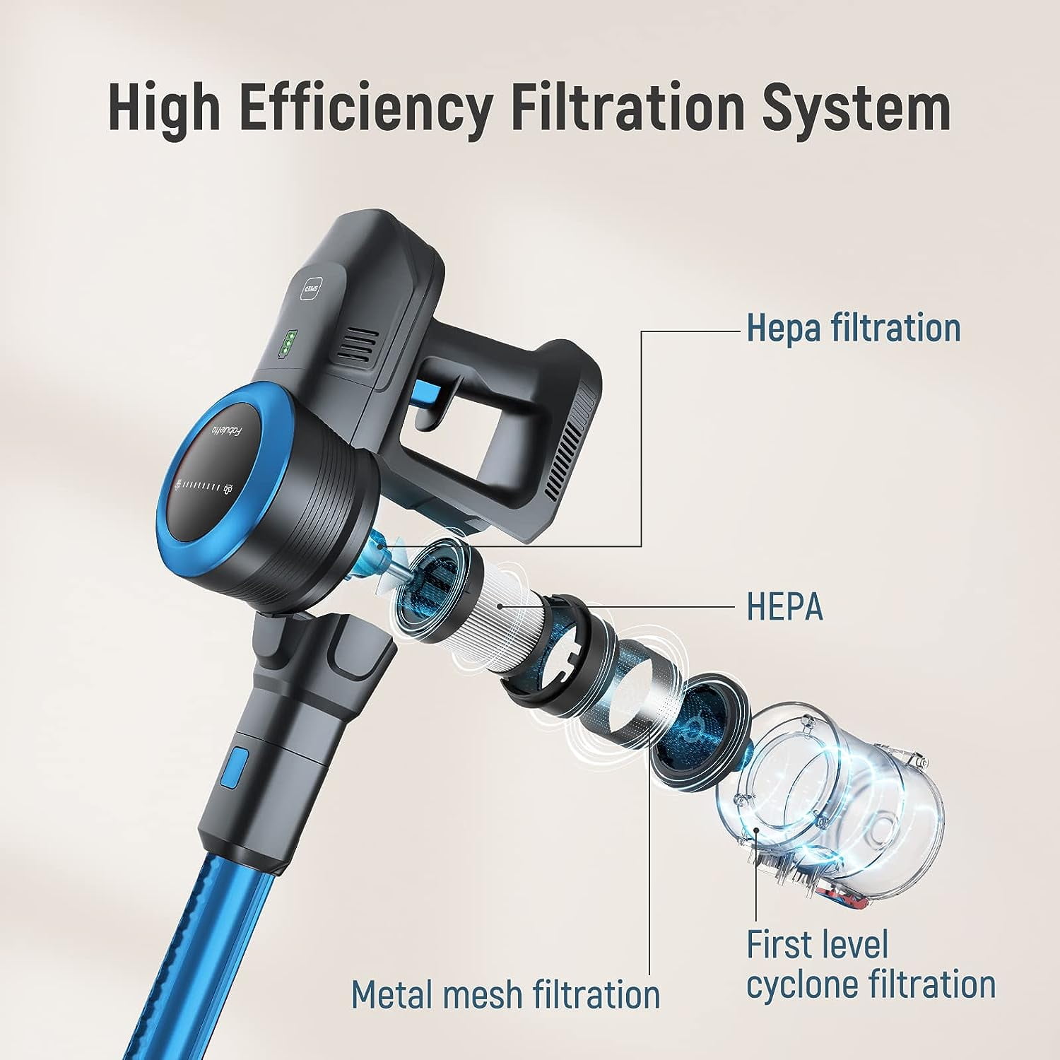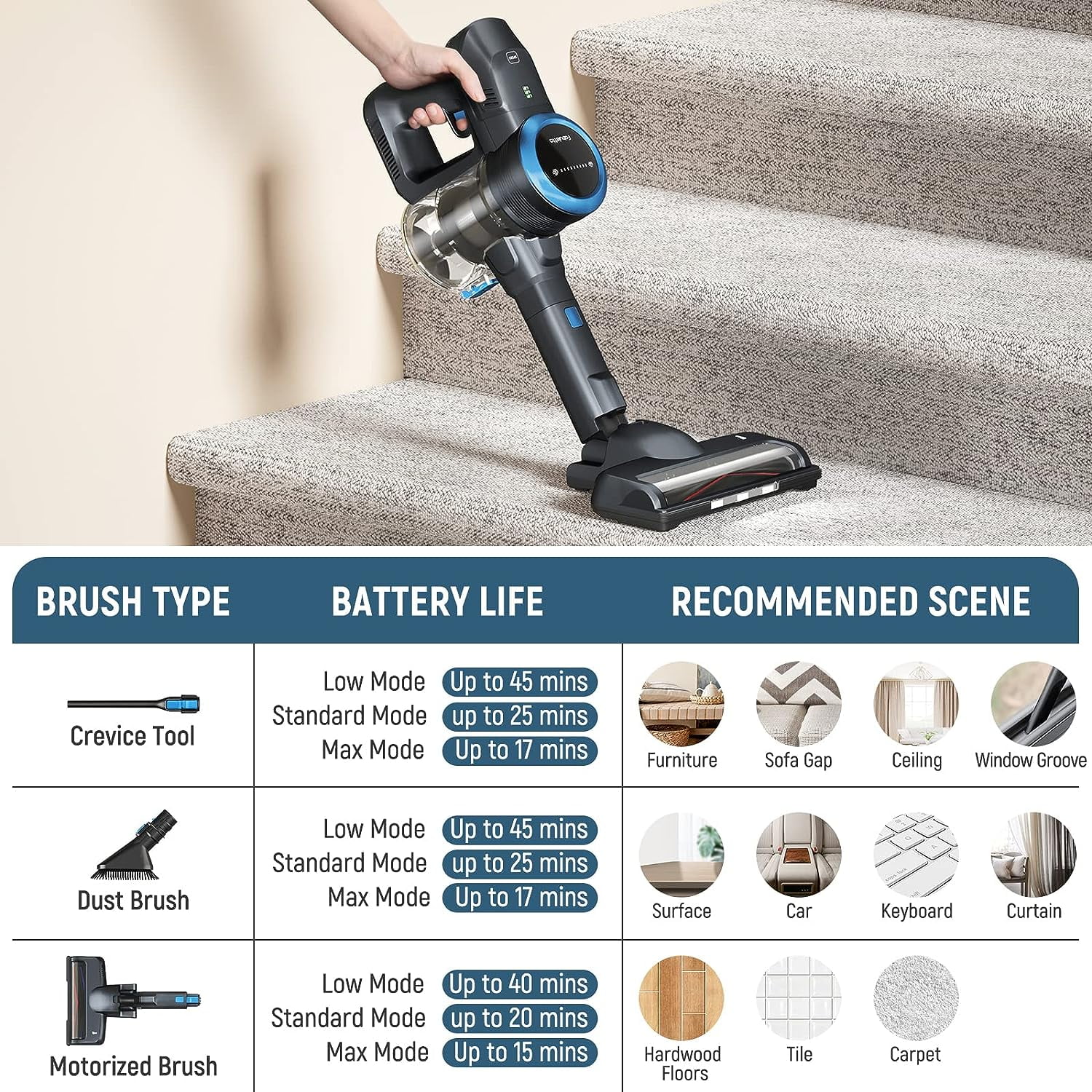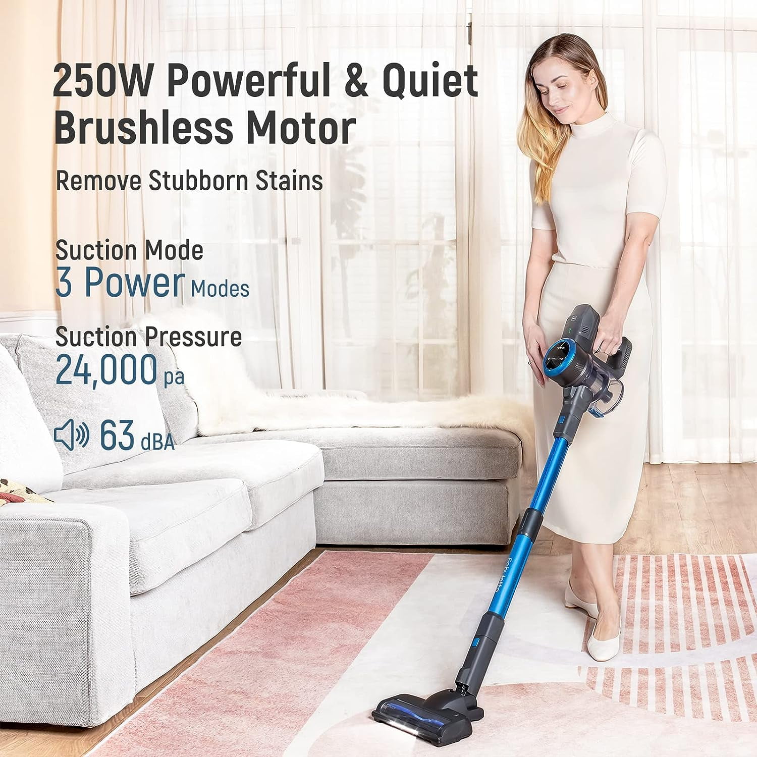 Fabuletta 24Kpa Cordless Vacuum Cleaner, 10-in-1 Powerful Suction Stick Vacuum Cleaner for Hardwood Floor Carpet Pet Hair Car Bed, 250W Brushless Motor, Lightweight Handheld Vacuum Cleaner, Blue