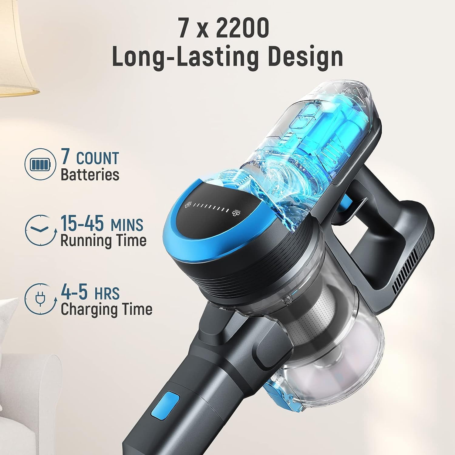 FABULETTA FSV001 Vacuum Cleaner – Powerful and Convenient Cordless Vacuum for Easy Cleaning! Special Features Packaging List 24KPA HURRICANE SUCTION: Upgraded 250W brushless motor generates a high-speed airflow to provide up to 24Kpa crazy suction in max mode. Three suction speeds can be switched freely to meet your various cleaning needs(debris, dust, crumbs, pet hairs, etc.) on sofas, hardwood, marble floor, fluffy , rugs and tile floor. DETACHABLE &LARGE CAPACITY : With 7 x 2200 large-capacity rechargeable power pack, our carpet cleaner vacuum provides up to 45 mins long running time in the standard speed, and MAX speed provides about 15 mins of deep cleaning. The power pack can be charged singly or on its main body. Convenient and safe! EASY REST DESIGN & Light Weight: There is no need to drill the bracket into the wall for hanging, also needn’t lean against a wall, stand the vacuum on the any flat floor when you’re tired. And he Main Body weights just 3.3lbs, our cordless stick vacuum is user-friendly and suitable for people of all ages (including those with back problems). LED DISPLAY & HIGH-EFFICIENCY FILTRATION SYSTEM: Fabuletta FSV101 cordless stick vacuum with LED display will show suction level, brush roller cleaning indication and HEPA filter cleaning indication.Our all-new cyclone technology and high-density meshing helps clean up to 99.97% of the microscopic dust particles as small as 0.3 microns. It can provide ultimate purified air for you families. Note: HEPA is washable and recyclable.and there is an additional filter as a gift. ULTRA QUIET: Ultra-quiet operation sound(<65 dB) avoids annoying noise, friendly to your baby and pet. No worry about after sales, we offer 12-month 100% satisfactory after-sales service.