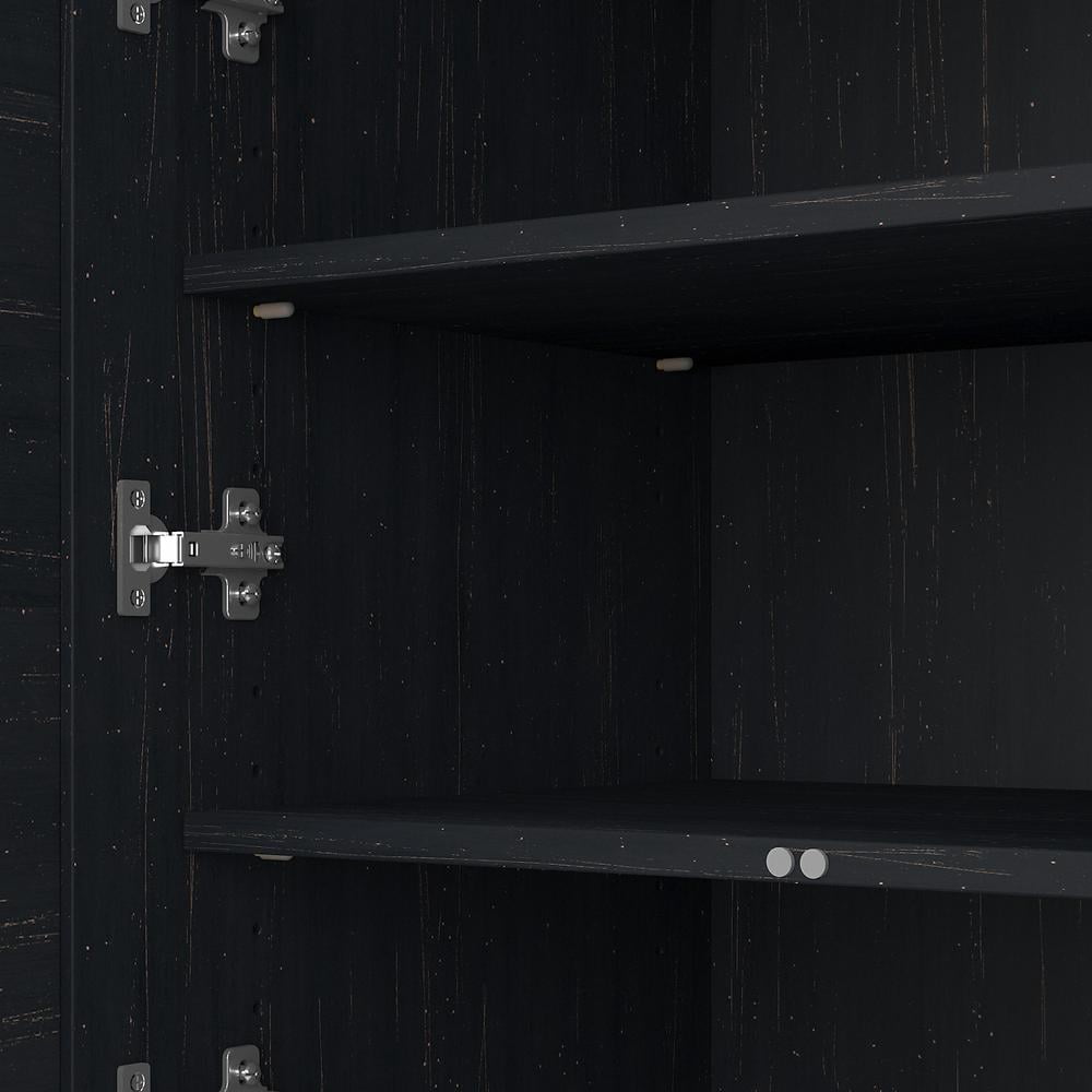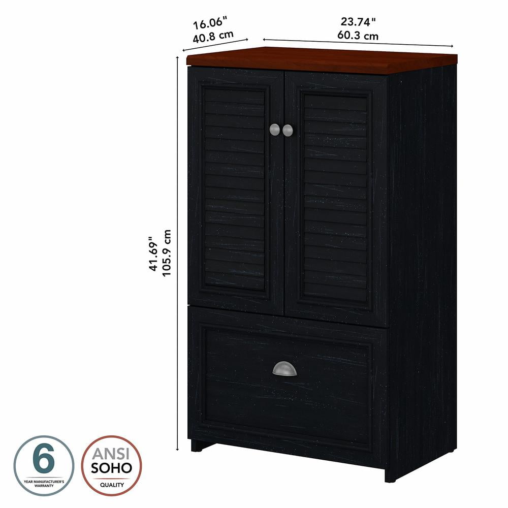 The Bush Furniture Fairview 2 Door Storage Cabinet with File Drawer is a great way to organize any home office or living space while invoking the cozy, welcoming charm of modern farmhouse styling. A slightly weathered finish pairs with Antique Pewter hardware to create a casual appearance, and durable construction promises to withstand years of regular use. This versatile accent cabinet features stylish louvered doors that conceal three shelves, two of which can be adjusted to store items of various sizes. The file drawer opens on full-extension ball bearing slides for an effortless reach to letter, legal and A4-size paperwork. The back panel has punch out holes for wire management and ventilation, making it an ideal choice for storing your laptop and other devices. This farmhouse cabinet is tested to meet ANSI/SOHO standards for safety and performance and is backed by a 6 Year Warranty. Materials: Engineered wood and Laminates Features: 24W x 16D x 42H Storage Cabinet with File Drawer is great for organizing virtually any home office or living space Two stylish louvered cabinet doors conceal household items, office supplies and more Two adjustable shelves and one fixed shelf accommodate materials of various sizes; each shelf supports up to 50 pounds File drawer opens on smooth full-extension ball bearing slides for an effortless reach to letter, legal and A4-size paperwork Cabinet’s back panel includes punch out holes for wire management and electronic ventilation Distressed finish options include solid Cape Cod Gray, Antique White with Tea Maple, Pure White with Shiplap Gray or Antique Black with Hansen Cherry Antique Pewter hardware completes the farmhouse cabinet’s casual style Tested to meet ANSI/SOHO quality standards for safety and performance Backed by the Bush Furniture 6 Year Manufacturer’s Warranty See the full line of coordinating items available Specifications: Product Dimensions: Lateral File Storage Cabinet: 23.74″W x 16.06″D x 41.69″H Product Weight: 76 lbs Assembly Required: Yes Product Color: Antique Black/Hansen Cherry