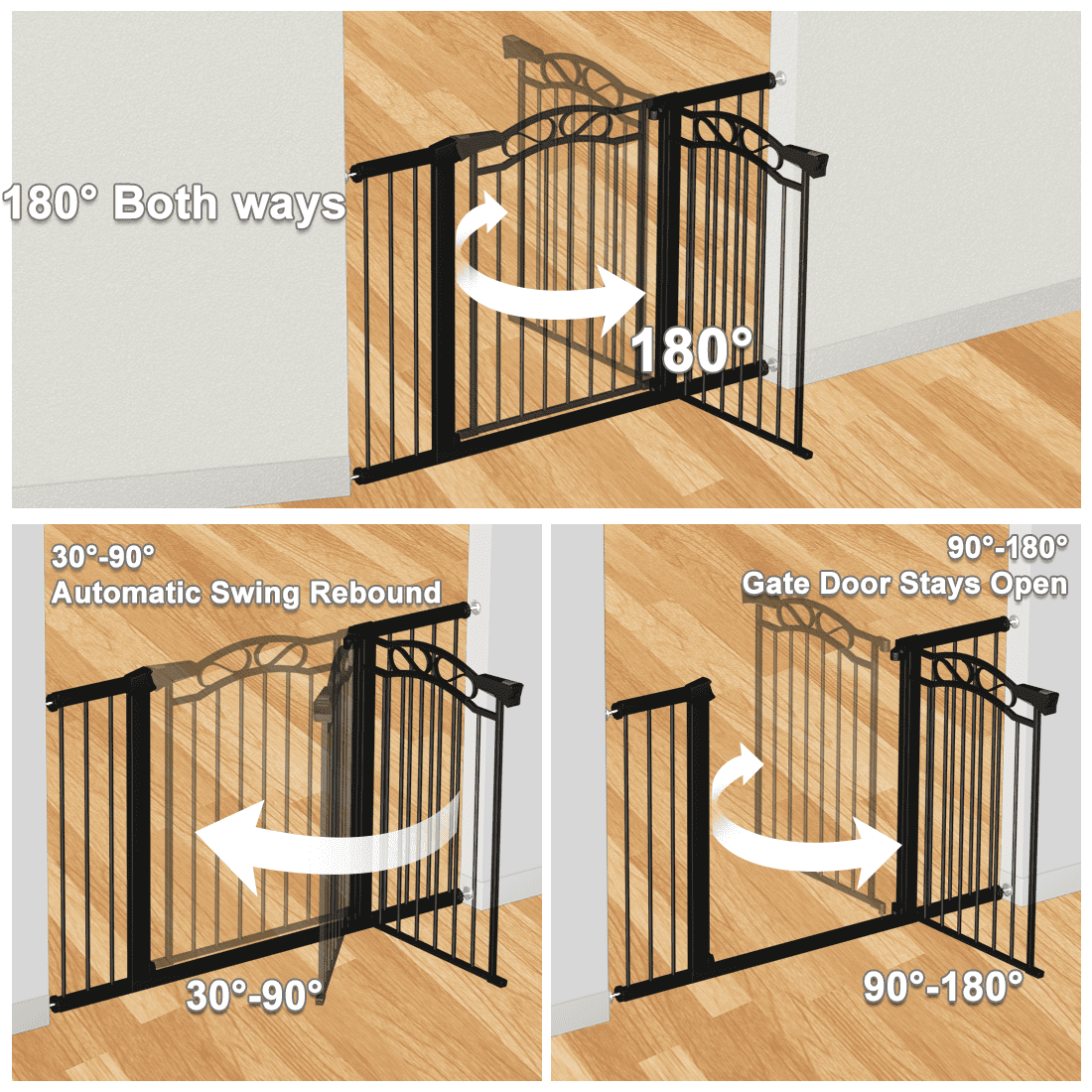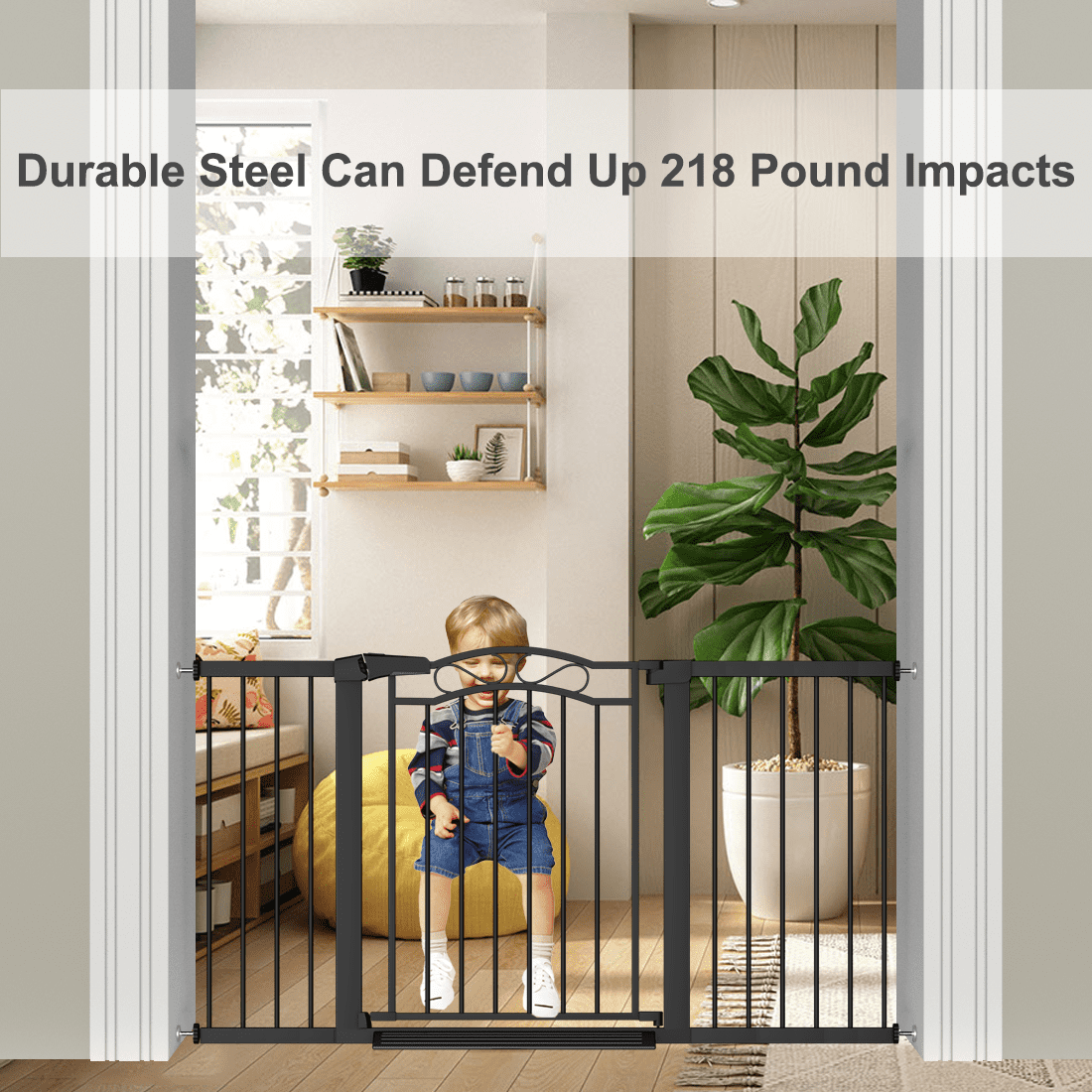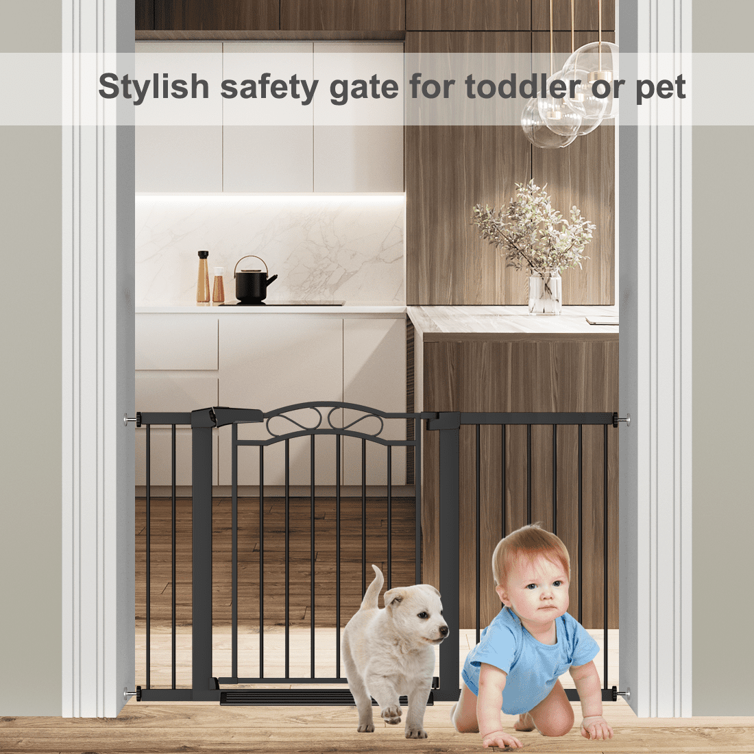 Reliable and sturdy solution for ensuring the safety of children or pets at home Fits most standard doorways, hallways, or staircases with a width range of 29.5 – 35 inches Easy installation without additional tools walk-through design allows convenient passage for adults while keeping the gate securely locked One-hand open feature for easy operation while carrying a child or other items Sleek and modern black metal frame blends seamlessly with any interior style Adjustable width for customizable fit in various areas of the home provides peace of mind by protecting children or pets from potential hazards while allowing them to freely explore within safe boundaries.