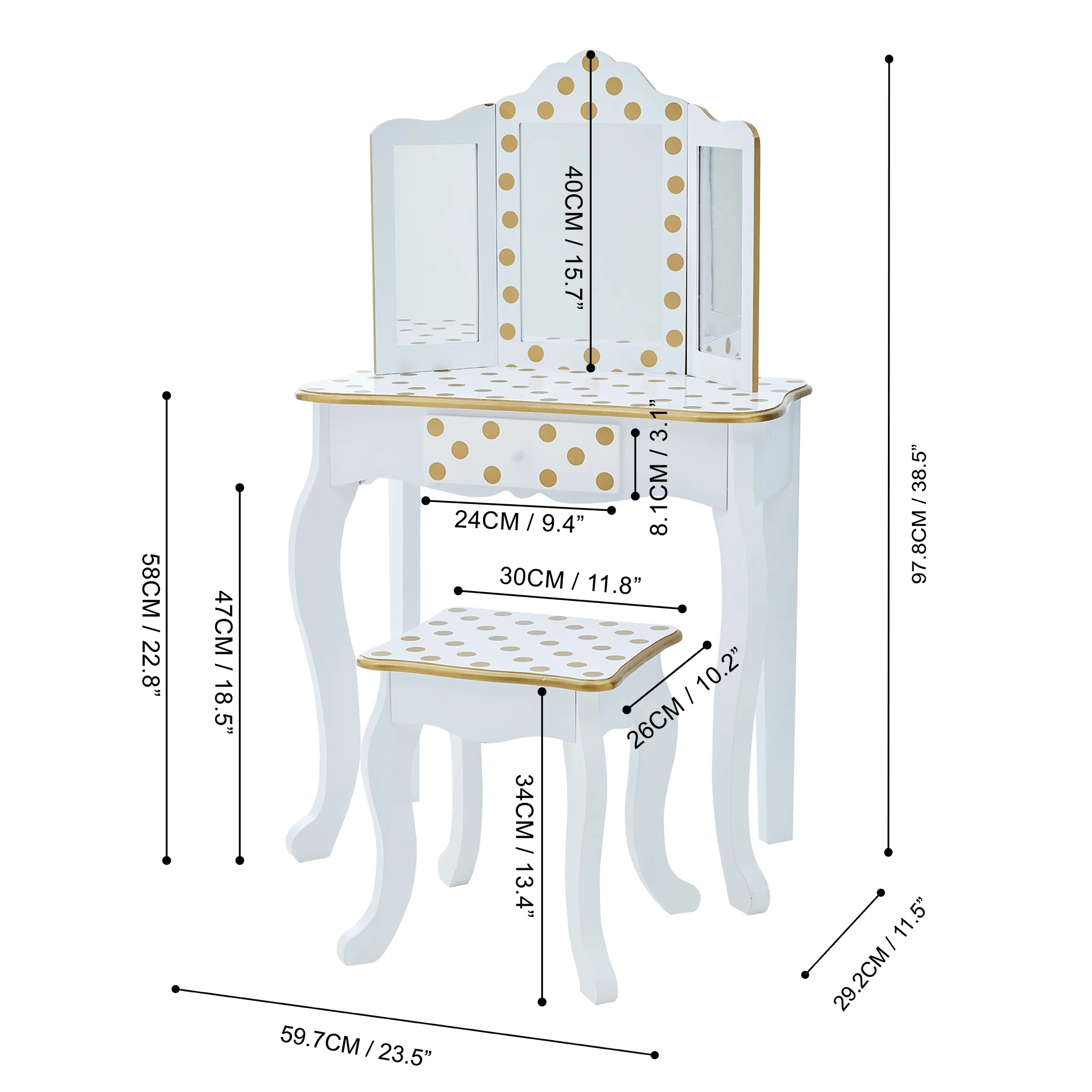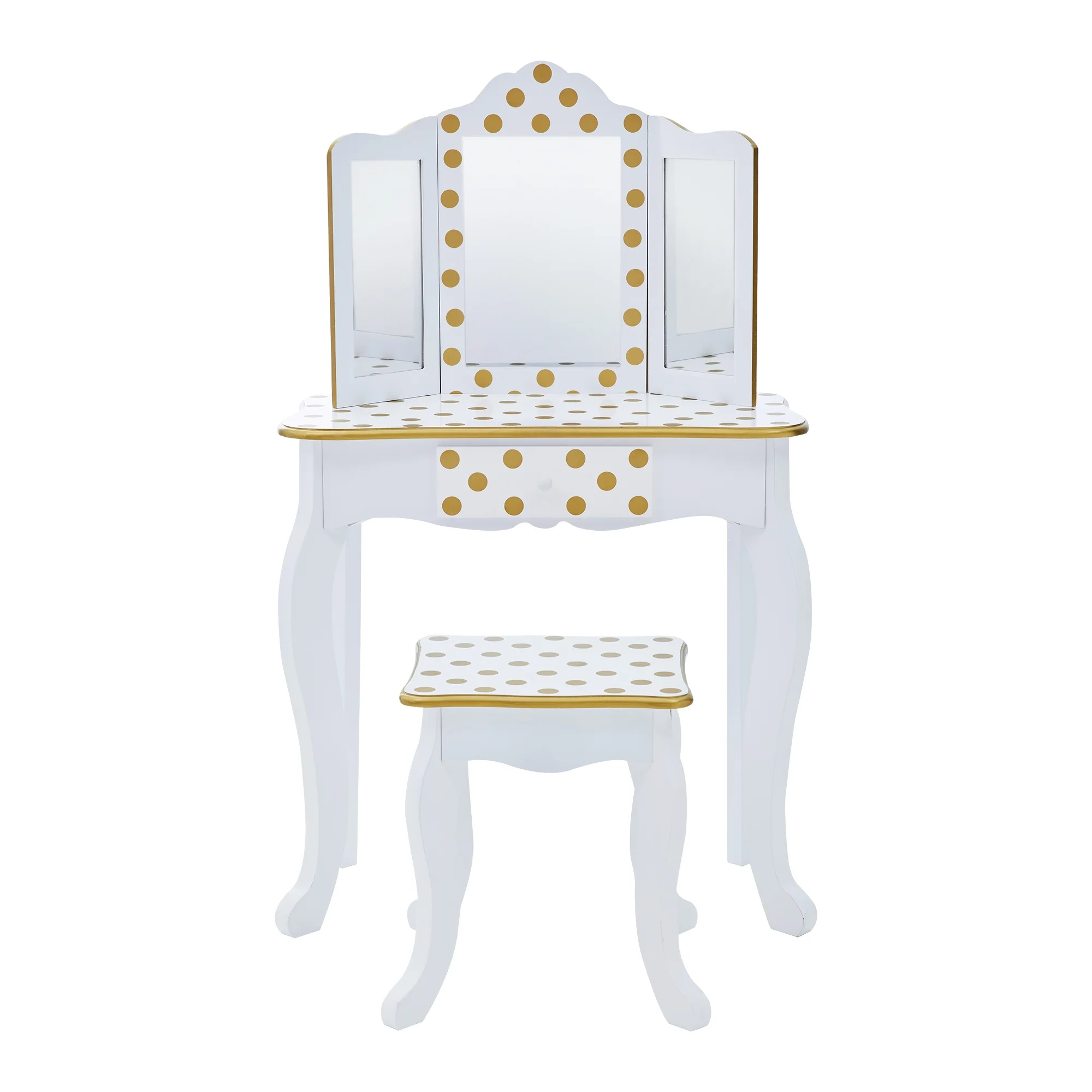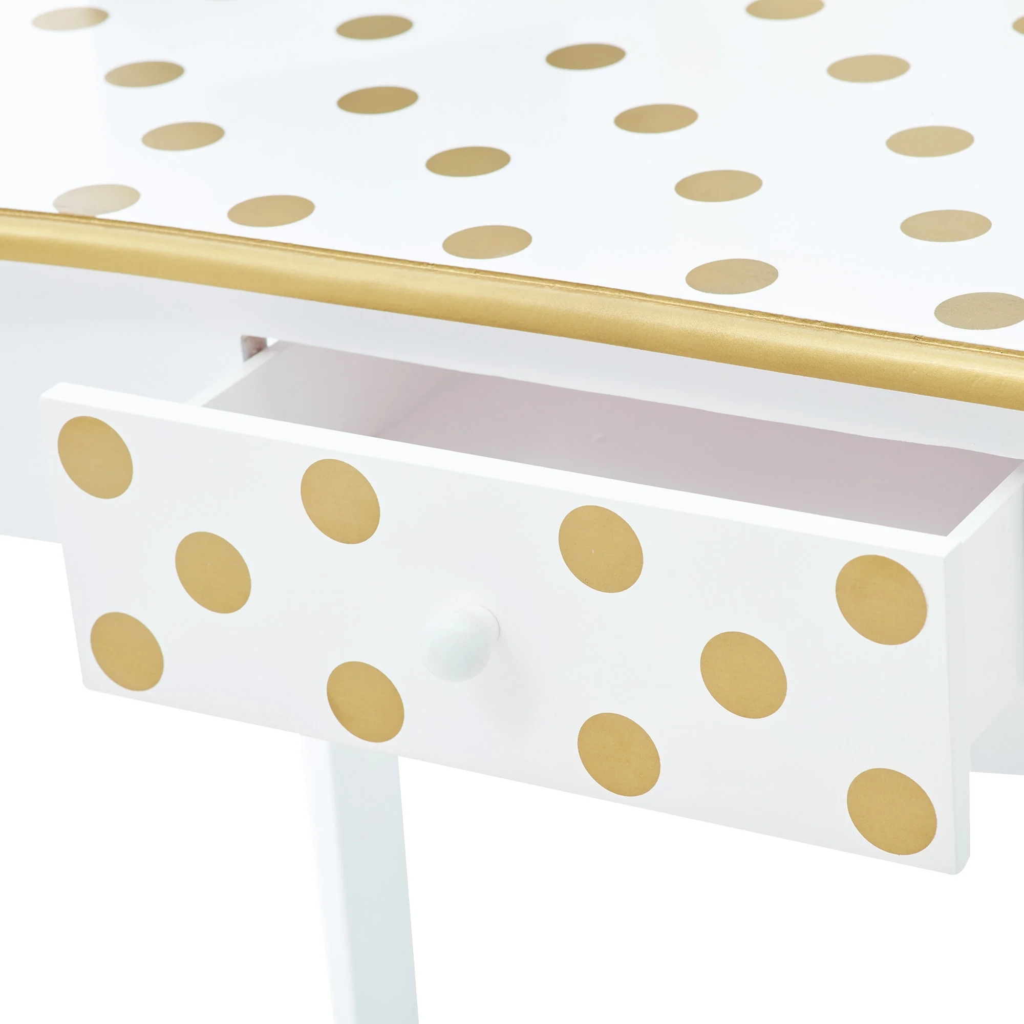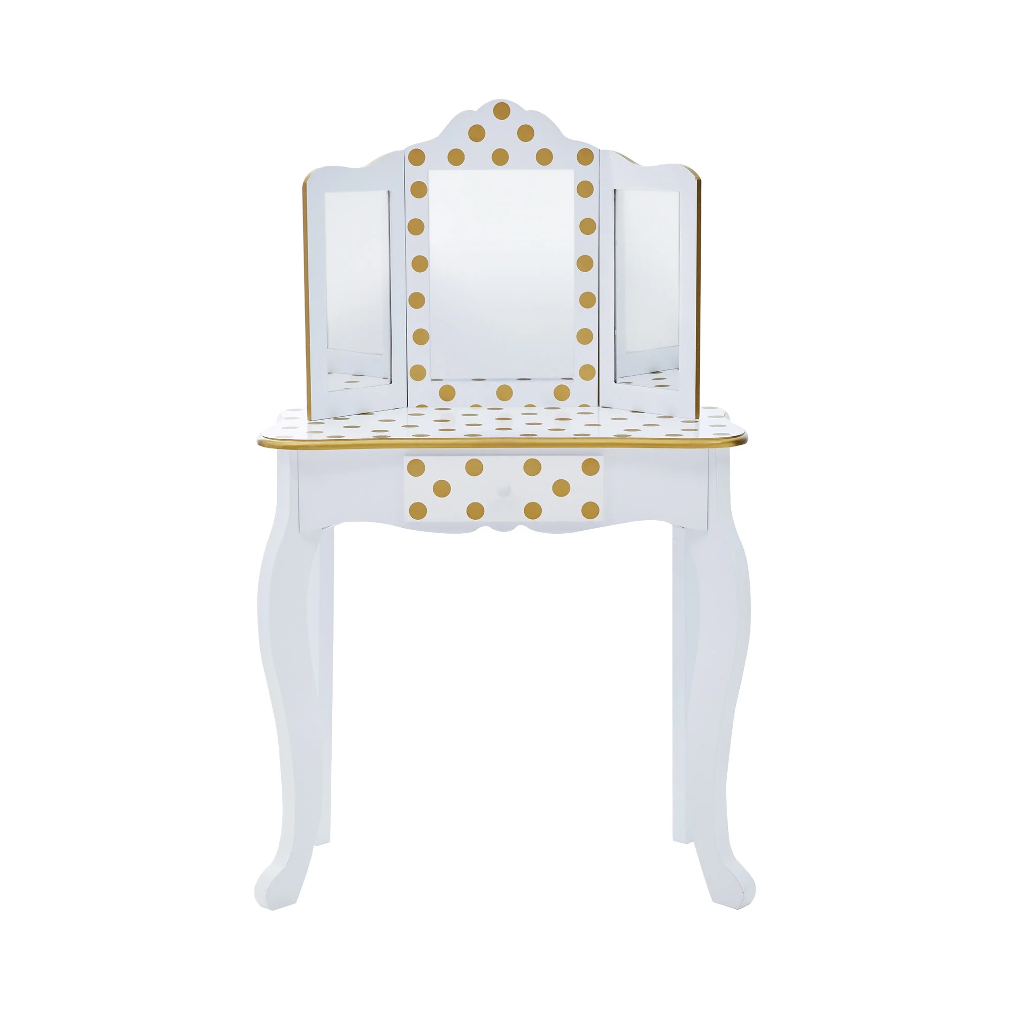 Kids Vanity Table and Stool Set with Mirror – Fantasy Fields Princess Gisele, White/Gold Polka Dot