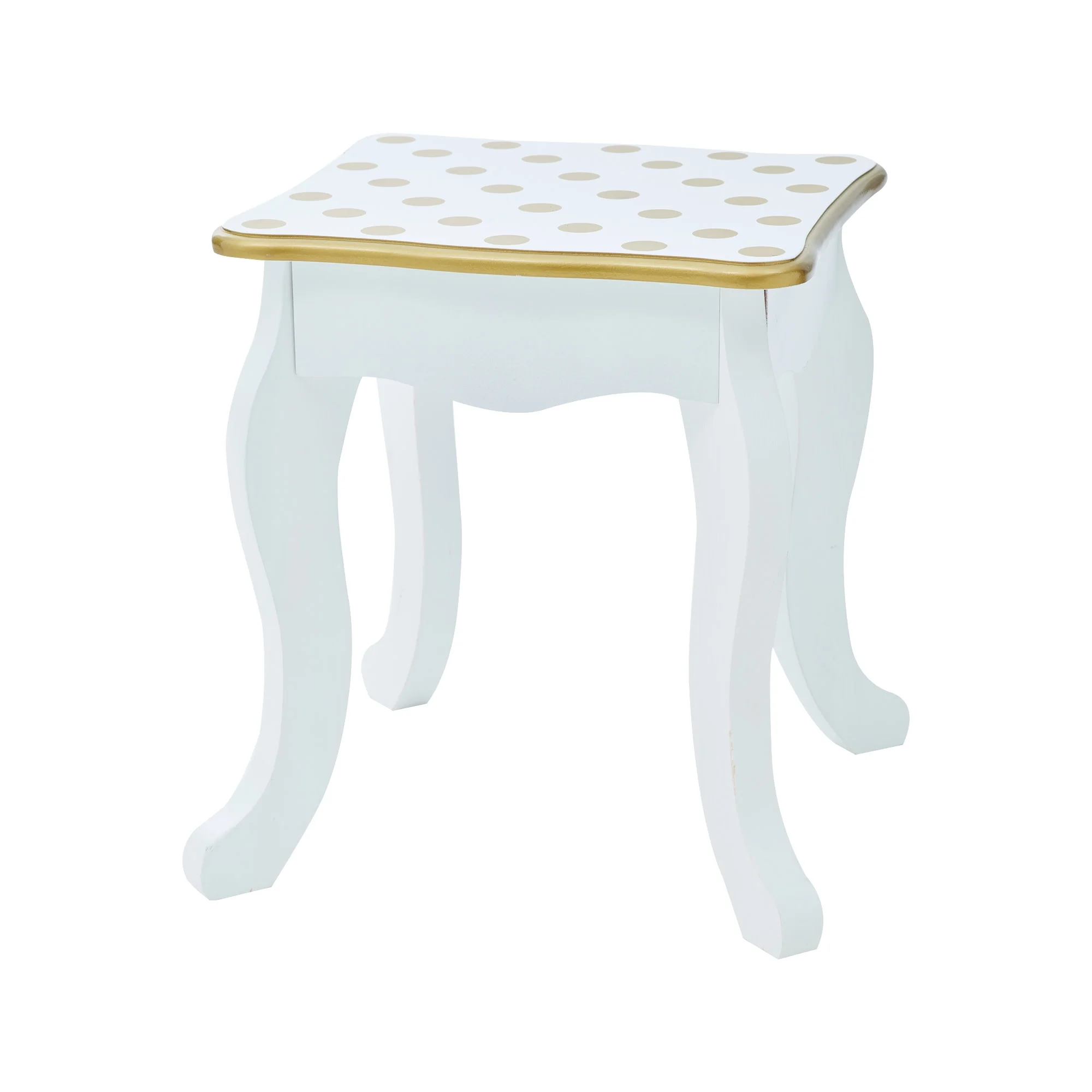 Little Princess Gisele’s Polka Dot Print Wooden Vanity Playset is a fun addition to playing dress-up. Made of durable wood with rounded corners and carved cabriole legs, the vanity table features a tri-fold acrylic mirror and a small drawer with plenty of space for makeup, jewelry, brushes, and other must-haves. The matching stool features the same white finish with golden polka dots and trim. Compact in size to fit in a playroom or bedroom.