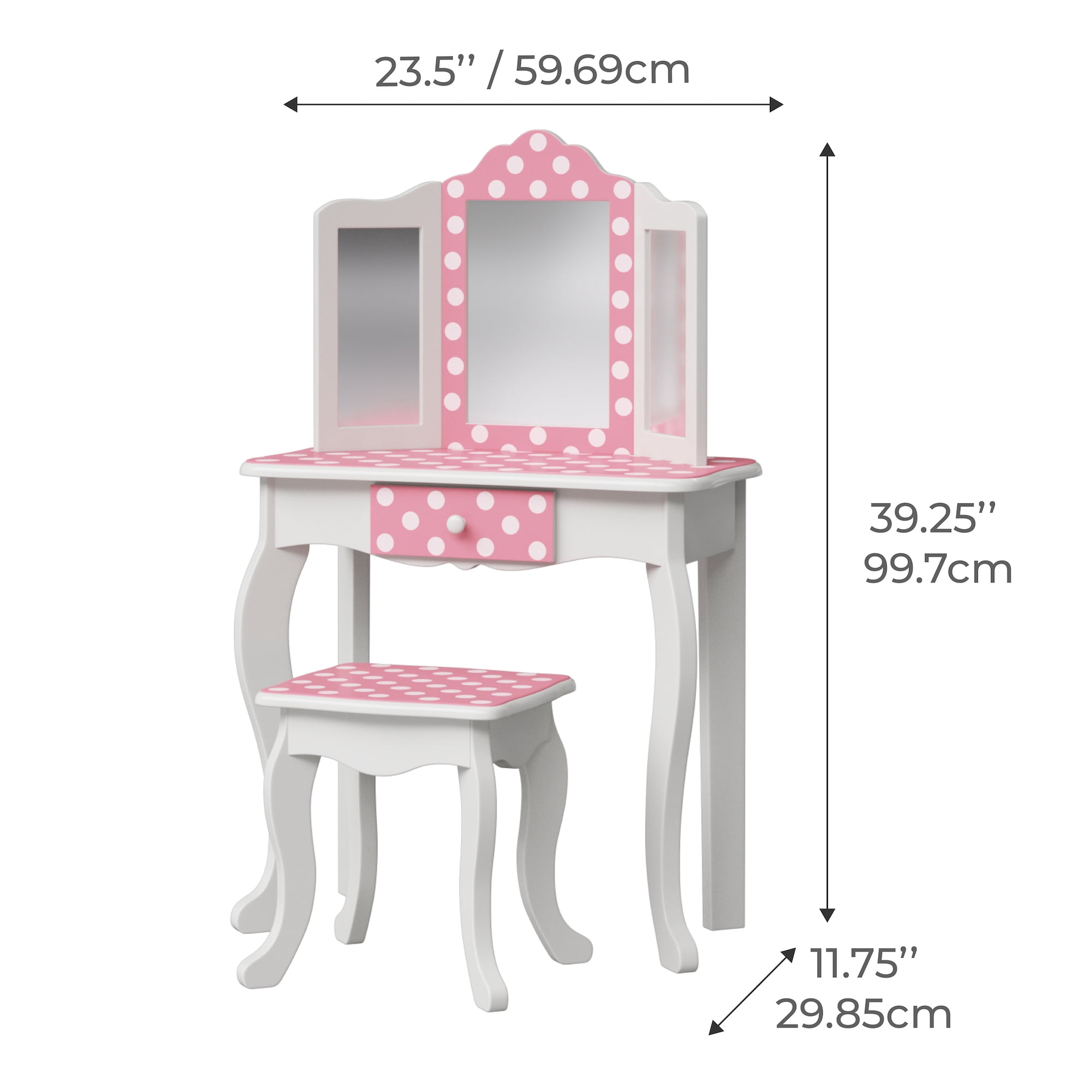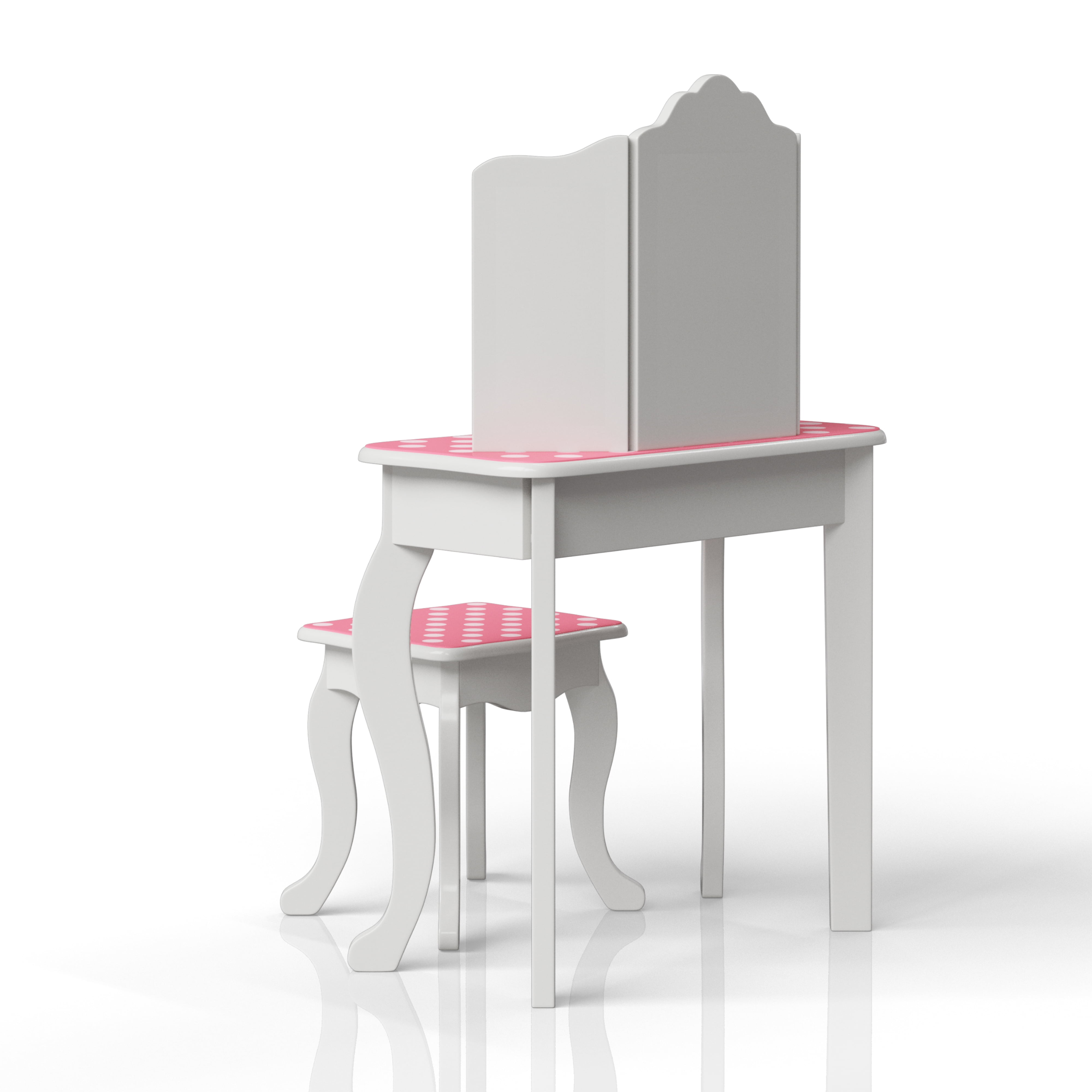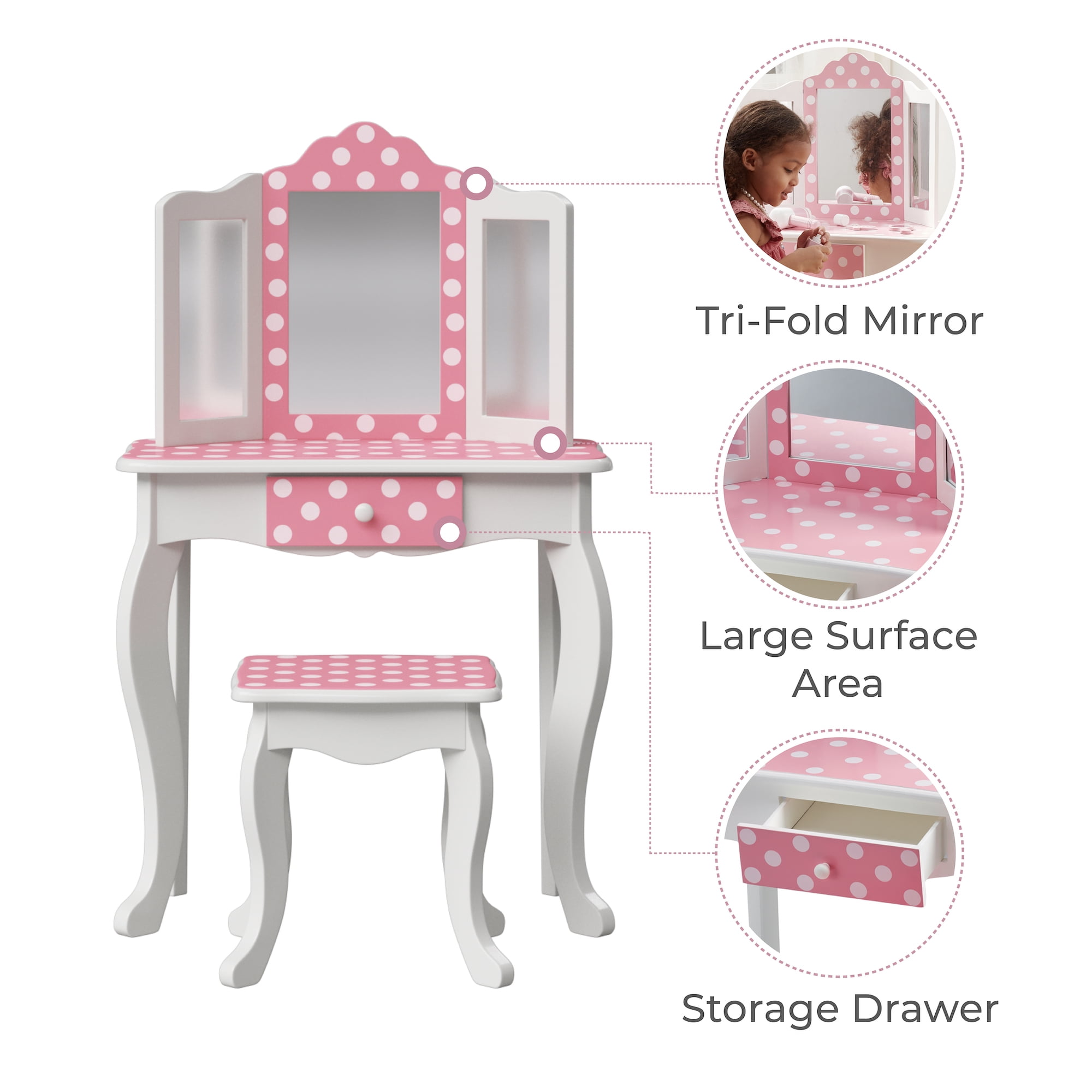 Fantasy Fields Gisele Polka Dot Wooden Kids Vanity Table & Stool Playset with Tri-Fold Mirror, Storage Drawer, White & Pink