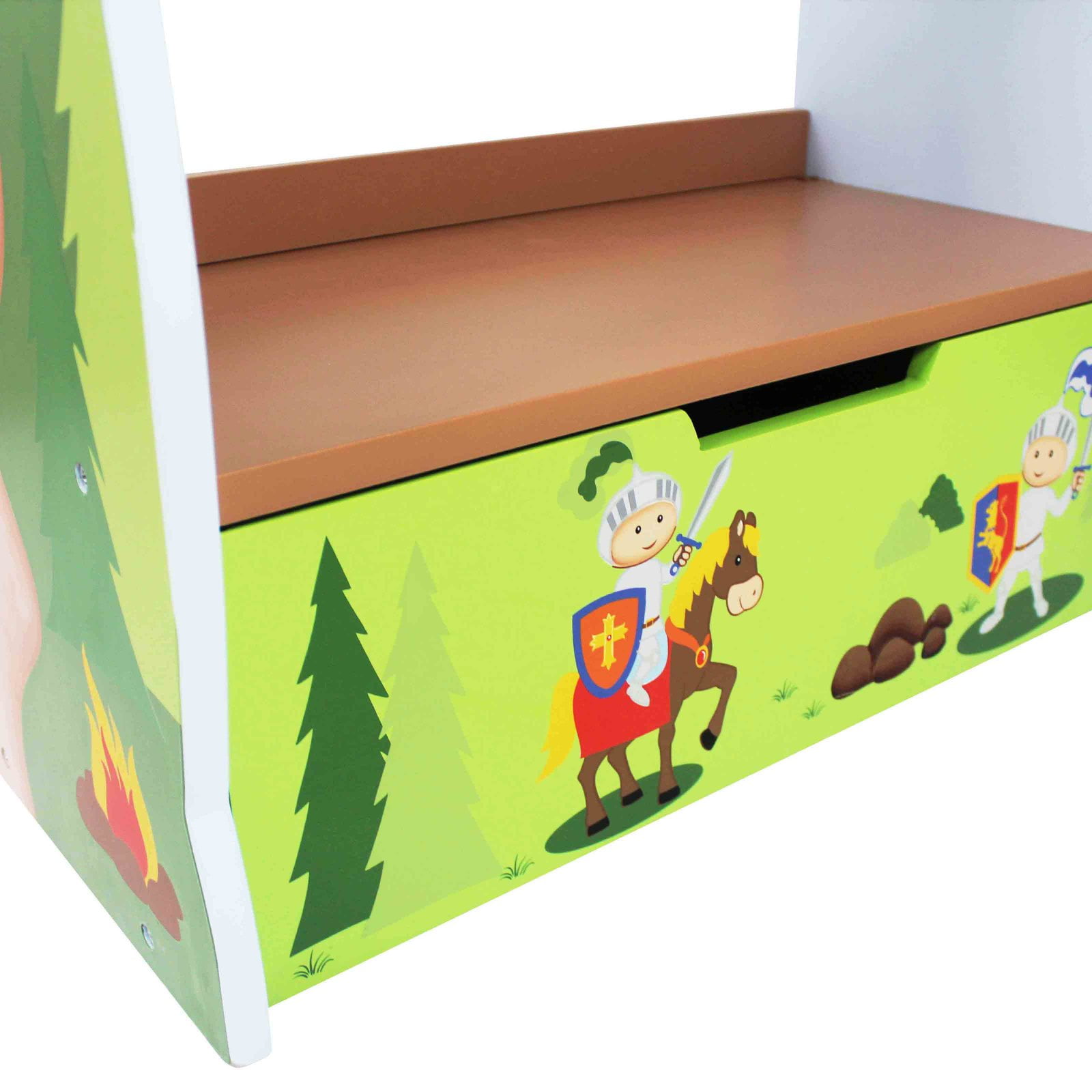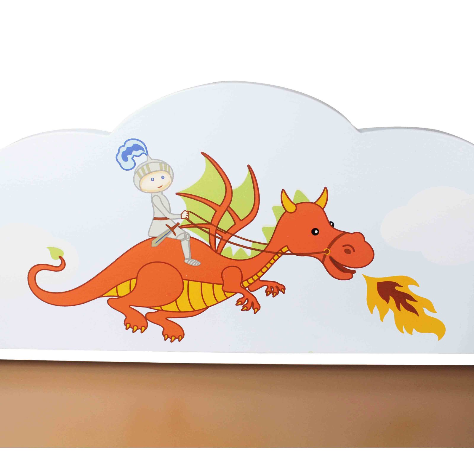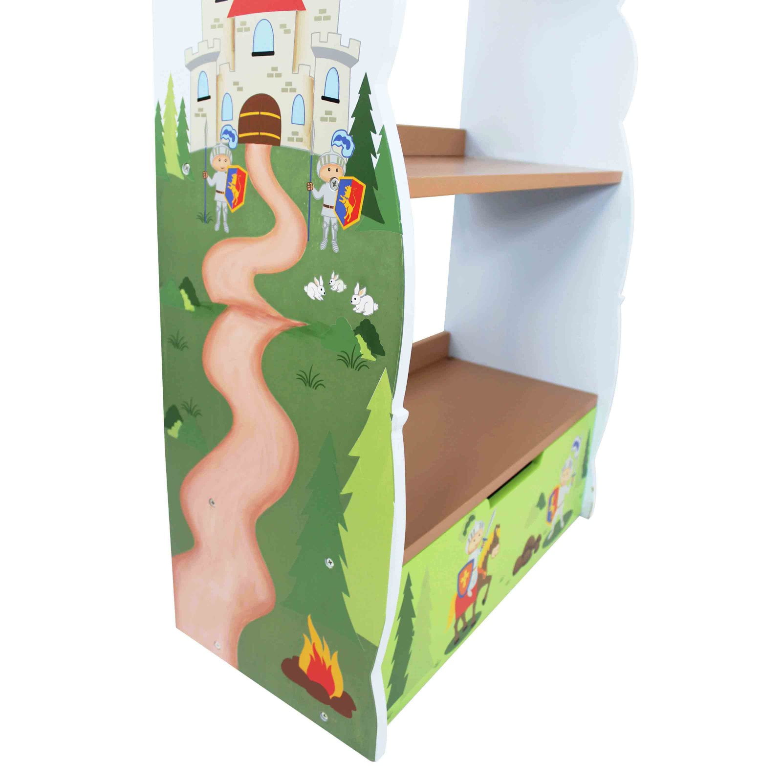 Provide your youngster with a home for Harry Potter novels or Magic Treehouse chapter books with the Fantasy Fields Knights & Dragon Bookshelf. This sturdy bookshelf is made from solid hardwood and medium-density fiberboard, hand-carved and hand-painted with bright, nontoxic water-based paint. Three fixed shelves are included, both long and deep to accommodate oversized picture books, comic books, chapter books, and more. A pull-out storage drawer is built into the bottom of the unit, making a handy toy box. The sides and drawer-front come with a thrilling fantasy design with a knight-riding dragon on the top, jousting knights on the drawer, and a castle scene on the sides.