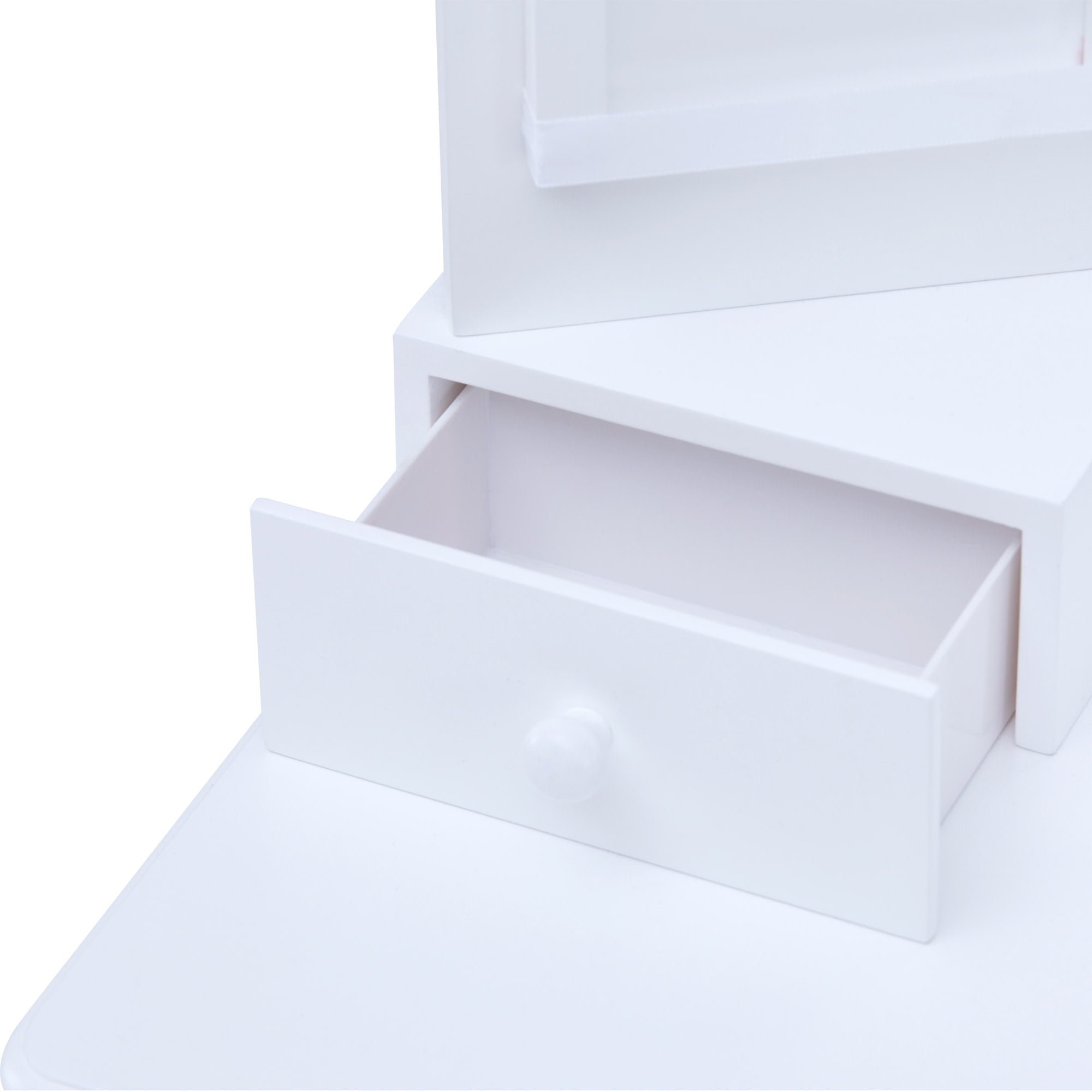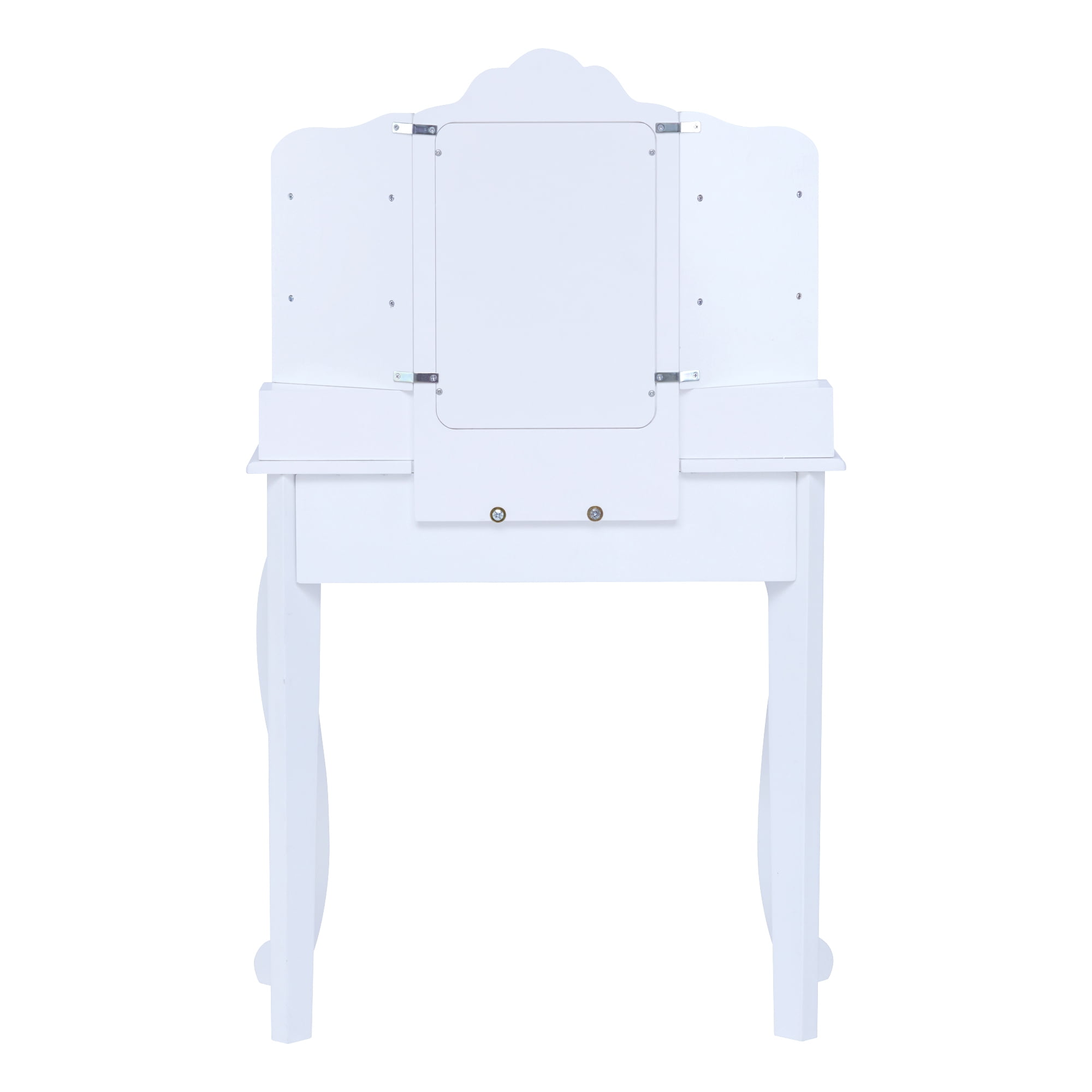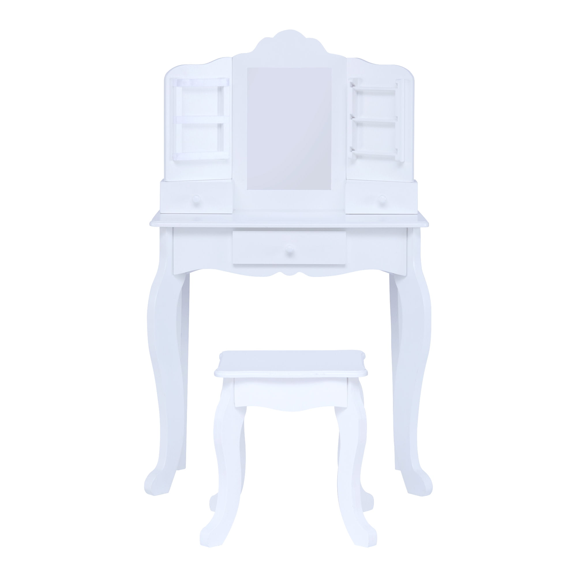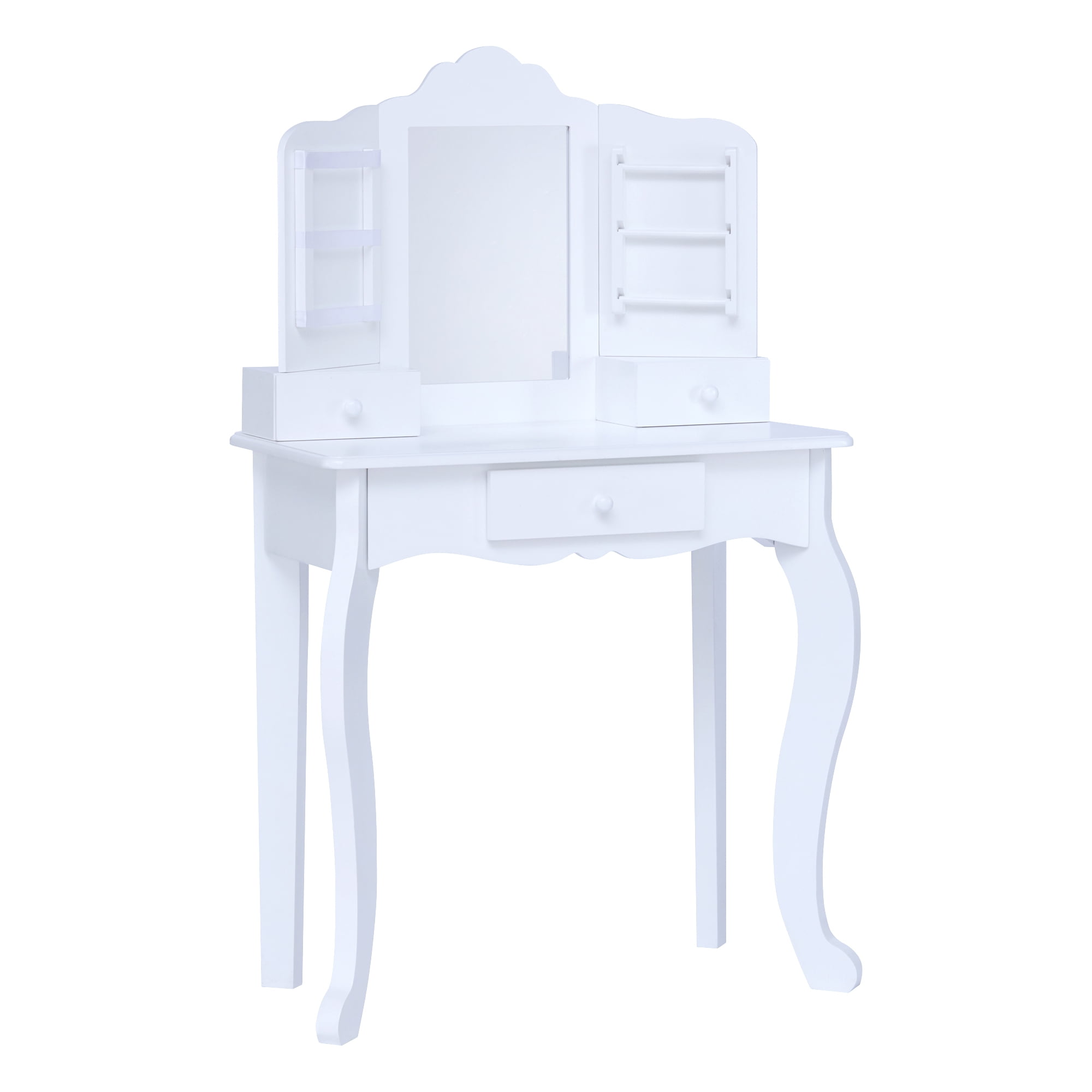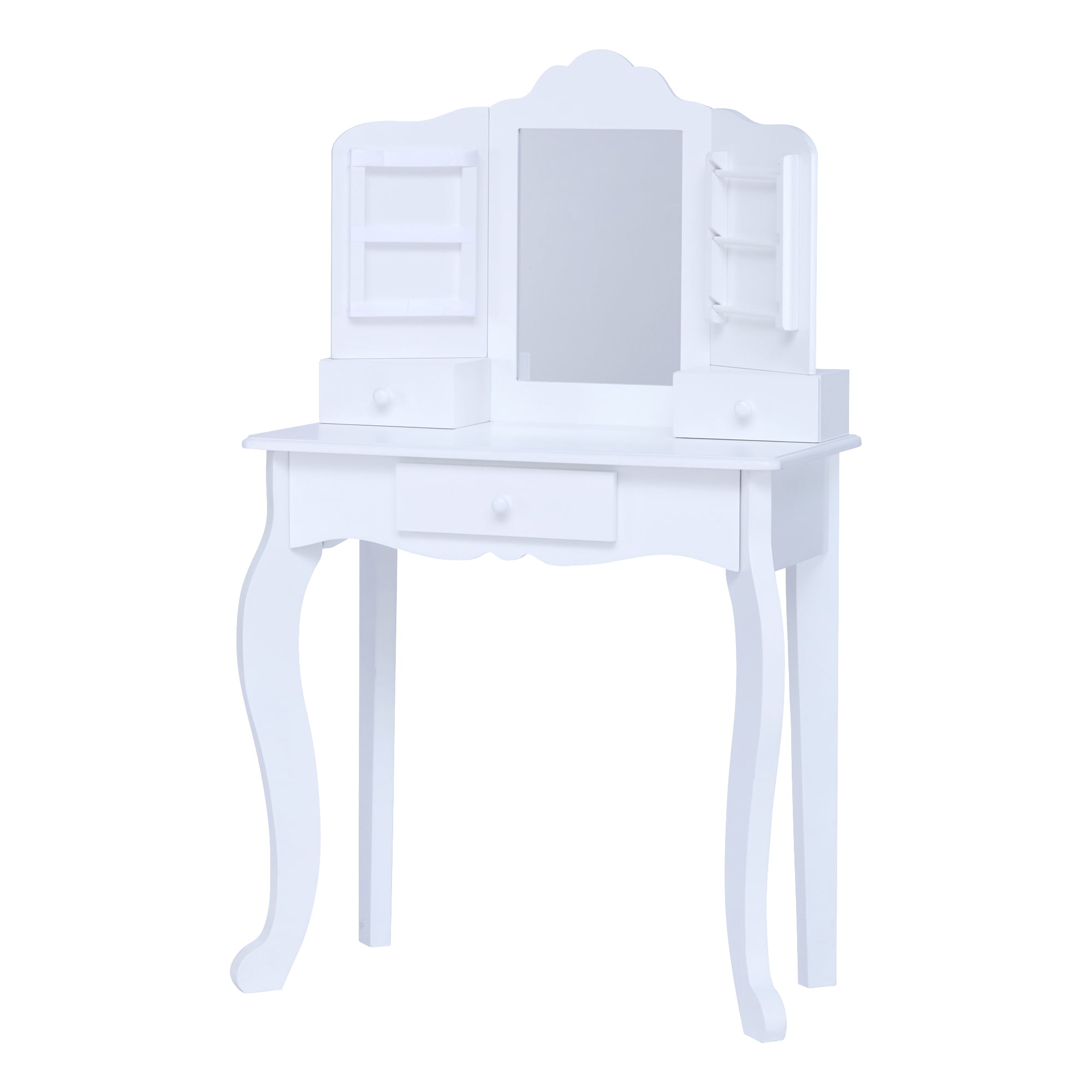 KIDS VANITY TABLE: Features a scalloped design in a classic white finish for an elegant and functional addition to your child’s bedroom or play area. COMPLETE SET: Includes a center mirror and coordinating stool to make getting ready easy. BUILT-IN STORAGE: Three built-in drawers, three satin hanging ribbons, and three removable storage bars provide plenty of space for makeup, brushes, jewelry, earrings, and other accessories. MADE WITH EASY-TO-CLEAN MDF: Durable MDF construction with rounded corners is kid-safe and easy to wipe clean, and the unbreakable plexiglass mirror provides better reflection and long-lasting use. KID-SIZED DIMENSIONS: Vanity measures 23.5″ long, 11.75″ deep, and 37.25″ tall and stool measures 11.75″ long, 10.25″ deep, and 13.75″ tall when assembled to fit in any play area, and the set is recommended for children ages 3 and up.