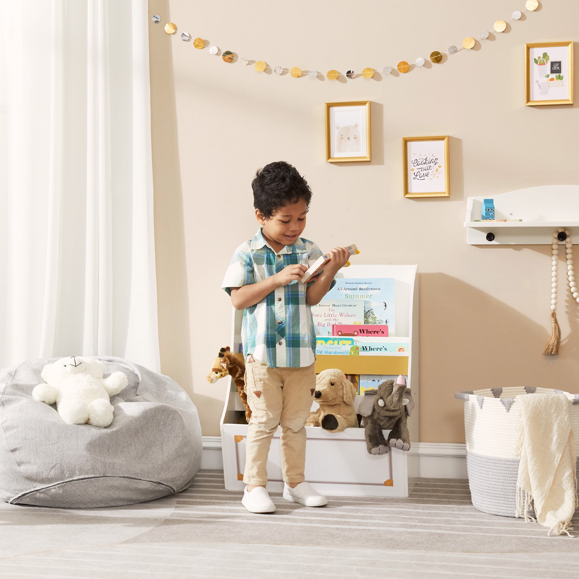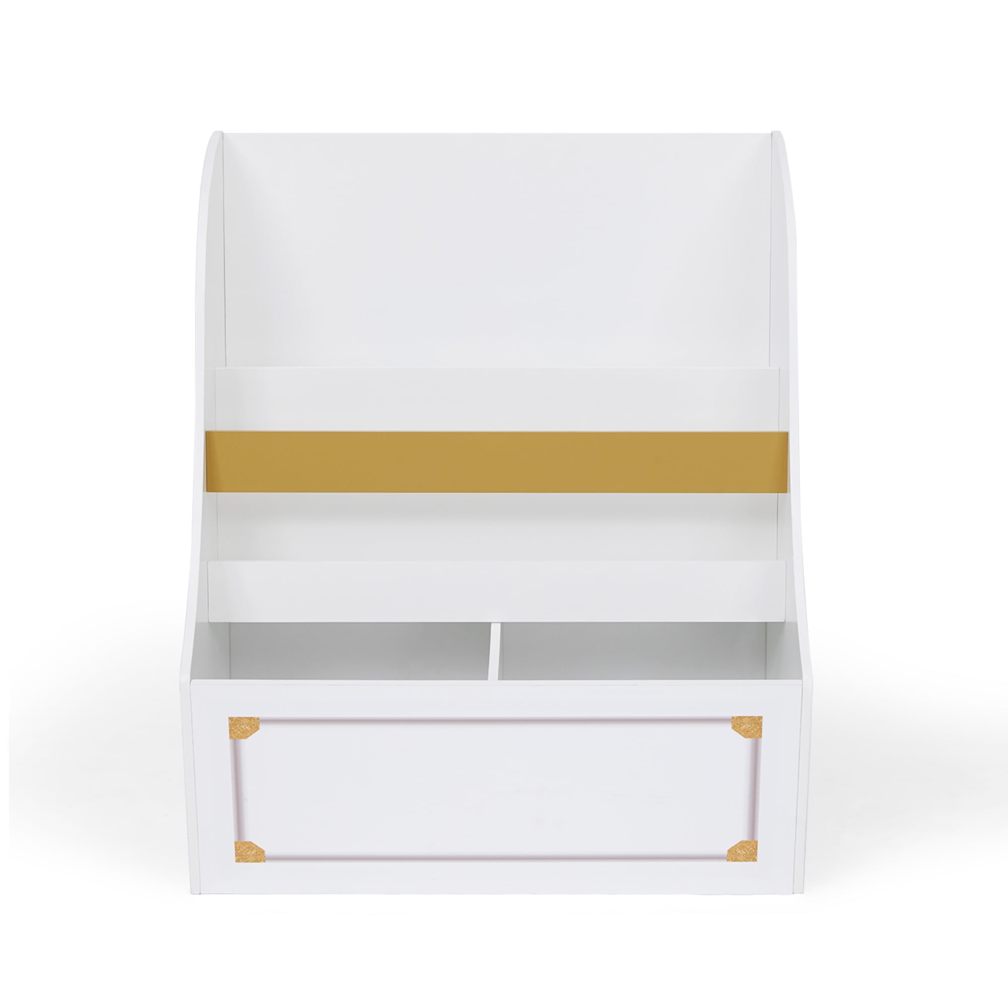 Now your little one will can easily clean up their books and toys on their own with Fantasy Fields’ Versailles Bookcase. Two tiers allow books to display at multiple levels so those favorite bedtime stories can be found quickly and two bottom cubbies are ideal for storing stuffed animals and toys within reach. The white finish, gold accents, curved profilFantasy Fields Versailles Wooden Display Bookcase features two tiers of angled shelves perfectly sized for displaying children’s books with their colorful covers facing forward. In a classic white finish with decorative, rounded curves and golden accents, it includes two spacious cubbies that offer ample storage for additional books, toys, or keepsakes. Crafted from smooth, solid wood, this decorative storage option complements bedrooms, playrooms or grown-up spaces in the home.e and printed graphic make this an elegant storage solution for your little one’s bedroom or playroom.