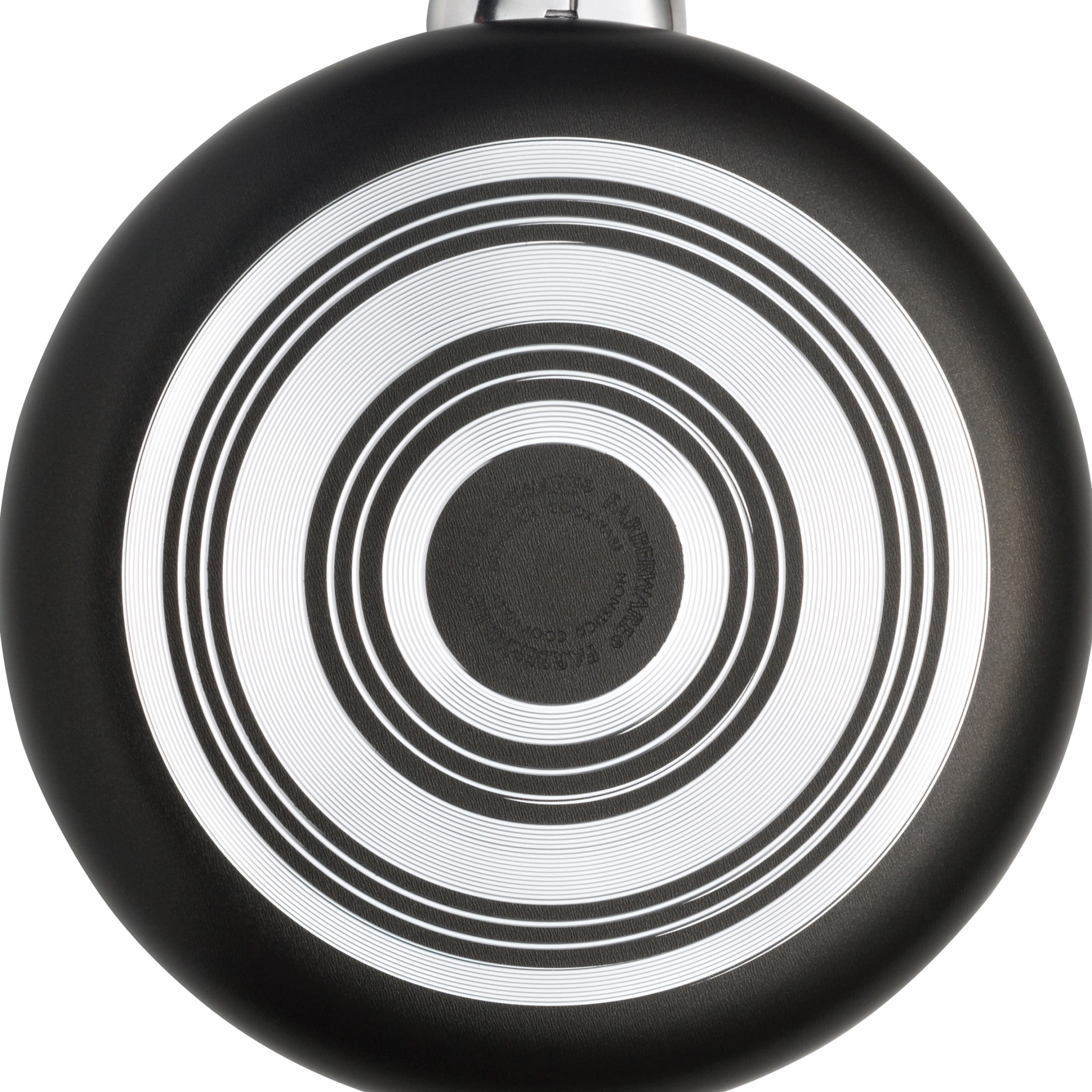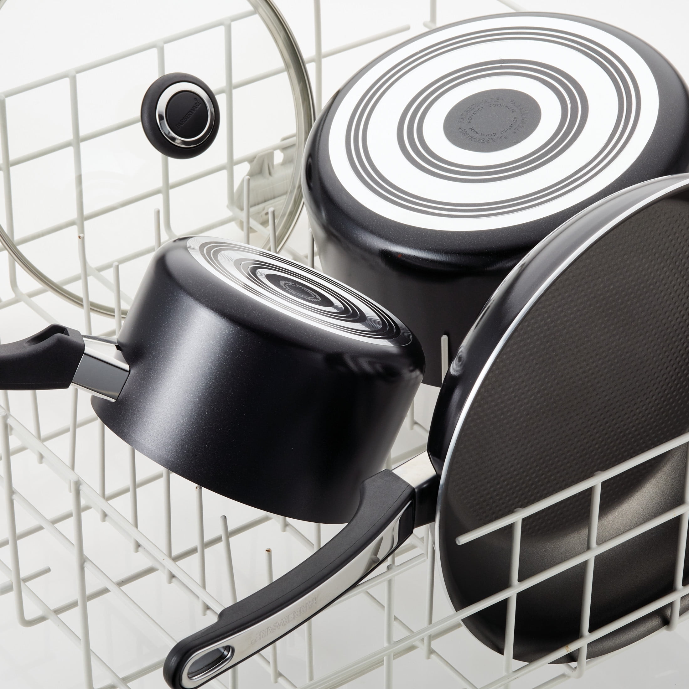 Farberware 17-Piece High Performance Nonstick Aluminum Pots and Pans Set/Cookware Set, Black: DURABLE, QUICK TO HEAT COOKWARE SET: Nonstick cooking set is constructed from heavy-duty aluminum that heats evenly to eliminate hot spots PREMIUM NONSTICK COOKWARE: The frying pans and griddle boast the unique dimpled surface of the Smart Glide Nonstick System SET INCLUDES: 1- and 2-Quart Saucepans with Lids, 5-Quart Dutch Oven with Lid, 8-Inch Frying Pan, 10-Inch Frying Pan with Lid, 11-Inch Square Griddle, Medium Cookie Pan, 6 Kitchen Utensils OVEN SAFE: Nonstick pots and pans are oven safe to 350 degrees F and the cookie pan is oven safe to 450 degrees F STURDY HANDLES, SHATTER-RESISTANT GLASS LIDS: Double-riveted handles on the pots and pans offer a confident grip and shatter-resistant glass lids seal in heat and moisture