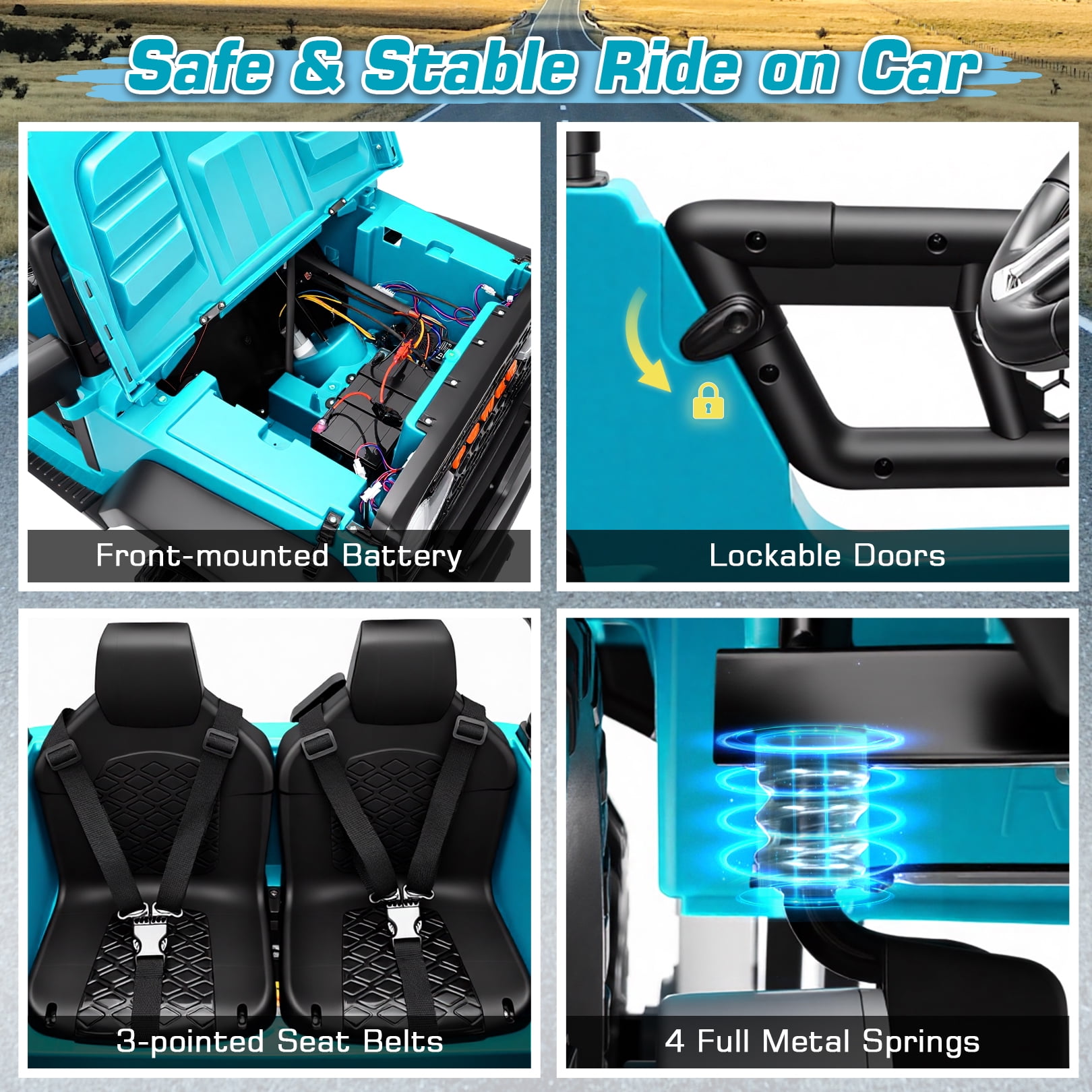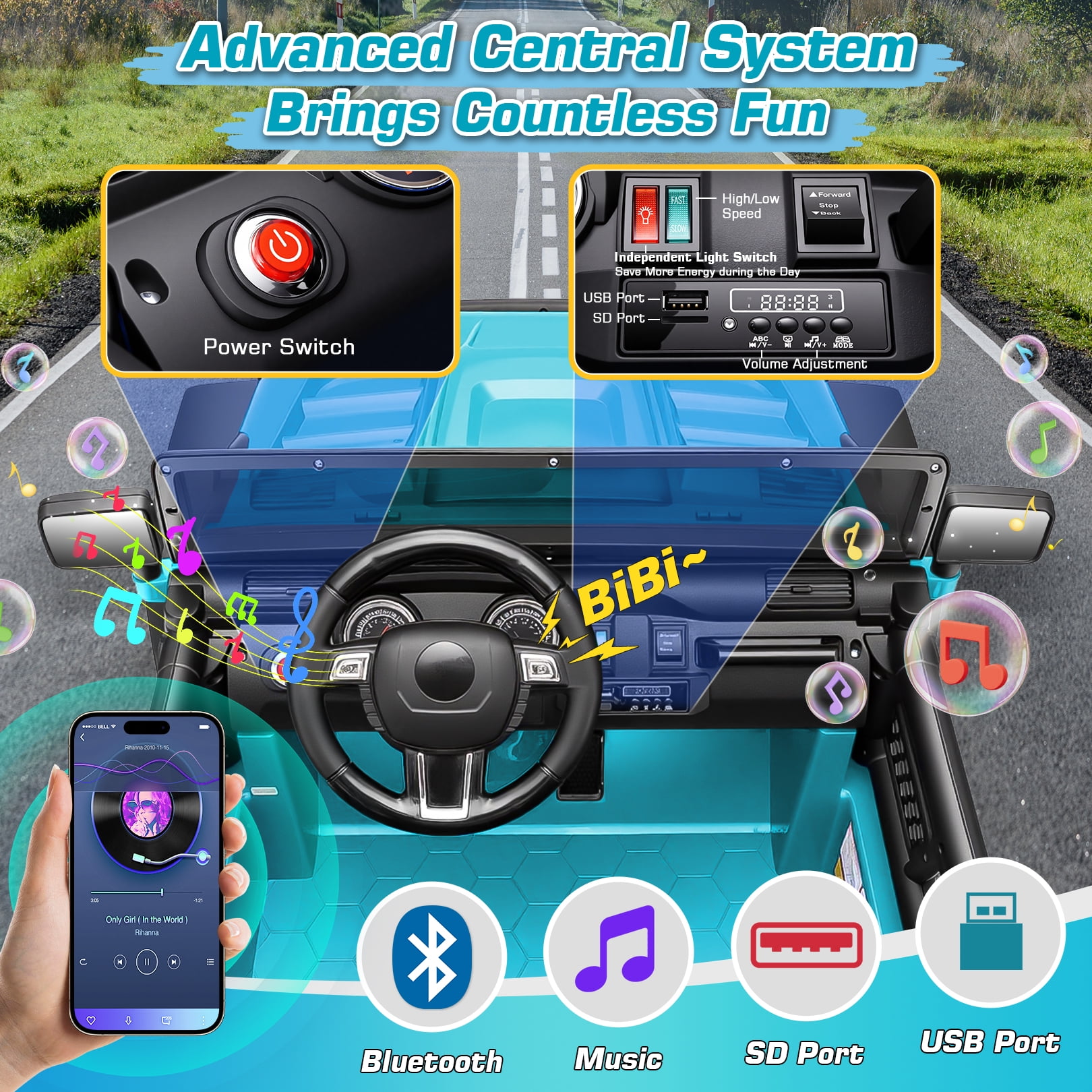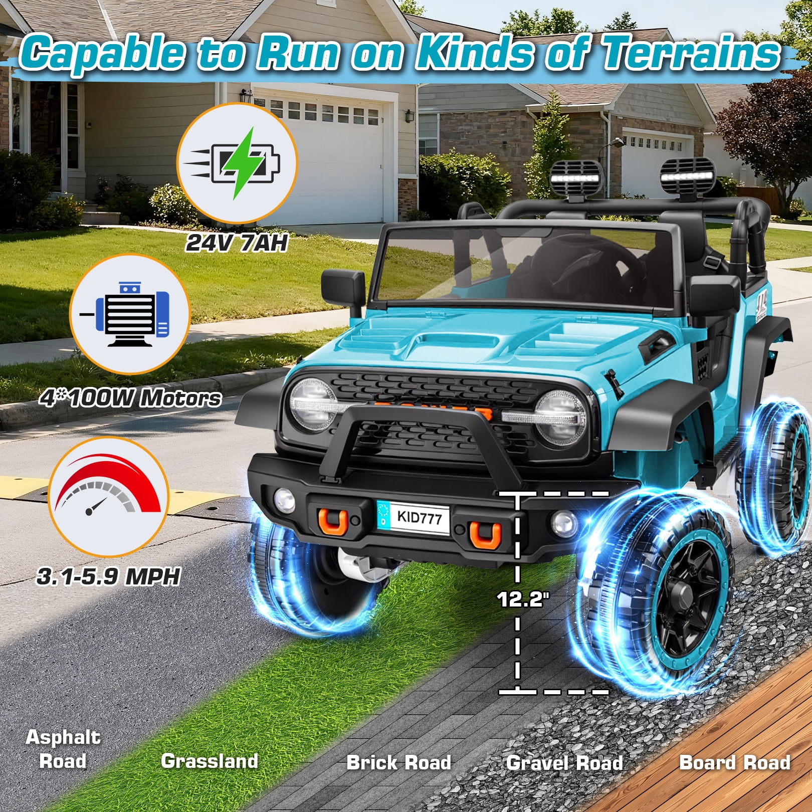 Funcid 24V Ride on Toys with Remote Control, 2 XL Seater Ride on Truck Car, 2WD/4WD Electric Car for Kids w/ Bluetooth, Flashing Colored Lights, SD Port, MP3, Spring Suspension, 6MPH, Teal
