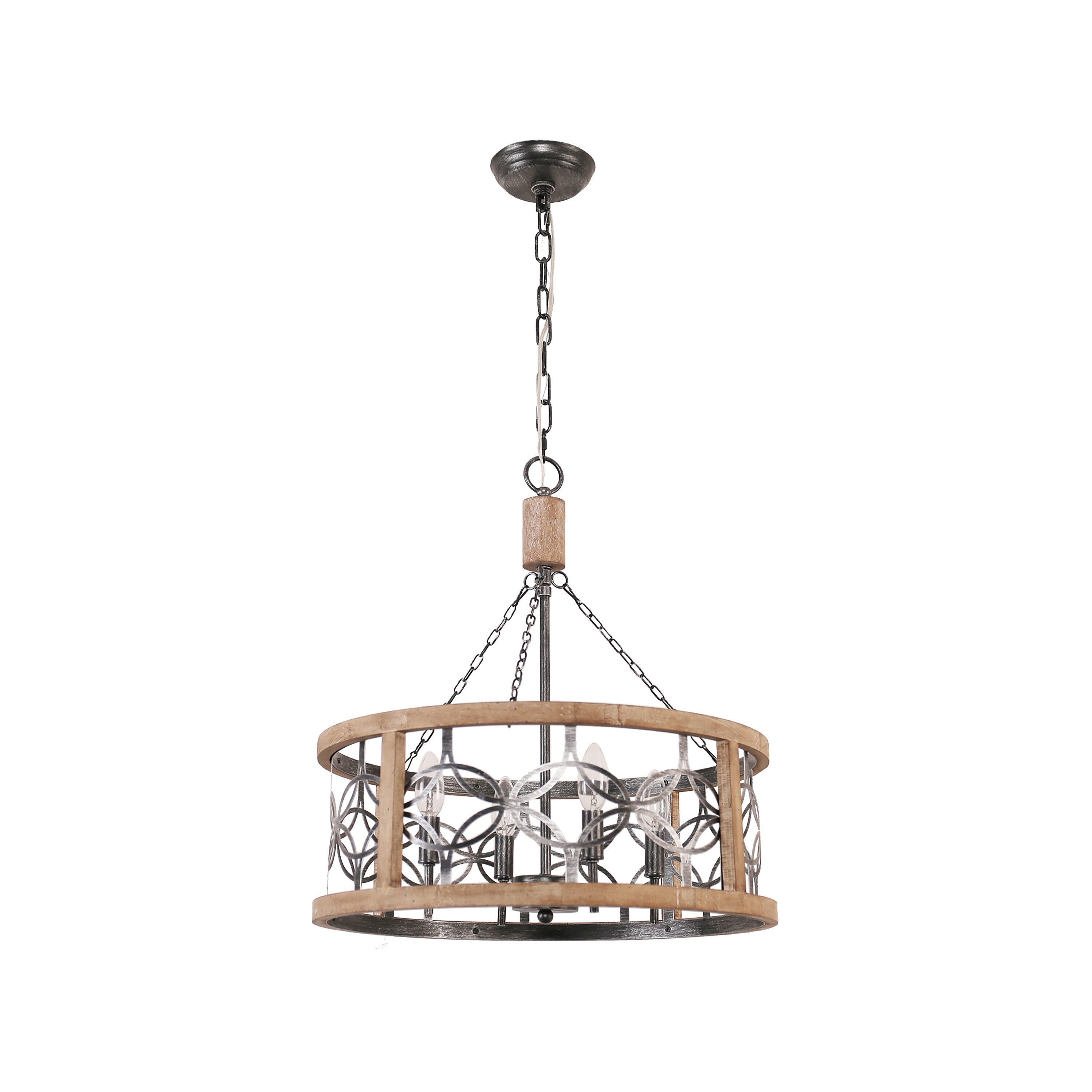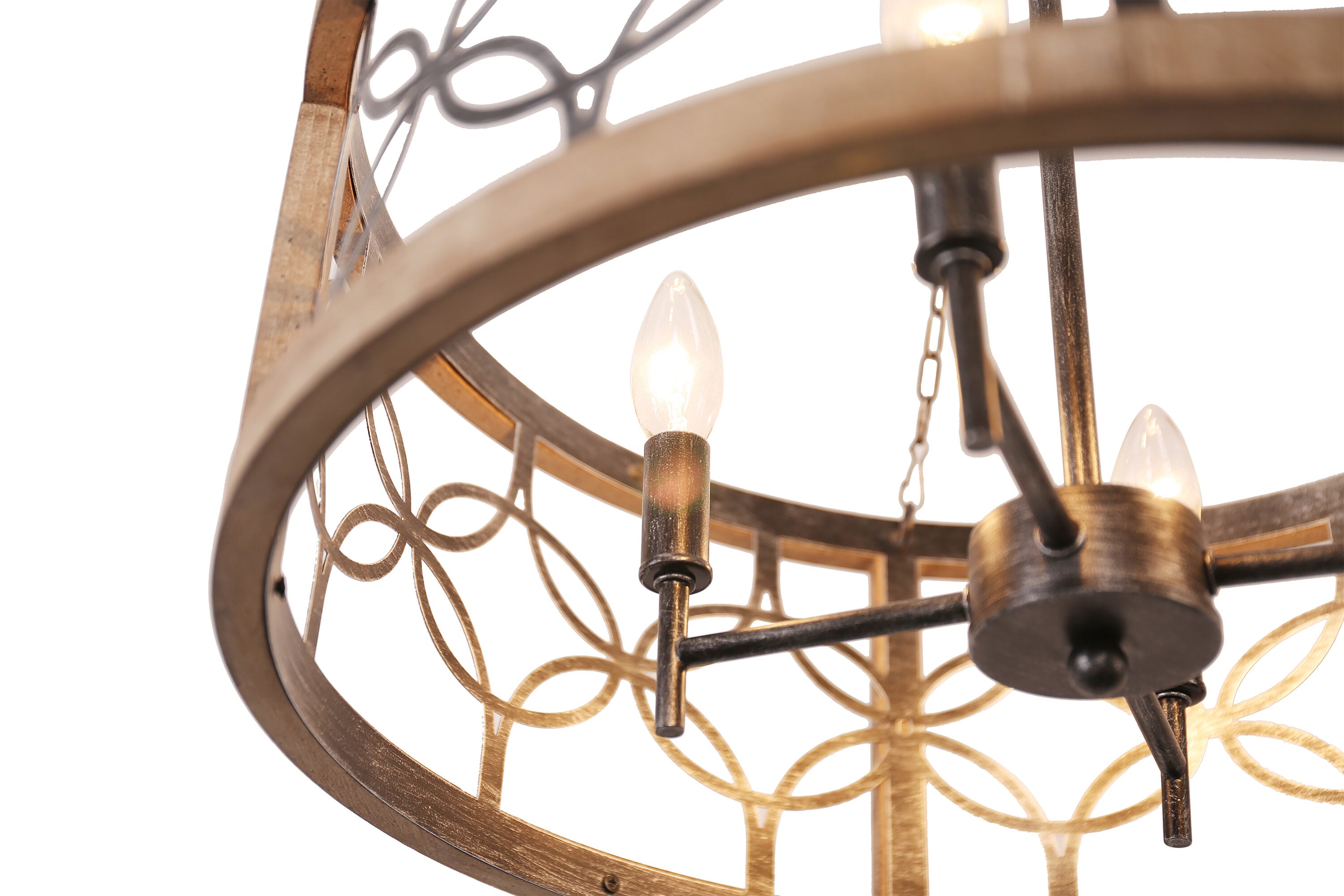 Bring a touch of rustic charm to your home with the 4-light rustic wood cage chandelier. Crafted from beautiful birch wood and metal, this chandelier features five candle-shaped lamp bases suspended from wood and an adjustable chandelier chain extending up to 70 in.. Ideal for both dining and living areas, this chandelier is designed to accommodate sloped ceilings of up to 15 °. While the required bulbs of up to 40 Watts each are not included, the chandelier promises an easy setup. It comes with quality assurance and a 1-year warranty, allowing you to bask in its warm, inviting glow with peace of mind.