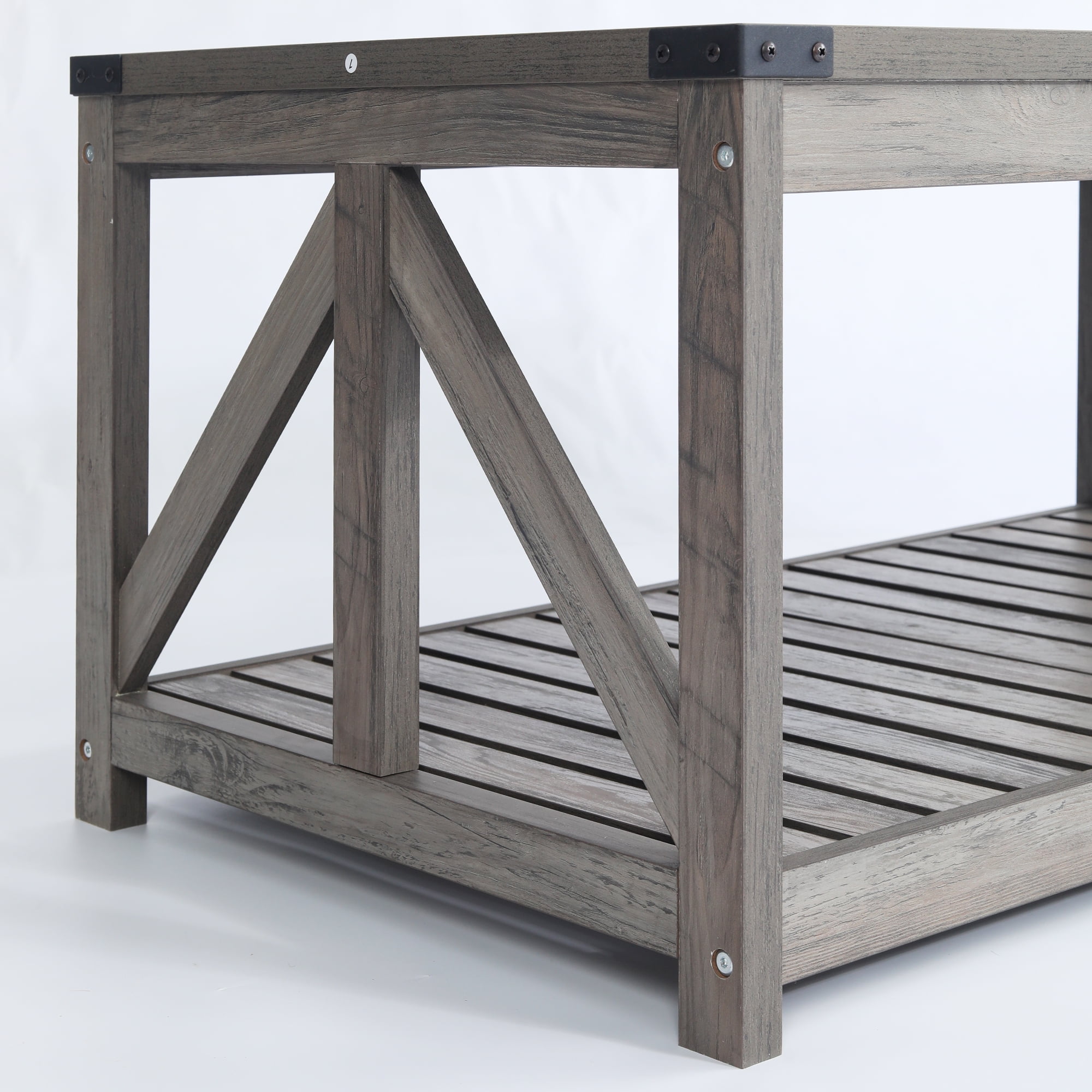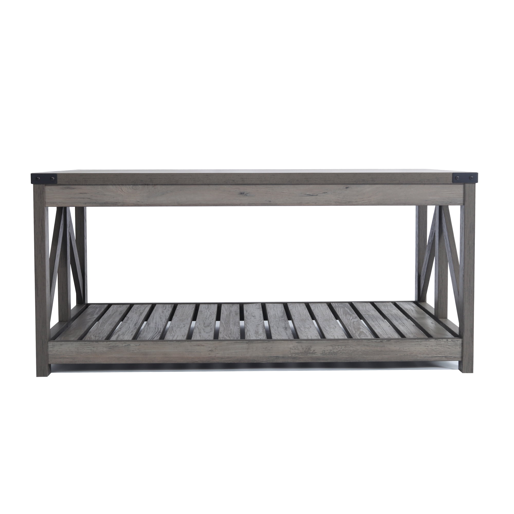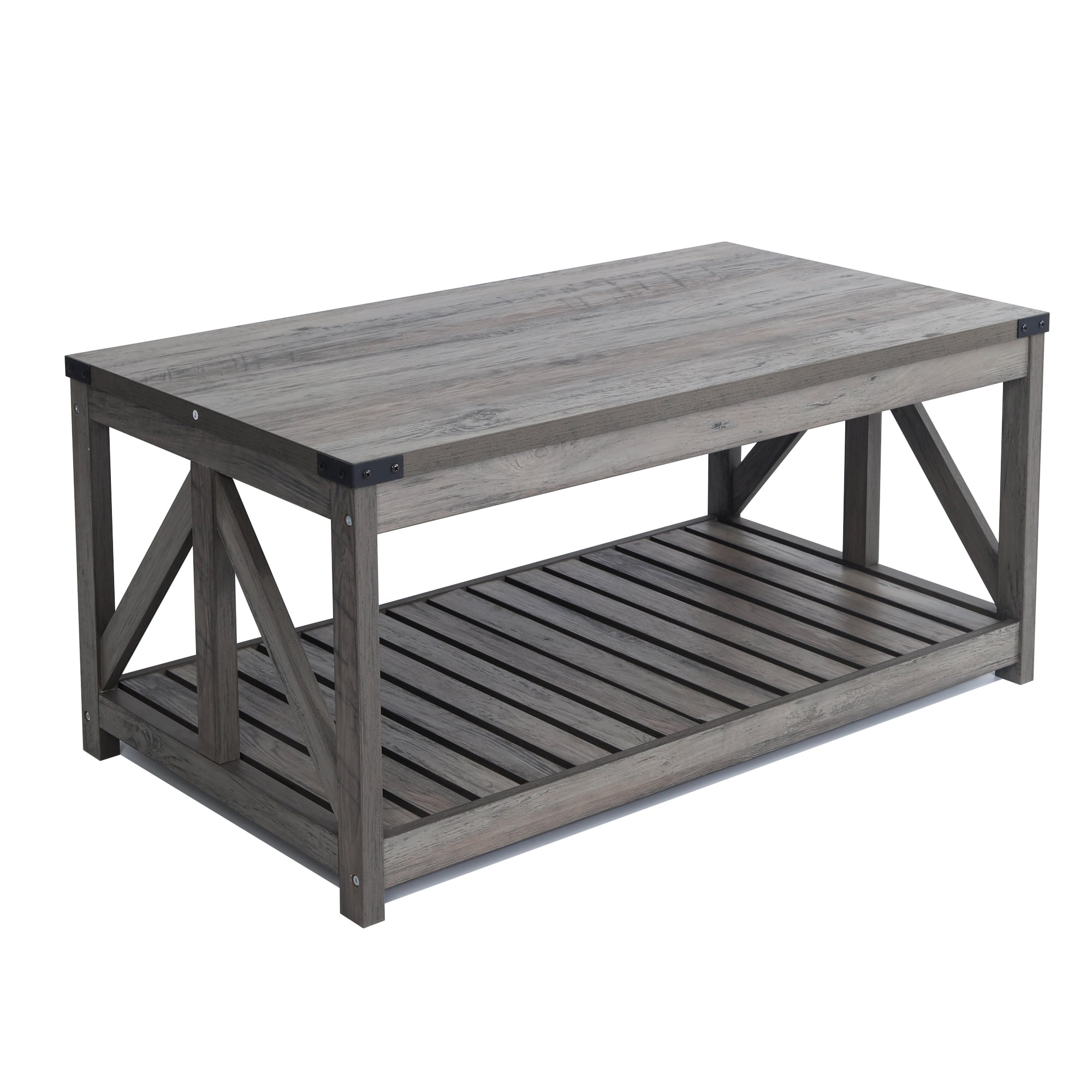【Classical Design】This coffee table was designed with modern farmhouse accent, along with open X-frame sides, slatted shelves and metal corner protectors. Open shelves are perfect for storage and displaying décor items. 【High Quality】This coffee table is crafted of premium manufactured wood with high-grade veneer finish in Washed Oak. 【Easy Assembly】Fast and easy assembly with clear instructions.