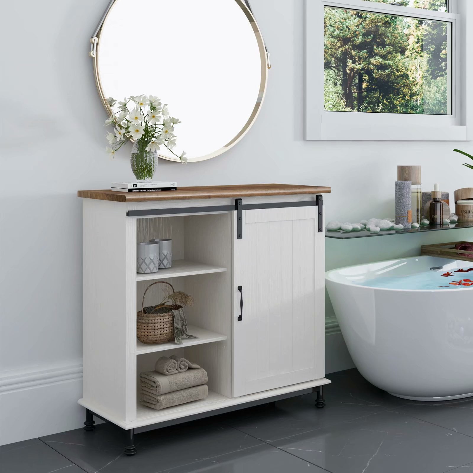 Farmhouse Storage Cabinet Sliding Barn Door Buffet Cabinet, Accent Kitchen Sideboard Coffee Bar, Adjustable Shelves, White