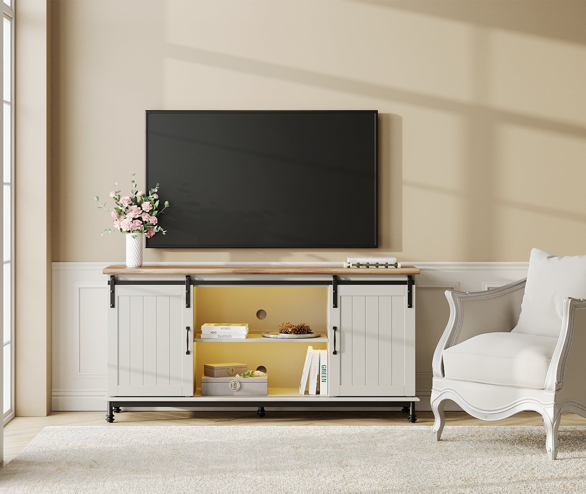 Farmhouse TV Stand for 65 Inch TV with Yellow Light, Sliding Barn Door Wood Entertainment Center with Storage Cabinet & Adjustable Shelves, 60”, White