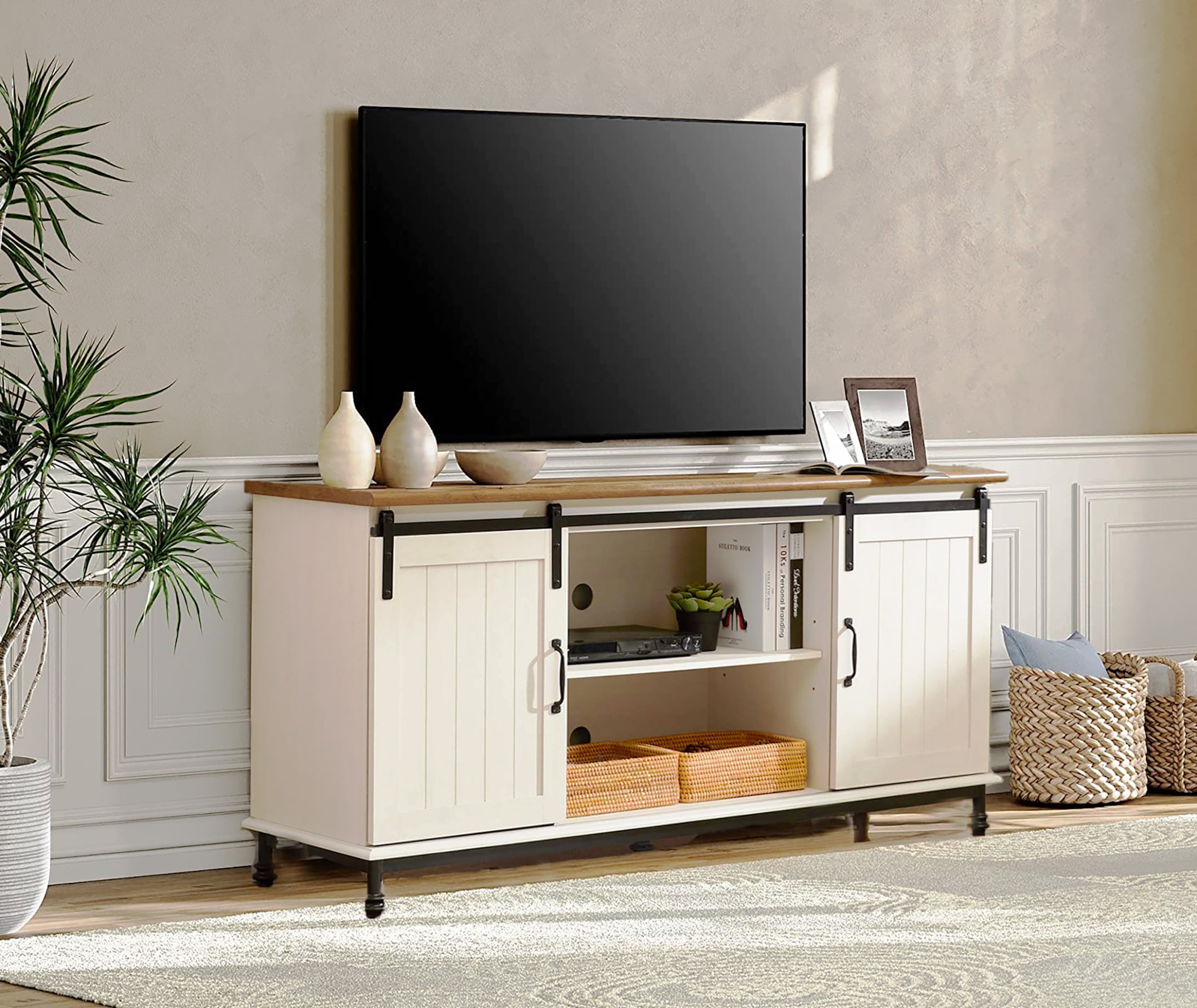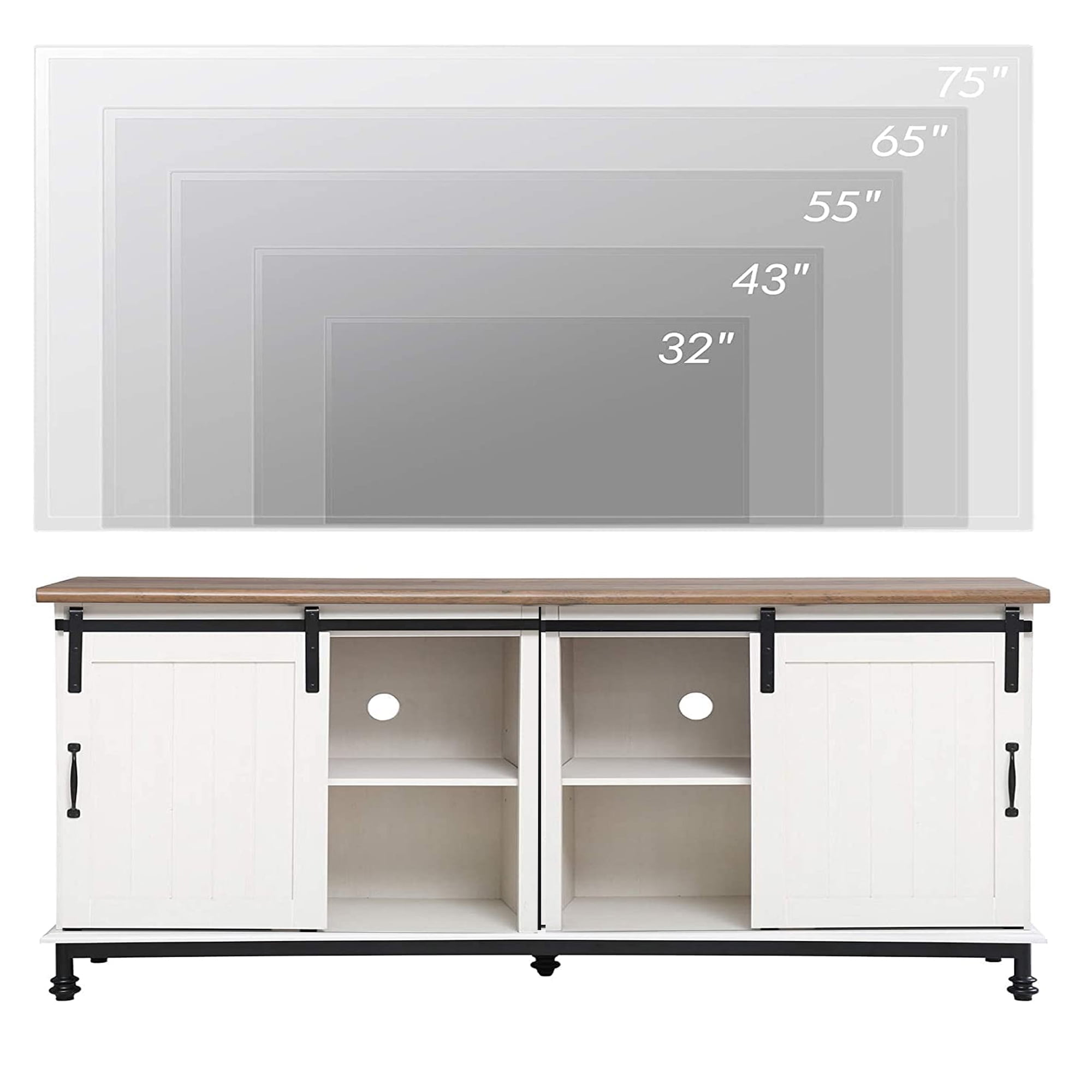 【Farmhouse Classic Style】 It features a perfect blend of modern and rustic farmhouse design, a great way to add personality and charm to your room,suitable for all the decor style and increase aesthetic for the living room or bedroom. 【Sturdy and Durable Structure】Made of environmentally premium MDF board. 4 metal legs plus extra support under bottom shelf makes this tv console table quite stable and durable and increases the weight capacity a lot. 【Cable Holes and Anti-tip Design】The back of the white TV stand is designed with a drilling hole and furniture anchors. Cable management features easy organization and hiding wires. 【Sufficient Storage Space】This 60 inch TV stand comes with 2 storage cabinets and 2 open shelves with 3 levels of adjustable and removable shelves. It can help you to store different shape of goods, easy to store your DVDs, X-box, high speakers, and game consoles. It will be a good partner for you to save space in your daily life. 【Sliding Barn Doors】The sliding barn doors are designed with wood barn surface. Easy access to cabinets and shelves via metal track,,slide smoothly and quietly.