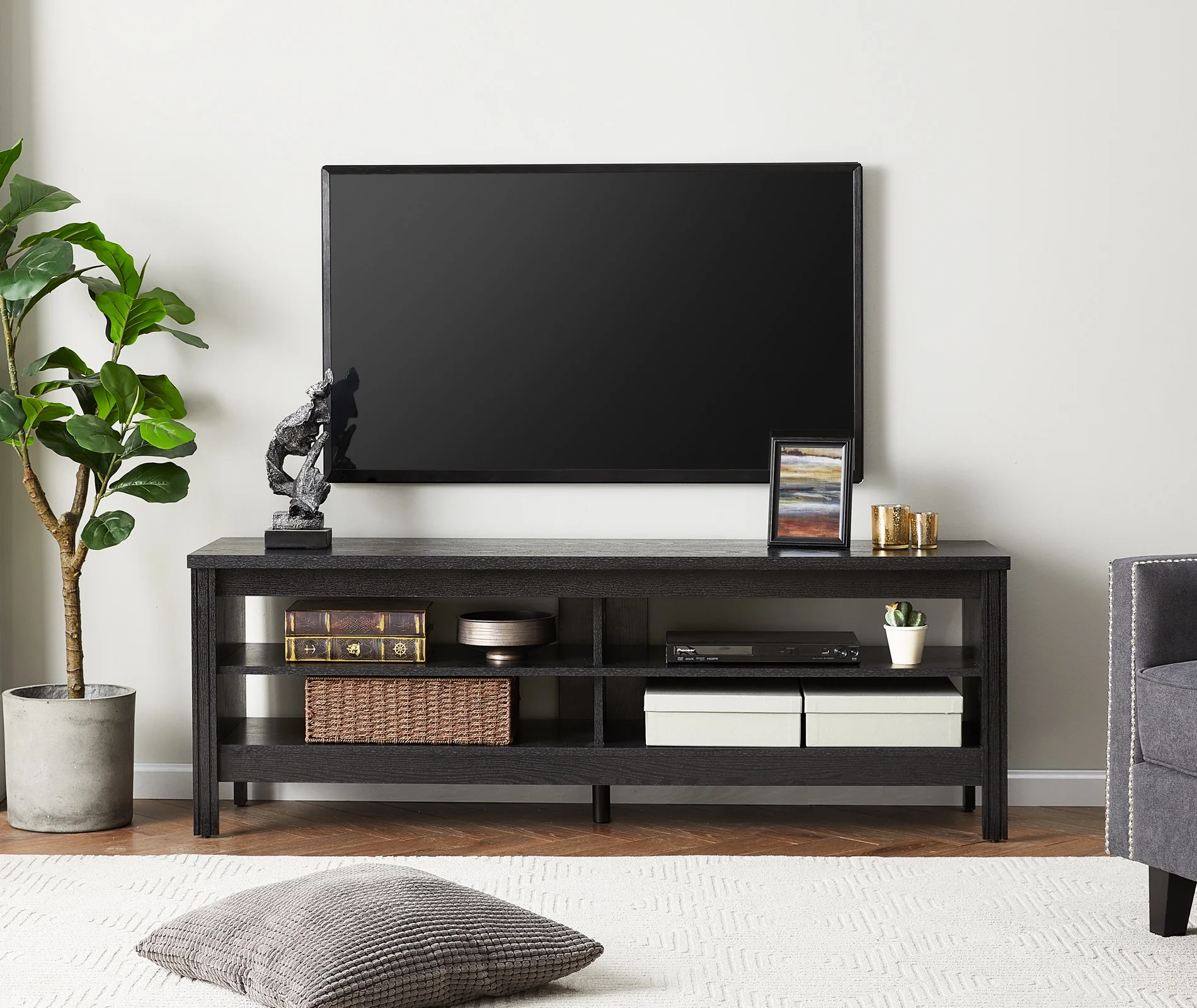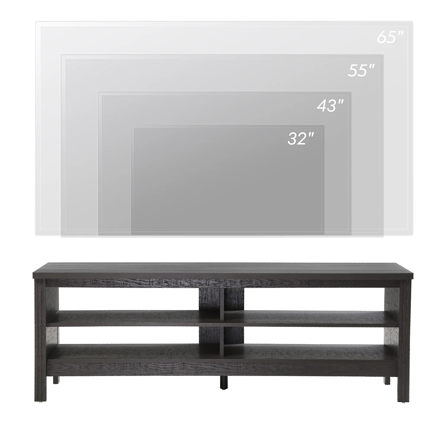TV Cabinet / TV Table / Entertainment Center TV Unit: Farmhoues Design & Multifunction—The espresso wood grain and simple lines on this entertainment stand make it look classic and elegant. It can be not only used as TV stand, also perfect for sofa table, hallway Table, entry table, entertainment center, media stand, storage console table, etc. Large Capacity—This TV stand is perfect for TVs up to 65 inch TV.4 open shelves with big capacity allow you to storage the books, magazines, CDs and any other media or gaming devices. Stable Structure& Easy To Clean–Made from high-grade certified MDF for long-lasting construciton.Rich black wood grain finish is easy to clean.And its smooth waterproof surface is easy to clean with a soft damp cloth to facilitate your daily cleaning work. Accessible for Robot Vacuum Cleaner—The tv table is 3.9 in high height off the ground which adequate for robot vacuum cleaner can passing freely. No more headaches from dust under the cabinet. Easy to Assemble & Dimension—With detailed instructions and all hardware delivered, the wood TV stand for 65 inch TV is effortless to assemble.Dimension:60″ L * 15.5″ W * 23.6″ H.Max load capacity: 175 lbs.