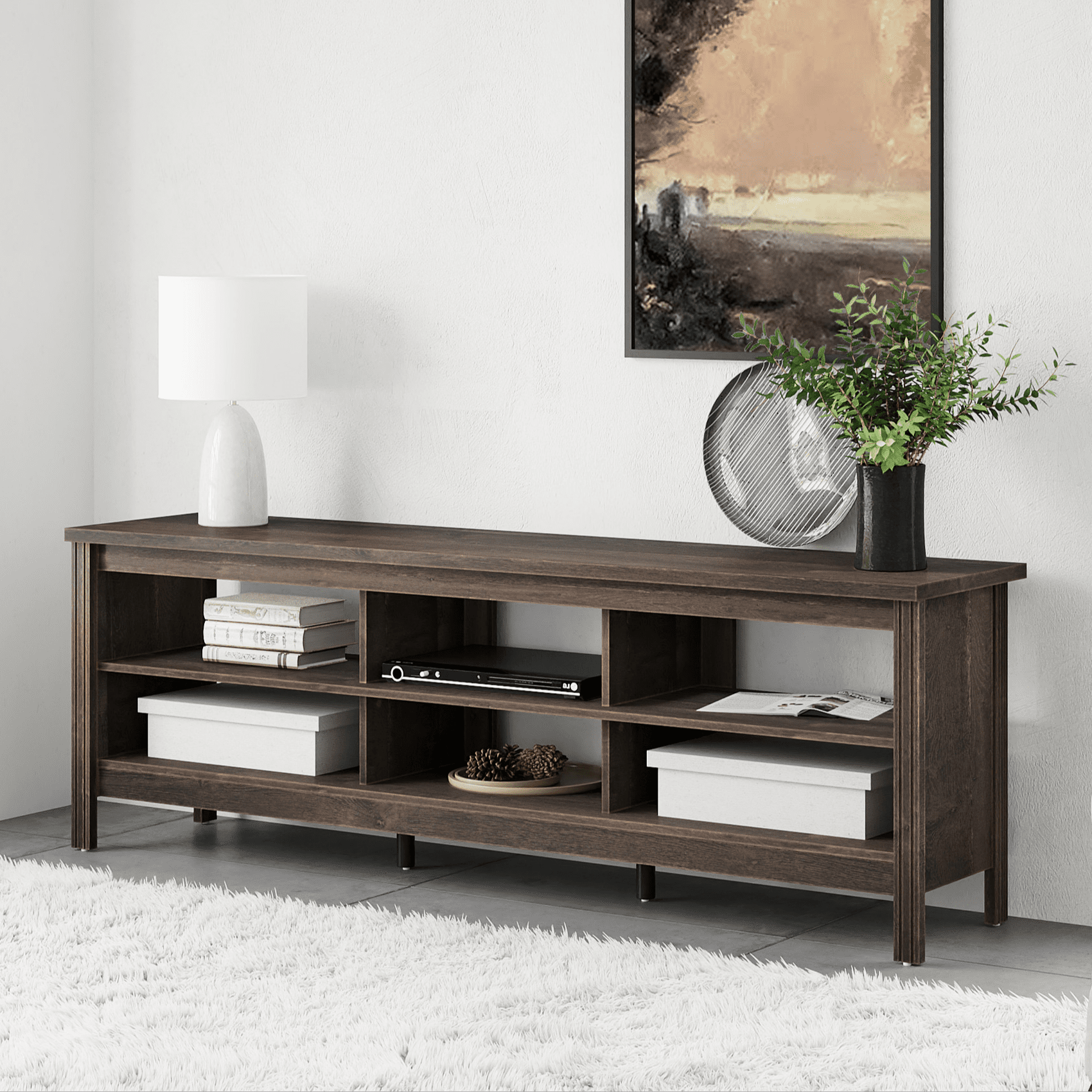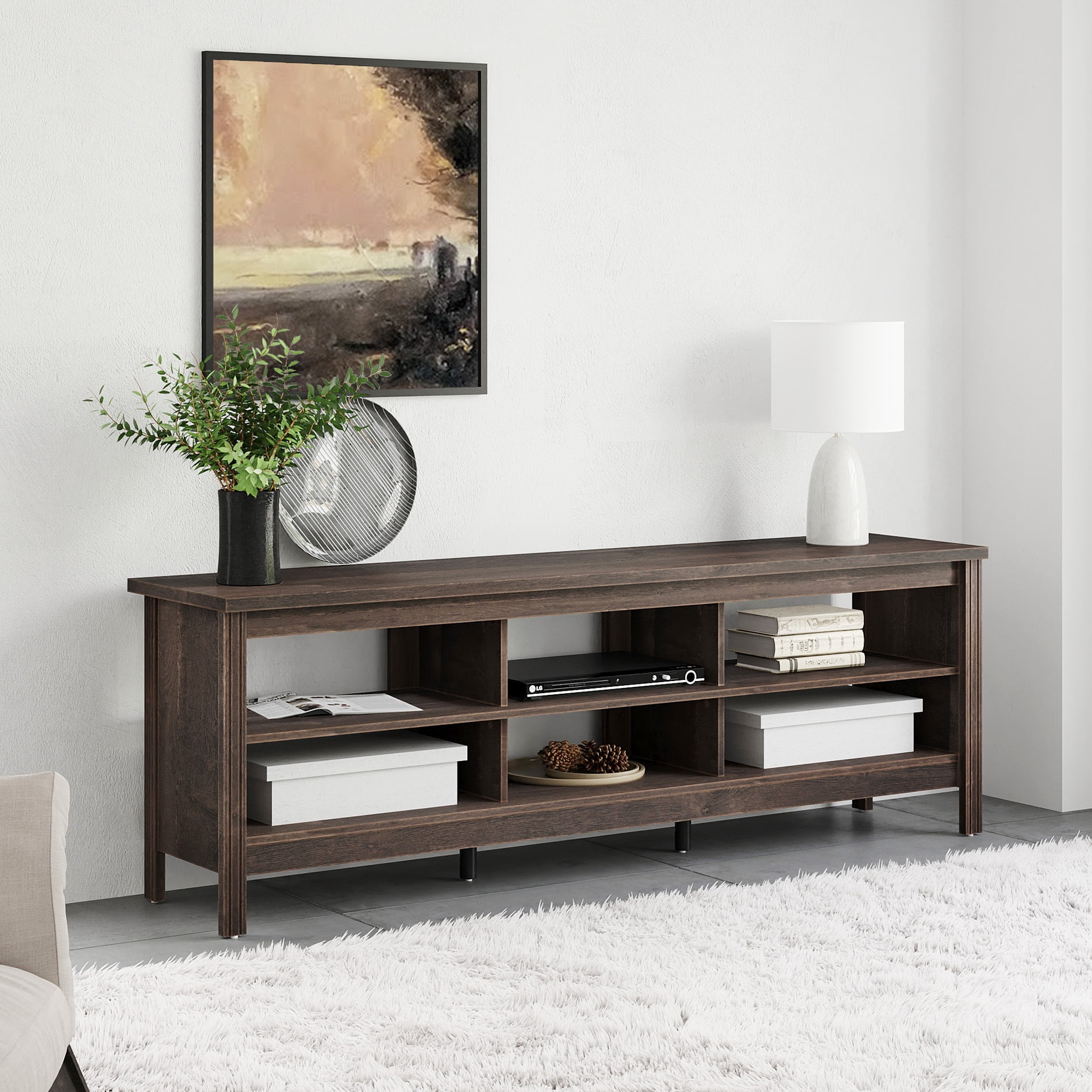 Farmhoues Design & Multifunction—The wood grain and simple lines on this entertainment stand make it look classic and elegant. It can be not only used as TV stand, also perfect for console table, hallway Table, entry table, entertainment center, media stand, etc. Large Capacity—This 70 inch TV stand is perfect for TVs up to 75 inch TV. And 6 open shelves with big capacity allow you to storage the books, magazines, CDs and any other media or gaming devices. Stable Structure & Easy to Clean–Made from high-grade certified MDF, the media console table offers long-lasting construciton. And its smooth waterproof surface is easy to clean with a soft damp cloth to facilitate your daily cleaning work. Accessible for Robot Vacuum Cleaner—The tv table is 3.9 in high height off the ground, which is adequate enough for robot vacuum cleaner passing freely. No more headaches from dust under the tv cabinet. Easy to Assemble & Dimension—With detailed instructions and all hardware delivered, the wood TV stand for 75 inch TV is effortless to assemble. Dimension:70″ L * 15.5″ W * 23.6″ H. Max load capacity: 260 lbs.