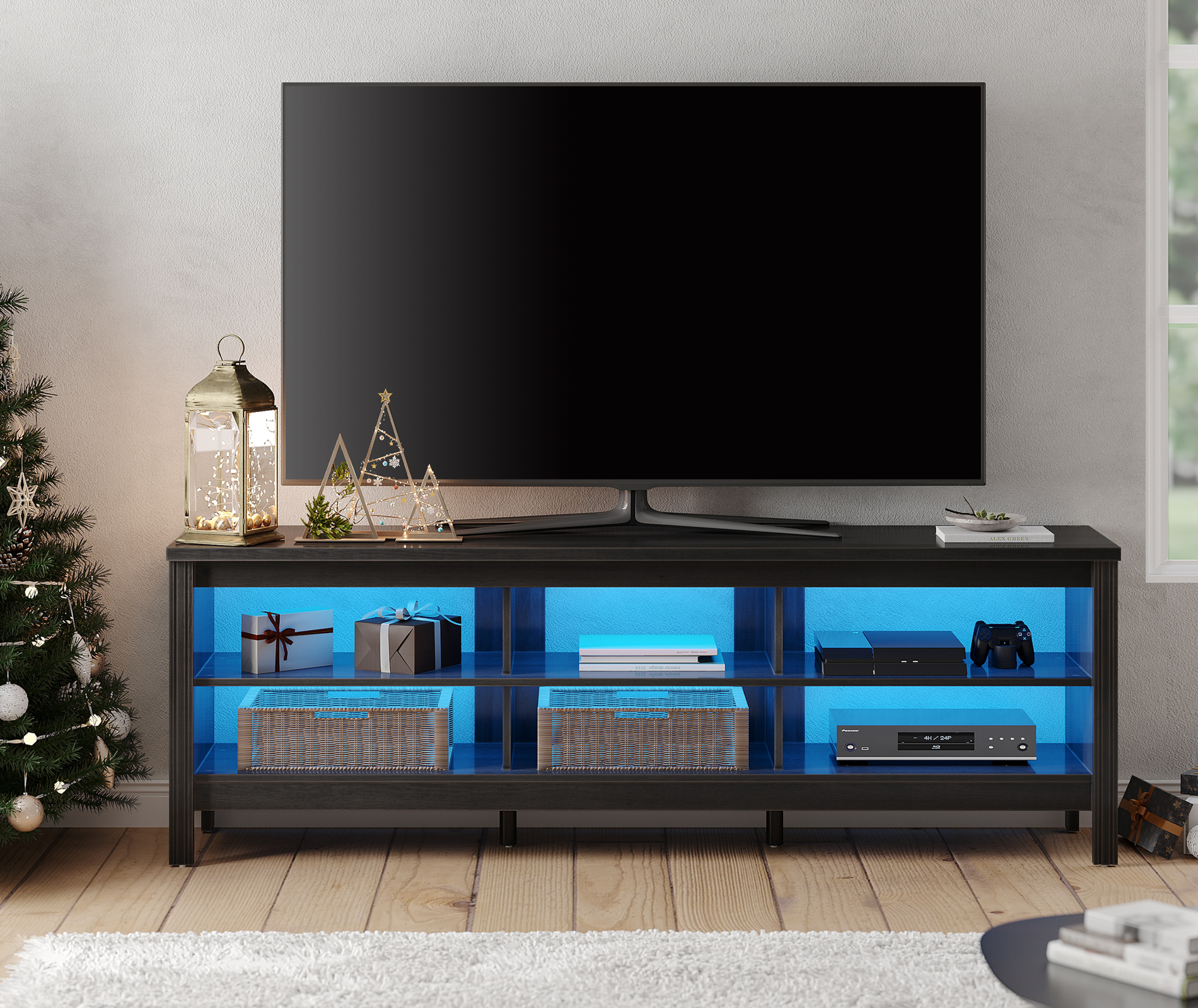LED TV Stand –Comes with a strip of USB LED Lights with the power of 5V/30W. CE and ROHS certification are listed to provide you with a safe environment. You can DIY to decorate night stand as you want.It can create a beautiful atmosphere and enhance your room furniture, making your home looks more modern and stylish. Farmhoues Design & Multifunction—The wood grain and simple lines on this entertainment stand make it look classic and elegant. It can be not only used as TV stand, also perfect for console table, hallway Table, entry table, entertainment center, media stand, etc. Large Capacity—This 70 inch TV stand is perfect for TVs up to 75 inch TV. And 6 open shelves with big capacity allow you to storage the books, magazines, CDs and any other media or gaming devices. Stable Structure & Easy to Clean–Made from high-grade certified MDF, the media console table offers long-lasting construciton. And its smooth waterproof surface is easy to clean with a soft damp cloth to facilitate your daily cleaning work. Accessible for Robot Vacuum Cleaner—The tv table is 3.9 in high height off the ground, which is adequate enough for robot vacuum cleaner passing freely. No more headaches from dust under the tv cabinet. Easy to Assemble & Dimension—With detailed instructions and all hardware delivered, the wood TV stand for 75 inch TV is effortless to assemble. Dimension:70″ L * 15.5″ W * 23.6″ H. Max load capacity: 260 lbs.