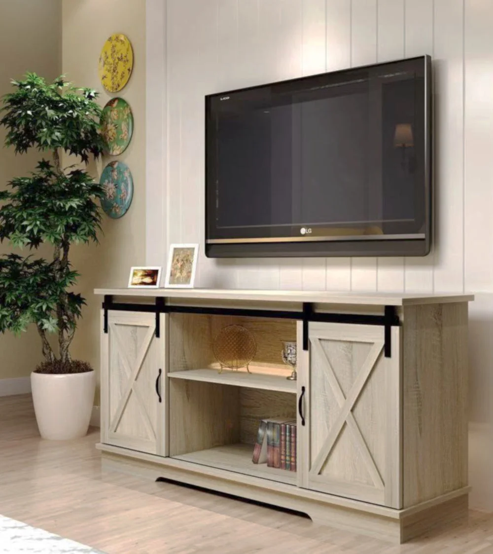 Farmhouse TV Stand for TVs Up to 65 Inch with Sliding Barn Doors and Adjustable Shelves, White Oak