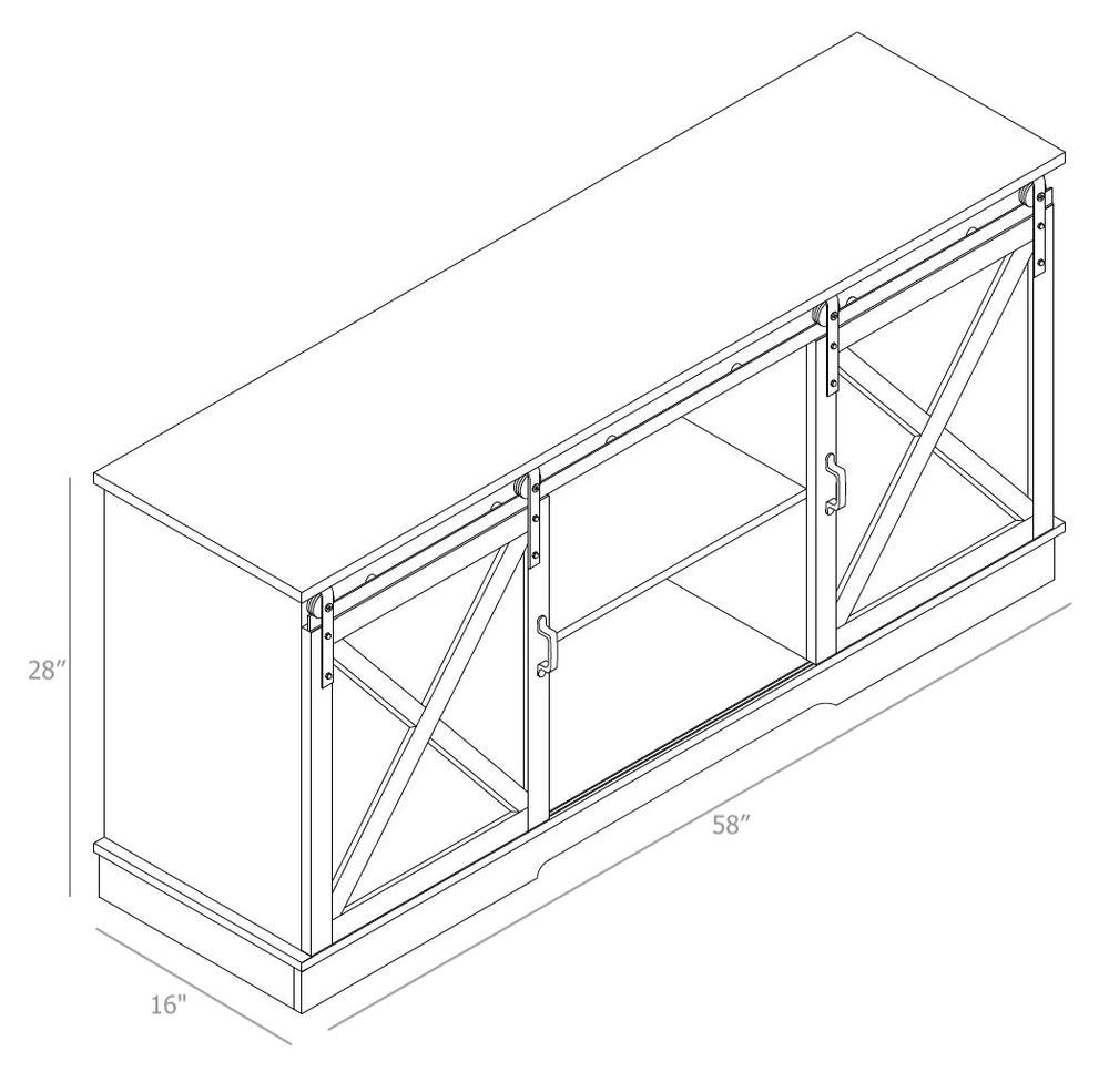 Dimensions: Overall 58″W x 16″D x 28″H, Open shelf 23″W x 14″D x 11″H, Storage cabinet 15″W x 14″D x 23″H Top surface supports up to 120 Ibs, middle shelf and 2 adjustable shelves in cabinets support up to 30 Ibs each Cord management ports in middle shelf and cabinets Easy-to-assemble instructions