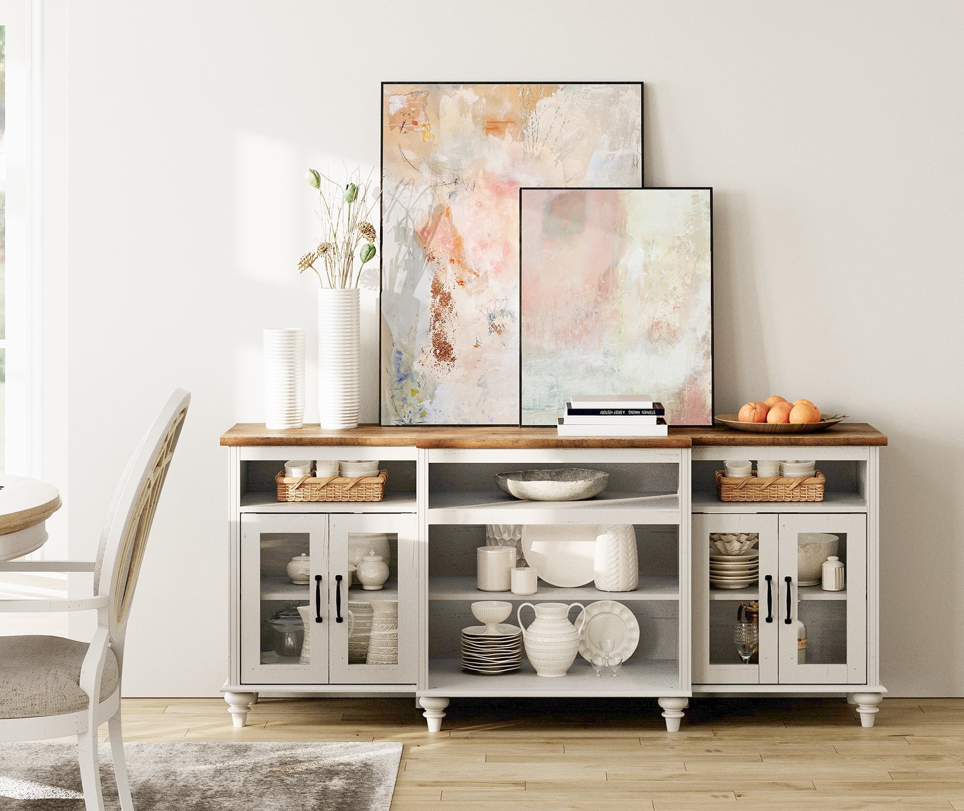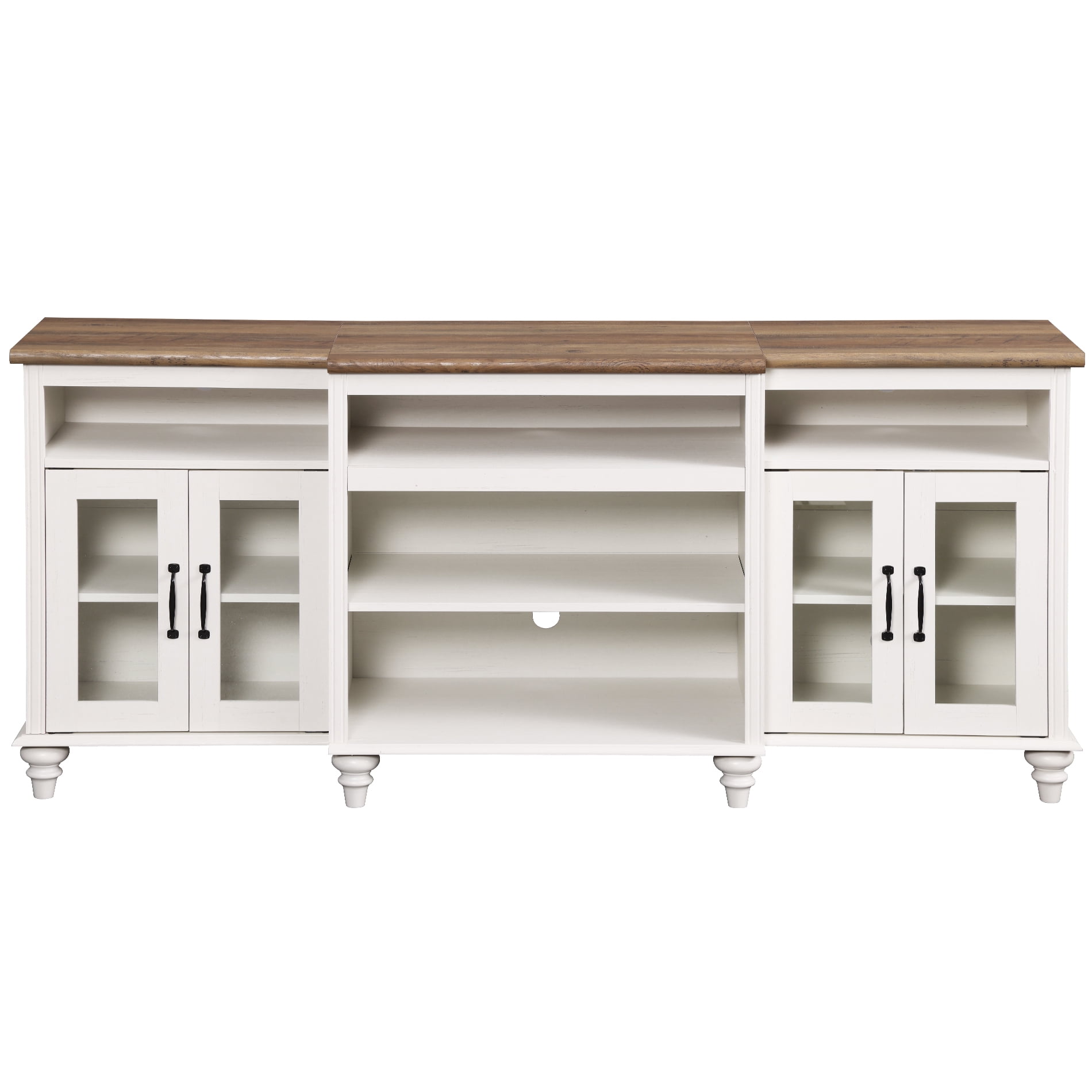 【Farmhouse Classic Design】This tv stand has a raised shape and off white distressed wood surface, perfect for farmhouse style home decor. It lights up your bedroom living room and is fashionable and cozy. 【Ample 9 Storage Space】The tv stand has 3 semi-open highboy cubbies for media equipment and art display. It has 3 adjustable shelves and 4 glass doors for dust protection. Stay organized with 3 cable management holes. 【Premium Material& Sturdy Structure】Made from MDF, this entertainment center is built to last. The solid wood gourd legs increase stability and weight capacity. The waterproof surface is easy to clean. 【Safe & Secure】Comes with an anti-tip kit for stability and safety. Curved edges prevent injuries. Anti-slip foot pads protect floors from scratches. 【Quick Assembly& 2-Year Support】Numbered pieces for easy assembly. Carefully wrapped for safe delivery. We offer satisfying services and take responsibility for quality issues.