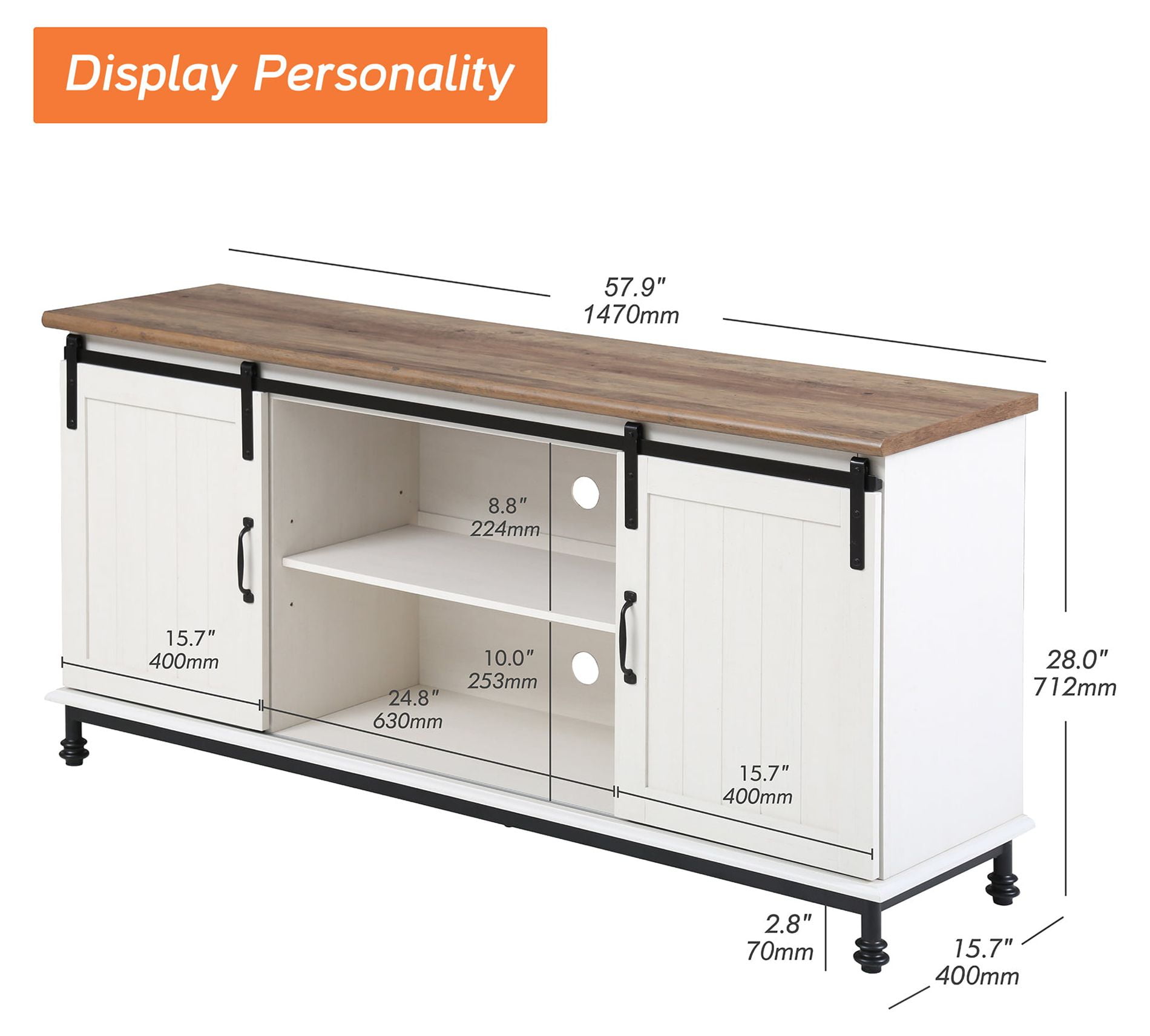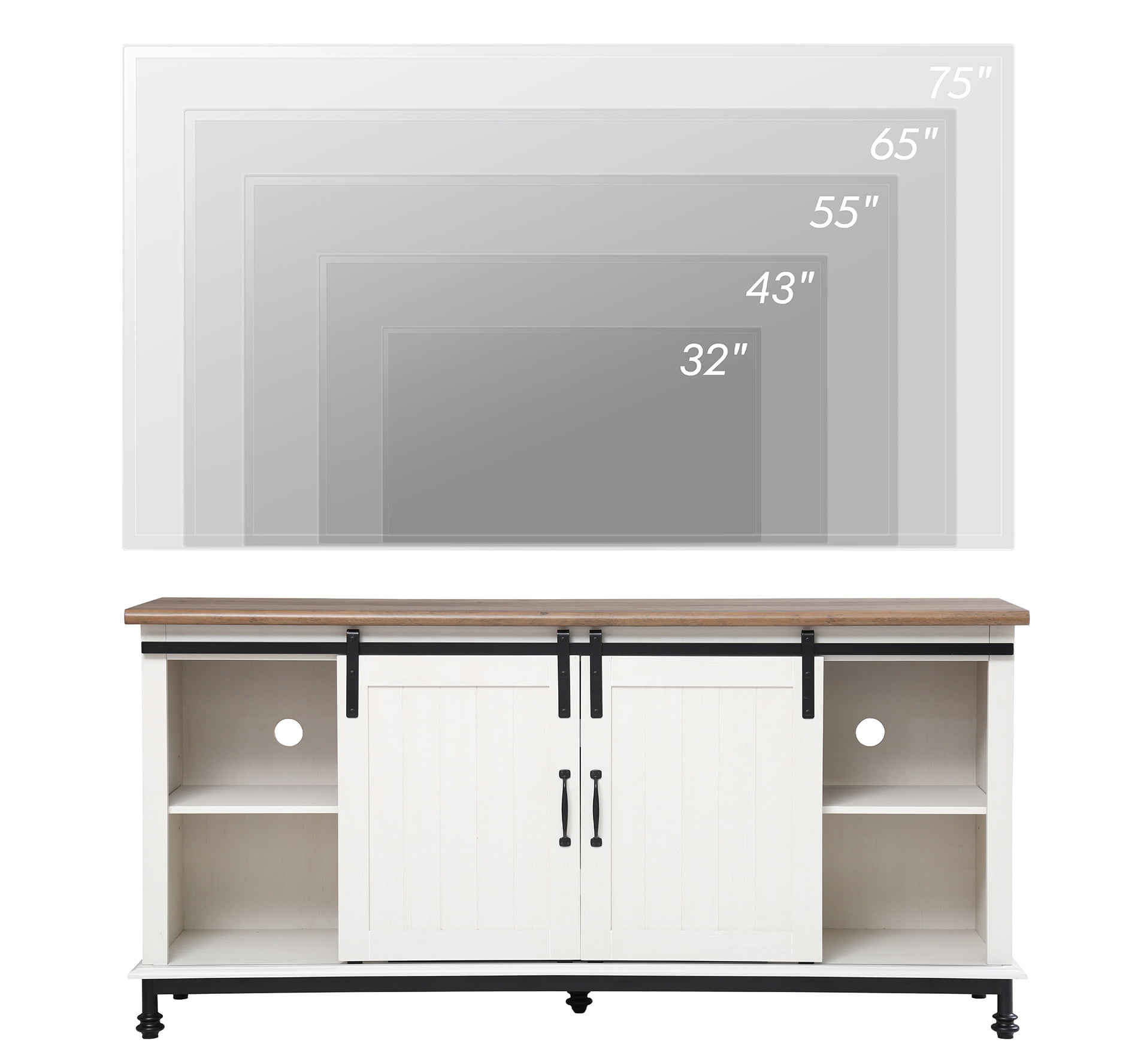 [Farmhouse Classic Design]: Sliding Barn Door TV Stand Made from high-grade certified MDF for long-lasting construction, combines a modern and traditional farmhouse style, suitable for all the decor styles, and increases aesthetic for the living room. [Rustic TV Stand Fit TVs Up to 65″]: The TV Stand makes it recommended for TVs up to 65″. Supports up to 250 lbs. Dimensions: 57.9″ L * 15.7″ W * 28″ H. [Sliding Barn Doors And Cable Holes Design]: This TV cabinet has two sliding barn door designs to conceal side storage cabinets or center storage shelves, 2 adjustable shelves behind the doors, 2 open compartments, and a large shelf under the tabletop to keep all your games and a media player in one place. [Cable Management System]: Open and closed storage with cord management. The TV Stands have cable holes designed at the top for hiding unsightly wire pages before you install the products. [Easy to Clean and Assemble]: Rich white wood grain finish is easy to clean. Assembly and disassembly are a breeze. Please download the product instructions on the page before you install the products.