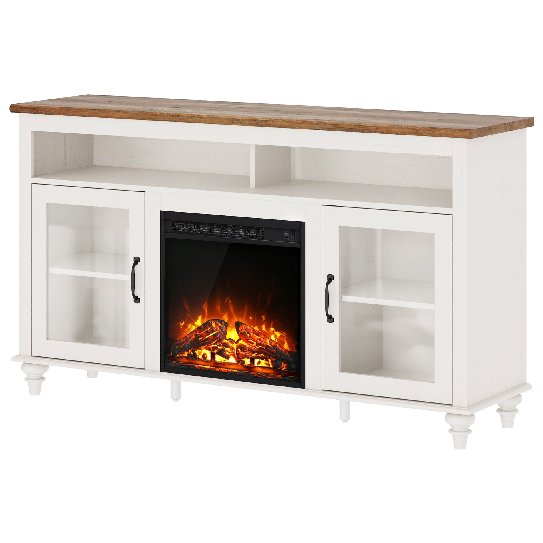 Farmhouse White Wood Entertainment Center, 58-Inch Highboy TV Stand with Electric Fireplace and Glass Door Storage Console