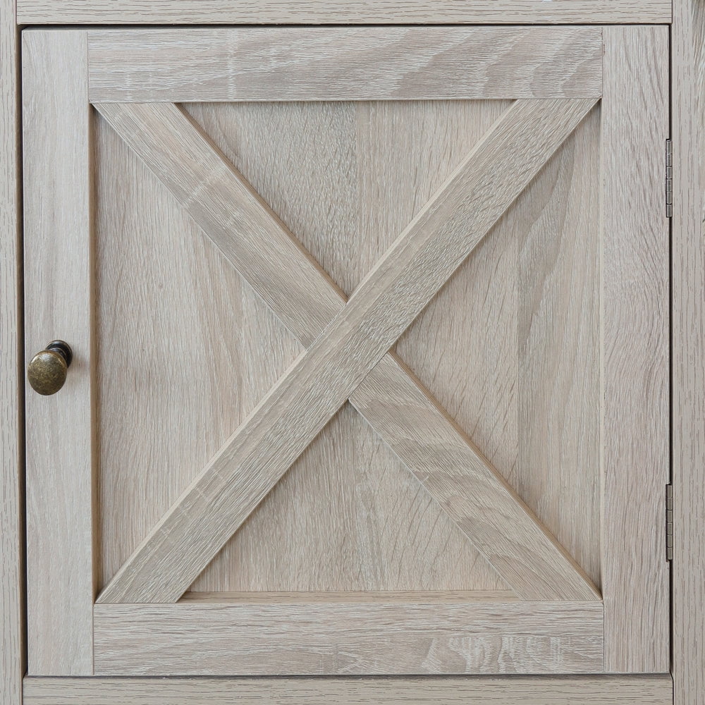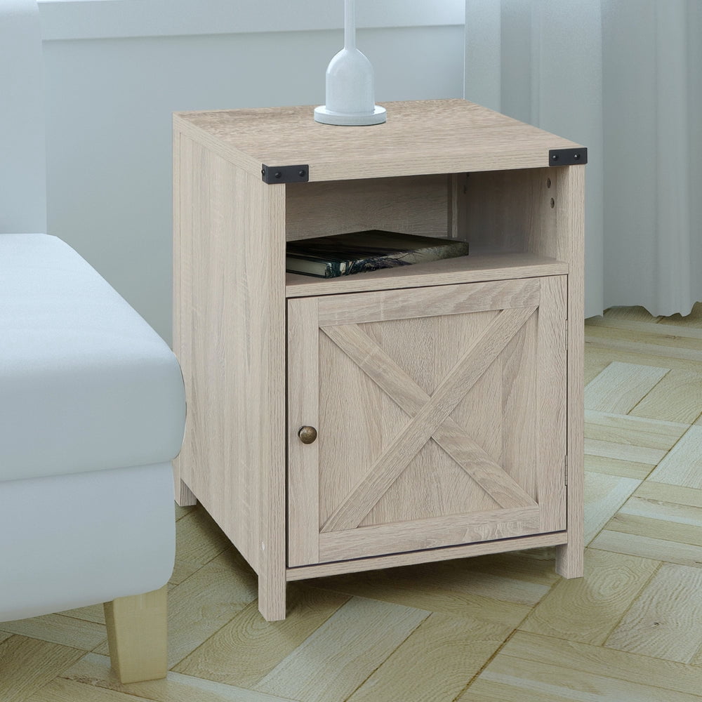 Farmhouse Wood Nightstand is crafted of premium manufactured wood with high-grade veneer finish, featuring X-frame on cabinet door with farmhouse accent. Shelf and cabinet provide abundant storage space.