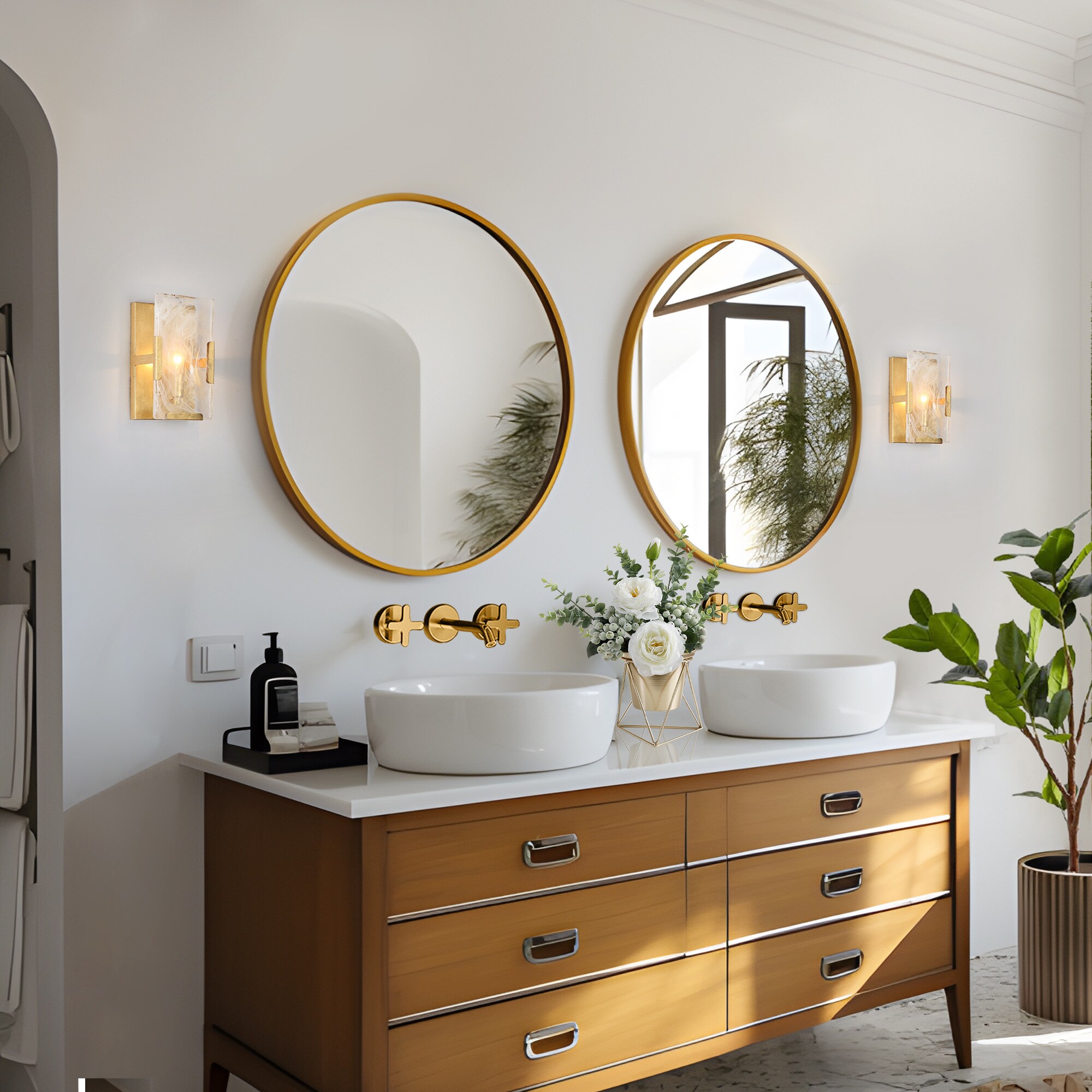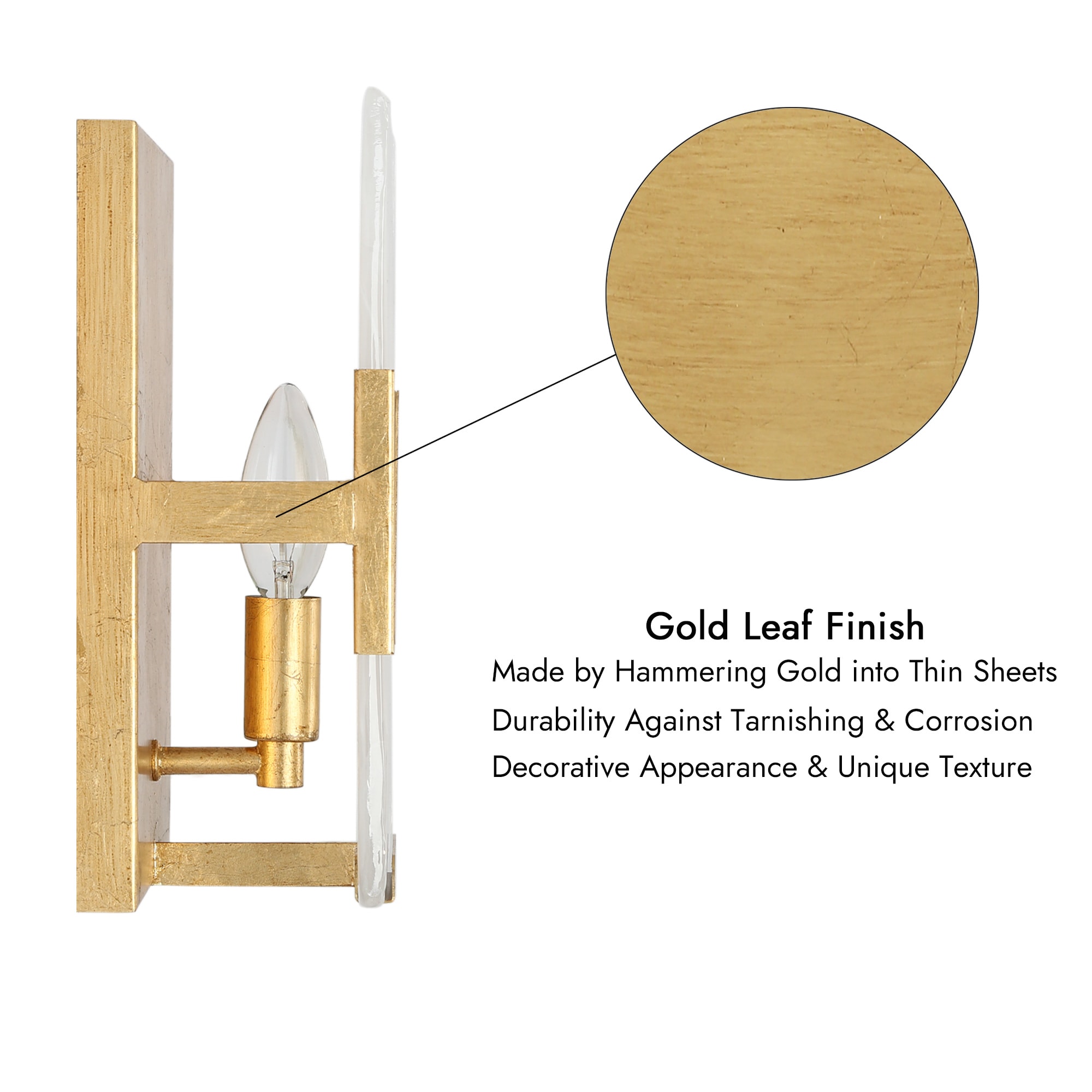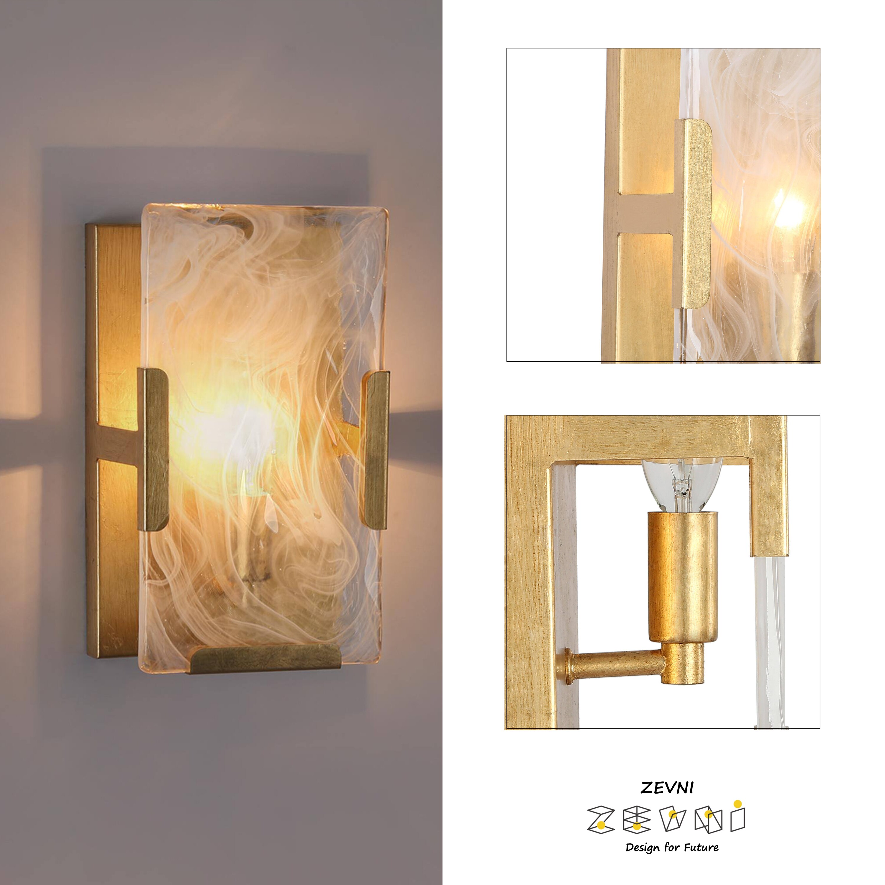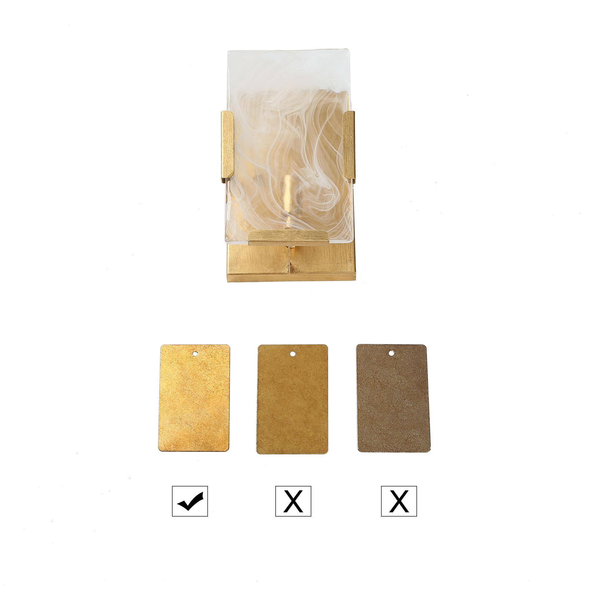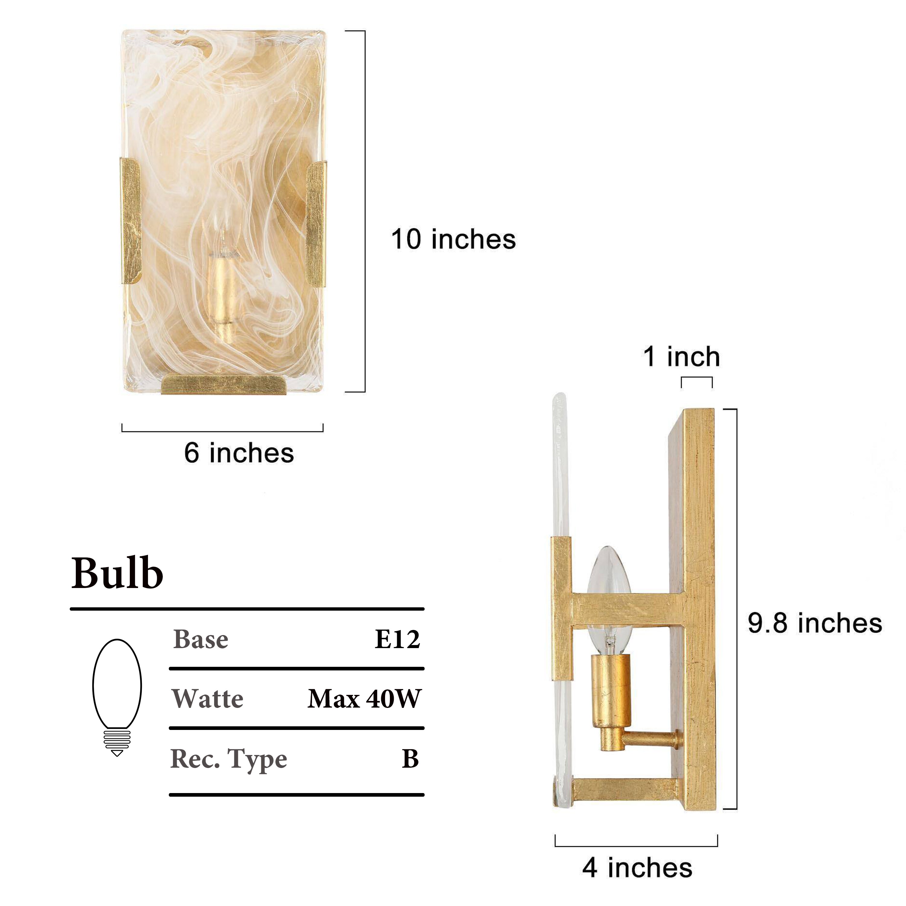 This stylish wall sconce features a rectangular shape that exudes a sleek and modern vibe while maintaining a rustic feel with its vintage gold foil finish. The frosted artistic glass shade provides a soft, diffused glow that illuminates any space with a warm and inviting ambiance. This wall sconce is also dimmable, making it a versatile lighting option that can be adjusted to suit any mood or occasion. Simply use it with dimming bulbs and dimmer switches (not included) to customize the lighting to your preference. The vintage gold wall sconce is a great match for a variety of home decor styles, including the contemporary, modern farmhouse, mid-century modern, transitional, and traditional. It can be used as a gold vanity light for a touch of luxury in your bathroom, or as a modern farmhouse wall light to add some rustic charm to your living room or bedroom. Whether you are looking for a stylish addition to your home decor or simply want to upgrade your lighting, this gold bathroom sconce is a great choice.