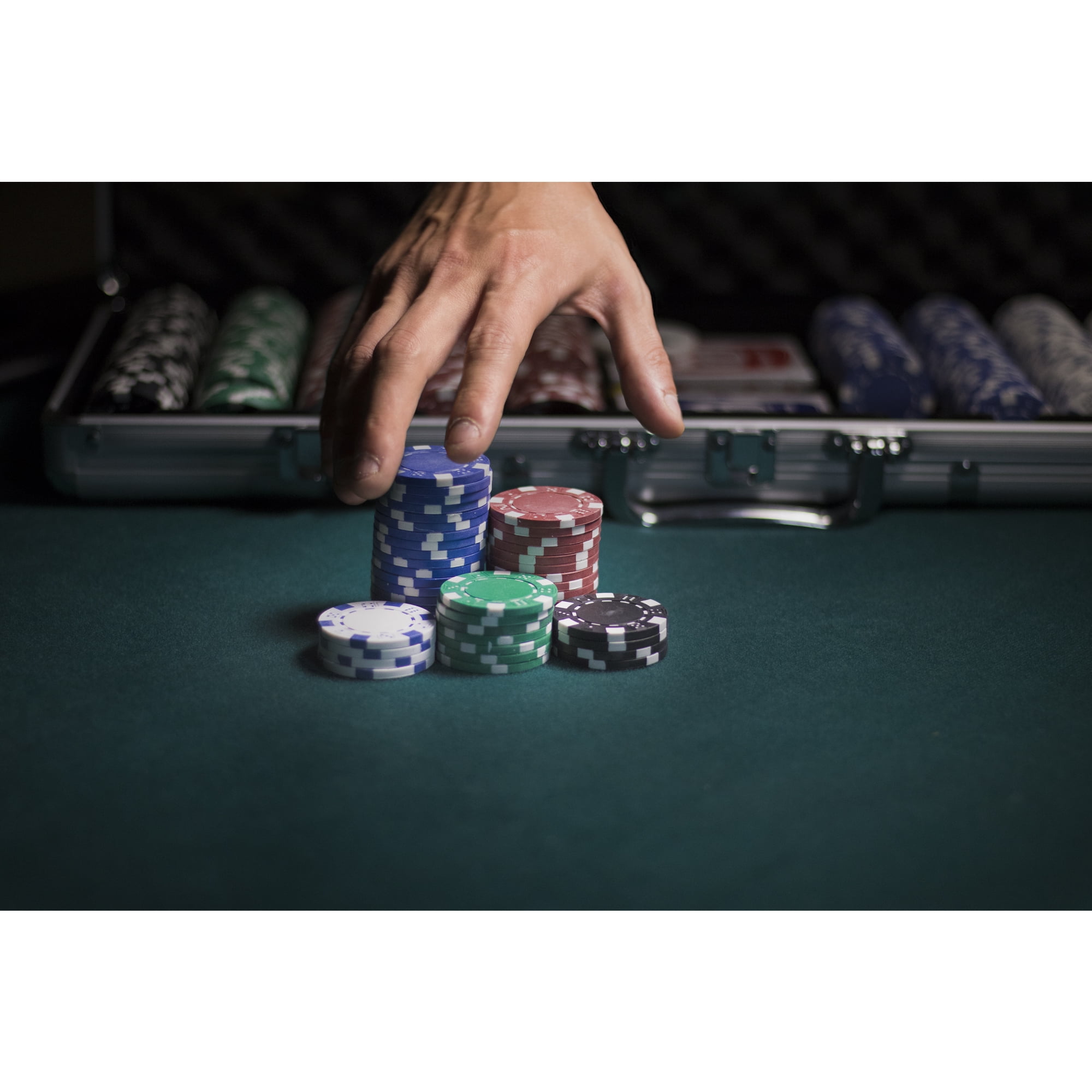 Complete set of 500, 11.5g Claytec, striped poker chips of a wide range of colors. Two decks of standard playing cards are included for quick games ready to play out of the box. Includes all the accessories to host an official game: a full set of Big Blind, Little Blind, and Dealer buttons. Housed in a tough aluminum case with foam cushioning inserts to protect your chips from impacts and elements alike. Include a full set of poker dice for a change of pace – a fast paced game that is growing in popularity.
