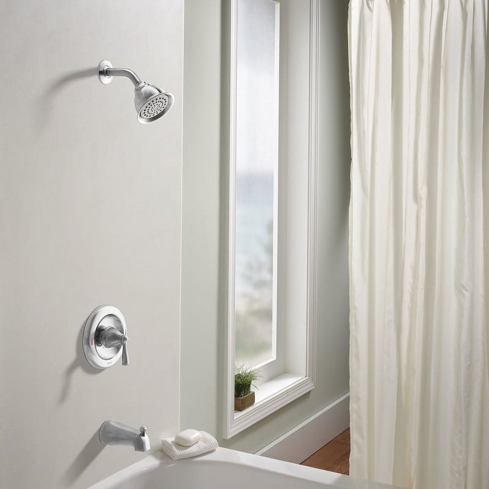 Lever handle makes it easy to adjust the water Equipped with the PosiTemp pressure balancing control valve to help maintain water temperature in the shower 4-3/8″ diameter spray head Moenflo xl single function provides wider water coverage than standard shower heads Meets EPA WaterSense(r) criteria to conserve water without sacrificing performance. Complies with Americans with Disabilities Act (ADA) specifications. Limited lifetime warranty