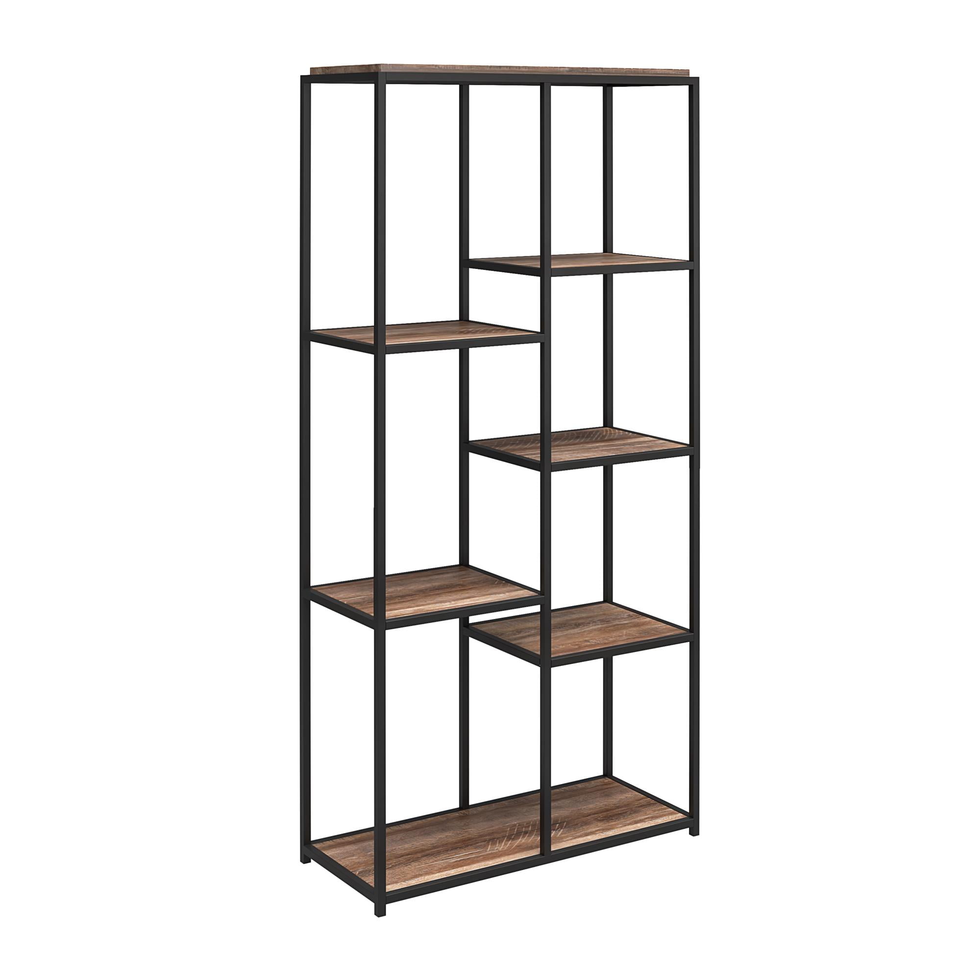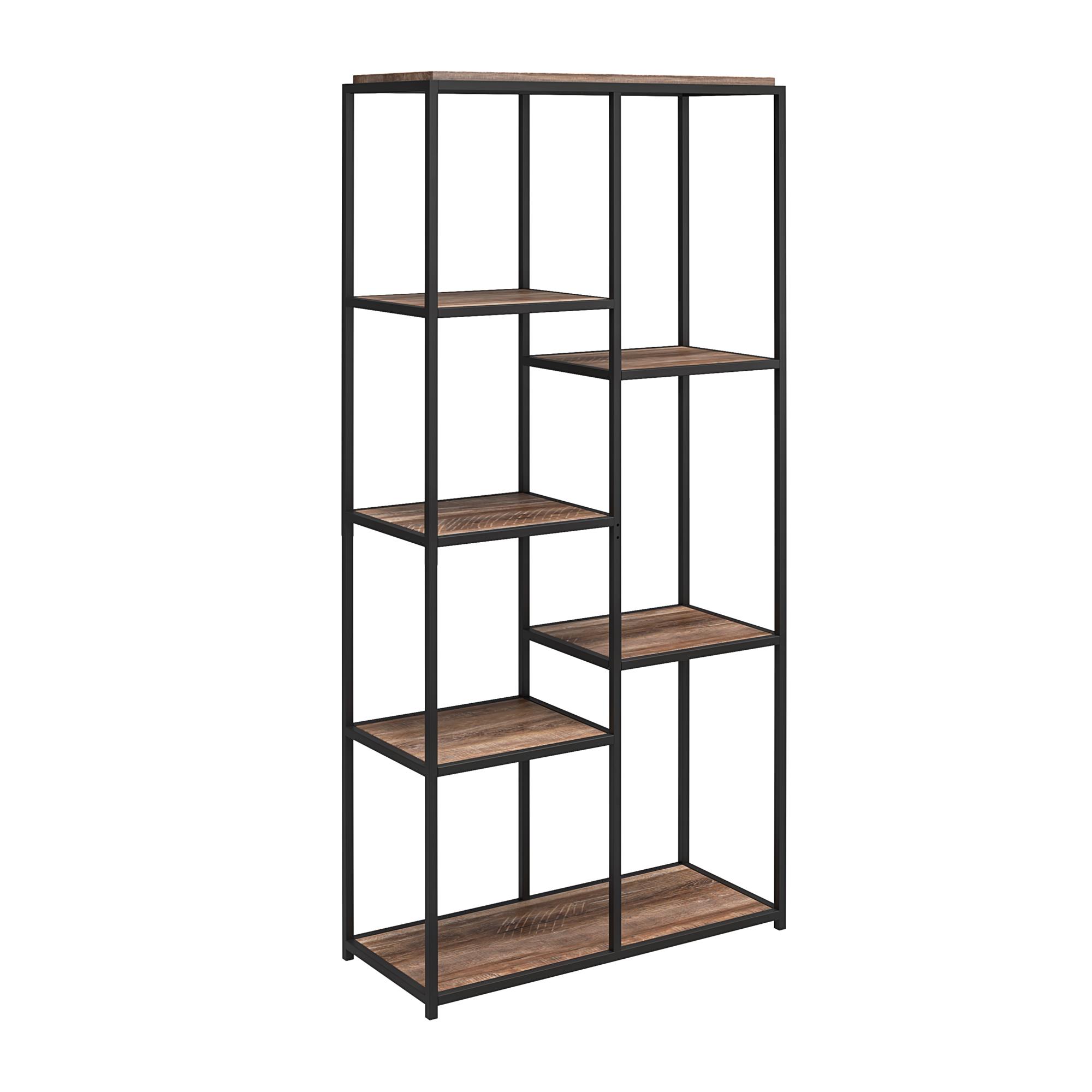 MODERN BOOKCASE: Display your favorite books and memorabilia with the ultra-modern 5-Shelf Bookcase from Ameriwood Home Fayette collection STATEMENT PIECE: Crafted from laminated engineered wood with a sturdy metal frame, this bookcase features a woodgrain finish for a stunning statement in your space AMPLE DISPLAY SPACE: Five open shelves offer plenty of room to showcase books, decorations, and collectibles, while the asymmetrical design adds a unique and stylish touch to your space SAFETY AND WARRANTY: Included wall anchor kit prevents tipping injuries, while a 1-year limited warranty provides peace of mind